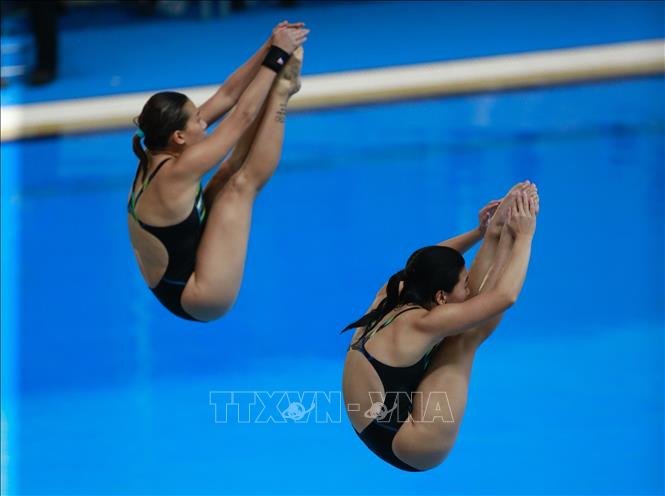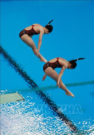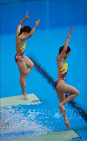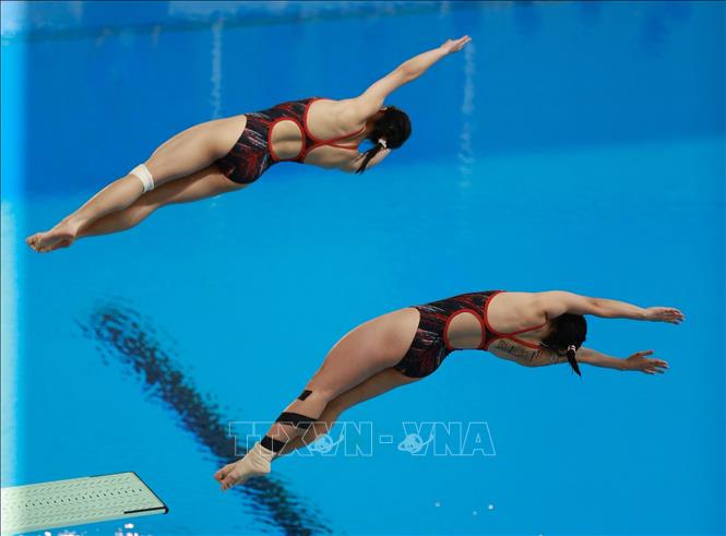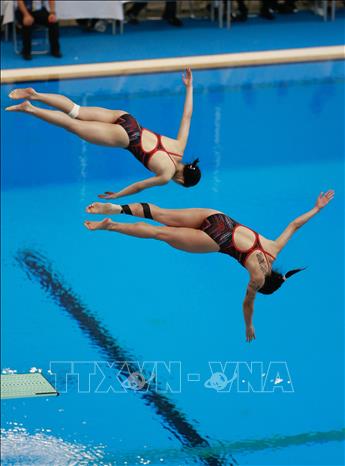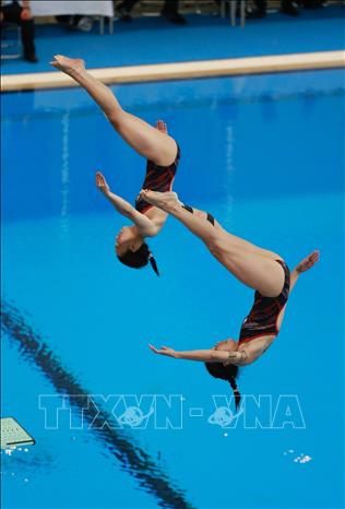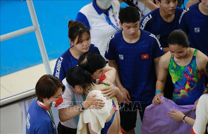Chiều 9/5/2022, tại Cung thể thao dưới nước (Hà Nội), môn Nhảy cầu tại SEA Games 31 tiếp tục diễn ra với phần thi đấu nội dung cầu mềm 3m đôi nữ. Cặp vận động viên Việt Nam là Ngô Phương Mai và Mai Hồng Hạnh đã xuất sắc giành tấm huy chương Bạc cho Đoàn thể thao Việt Nam. Ảnh: Trọng Đạt-TTXVN