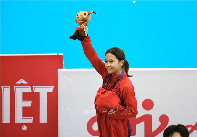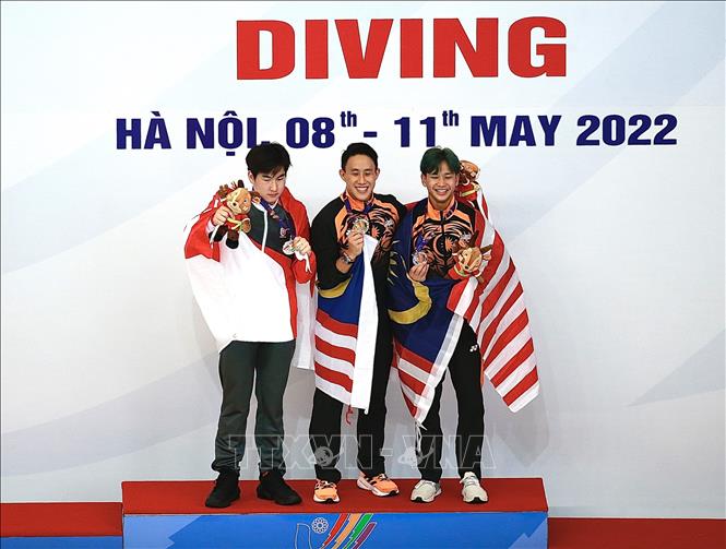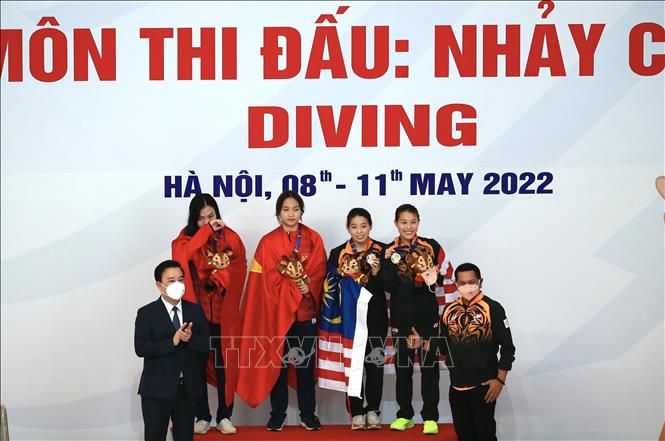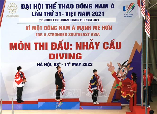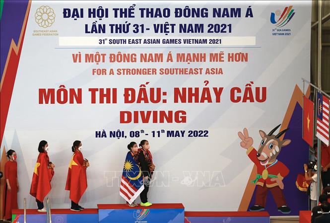 Chiều 9/5/2022, tại Cung thể thao dưới nước (Hà Nội) diễn ra Lễ trao huy chương cho các vận động viên môn Nhảy cầu thi đấu 2 nội dung nhảy cầu mềm 1m đơn nam và nhảy cầu mềm 3m đôi nữ tại SEA Games 31. Ảnh: Trọng Đạt-TTXVN