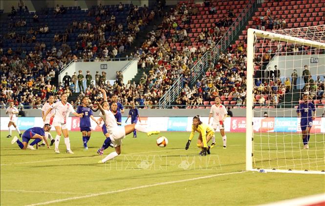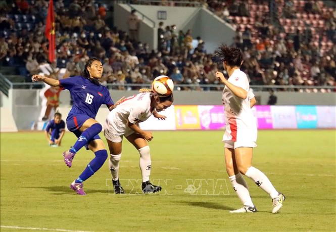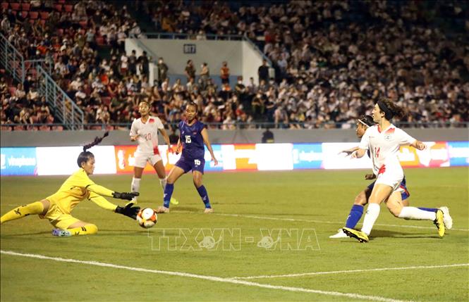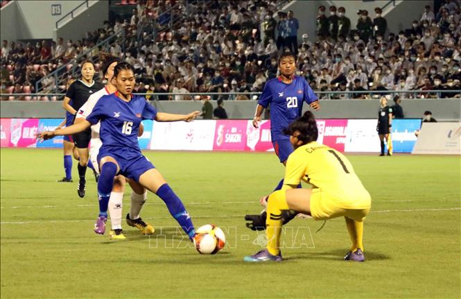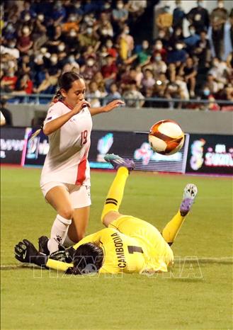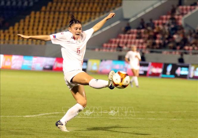 Tối 9/5/2022, trên sân vận động Cẩm Phả, tỉnh Quảng Ninh diễn ra trận đấu đầu tiên của môn Bóng đá nữ tại SEA Games 31 giữa 2 đội tuyển Philippines (áo trắng) và Campuchia (áo xanh). Kết quả, nữ Philippines giành chiến thắng áp đảo với tỷ số 5 - 0. Ảnh: Anh Tuấn – TTXVN
