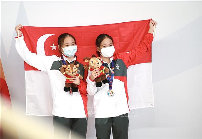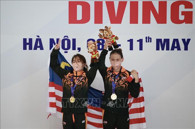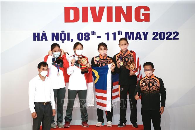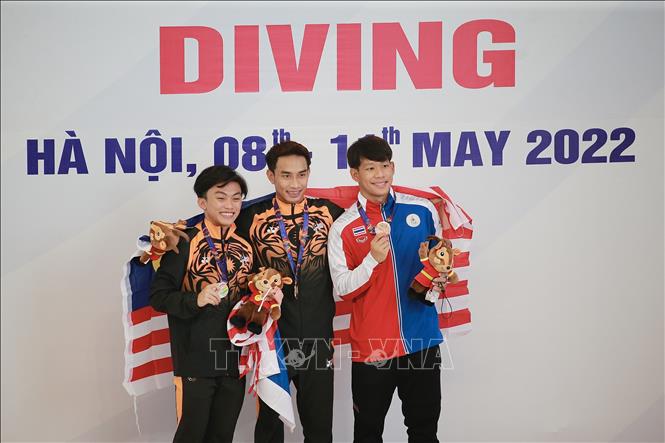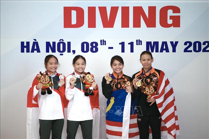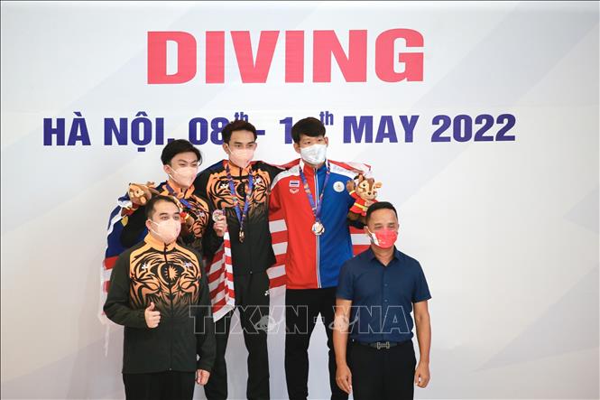 Chiều 11/5/2022, tại Cung thể thao dưới nước Mỹ Đình (Hà Nội) diễn ra Lễ trao huy chương cho các vận động viên thi đấu môn Nhảy cầu nội dung Đơn nam cầu mềm 3m và Đôi nữ cầu cứng 10m. Ảnh: Trọng Đạt-TTXVN