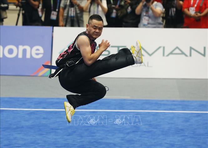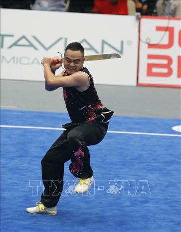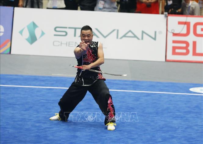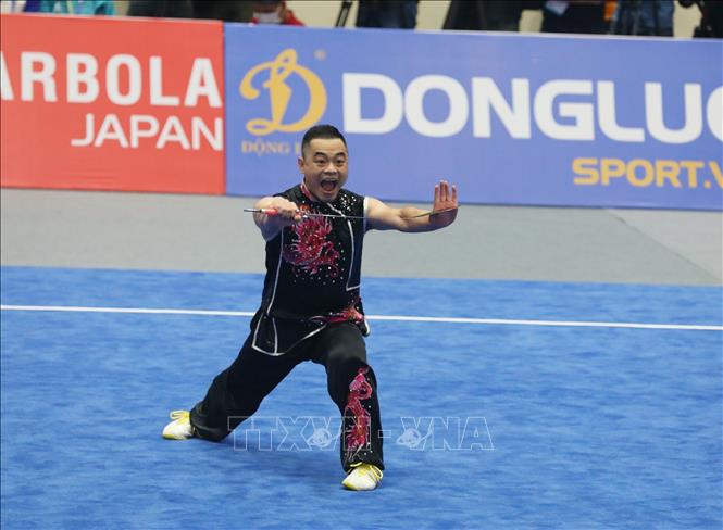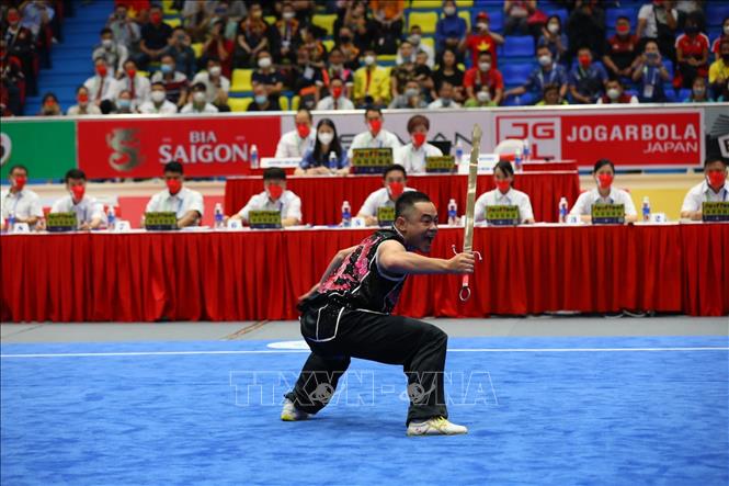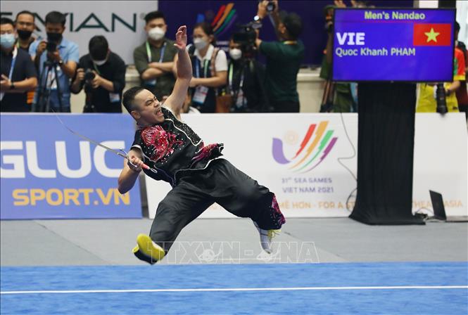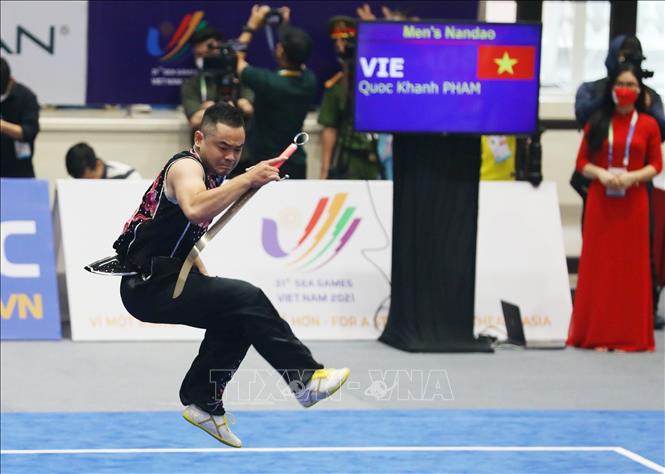 Sáng 13/5/2022, tại Nhà thi đấu Cầu Giấy (Hà Nội), đội tuyển Wushu Việt Nam ra quân thi đấu tại SEA Games 31 ở các nội dung biểu diễn (Taolu) và liên tiếp giành 2 tấm huy chương Vàng. Ngay sau khi Dương Thúy Vi giành HCV ở nội dung Kiếm thuật nữ, đến lượt Phạm Quốc Khánh mang về tấm HCV thứ hai ở nội dung Nam đao nam. Ảnh: Phạm Hậu - TTXVN