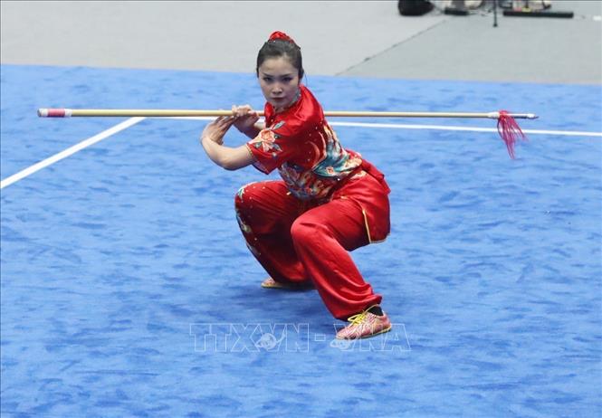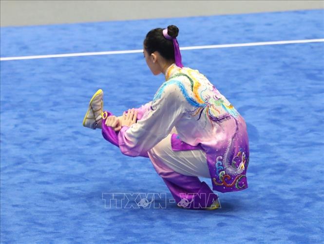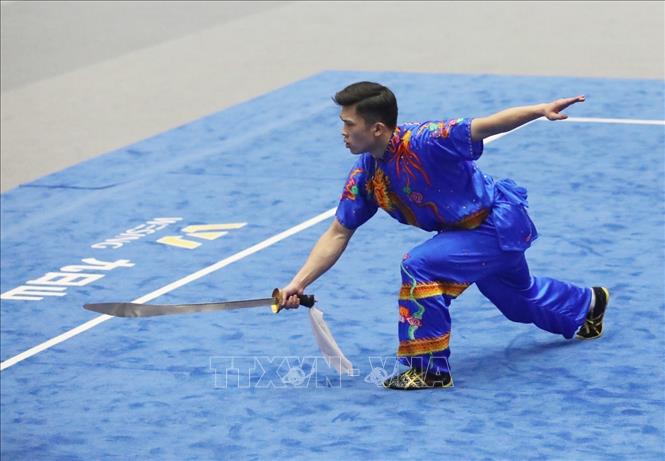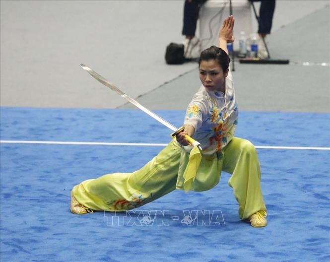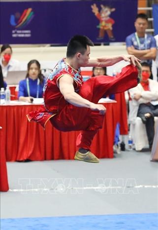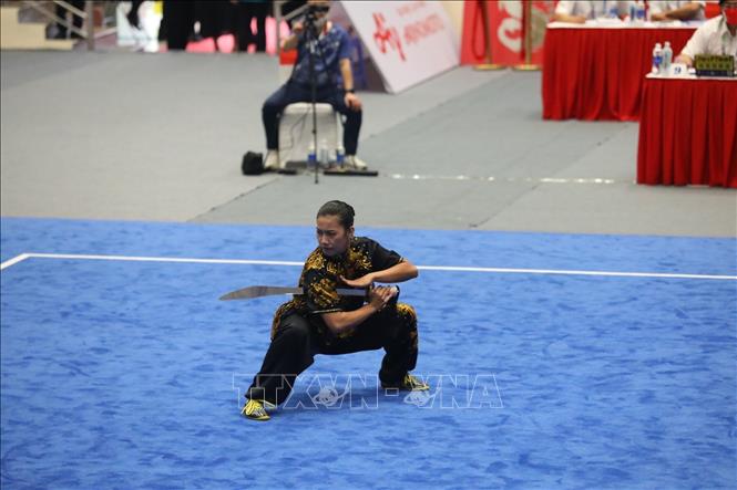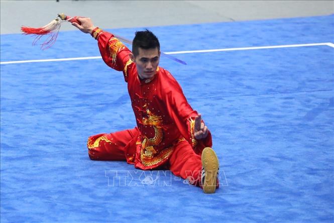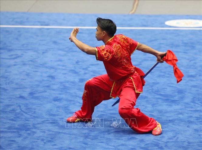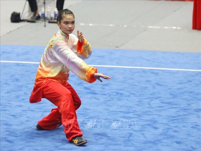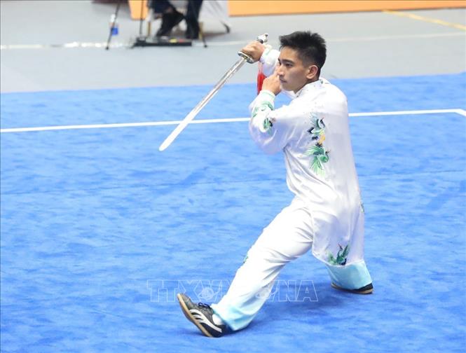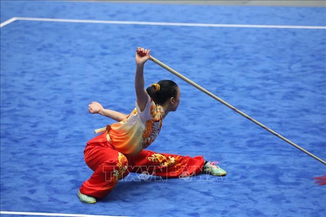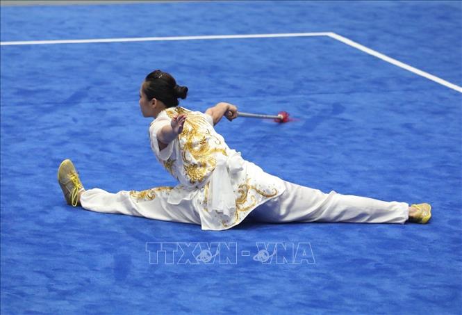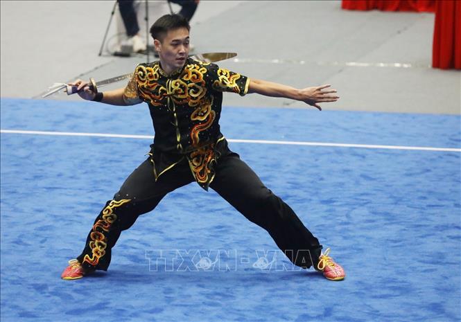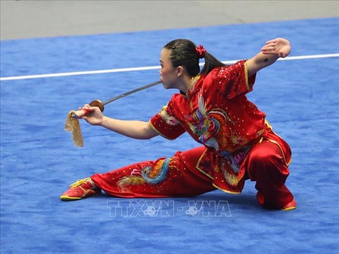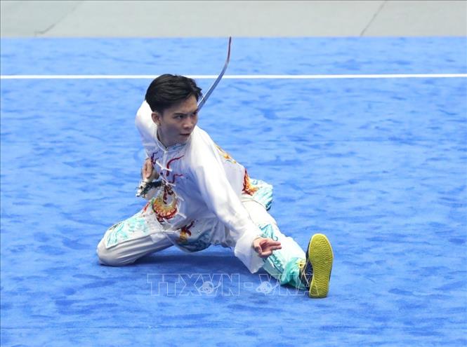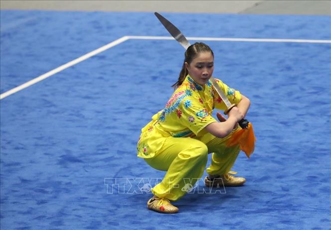 Sáng 14/5/2022, tại Nhà thi đấu Cầu Giấy (Hà Nội), môn Wushu tại SEA Games 31 bước sang ngày thi đấu thứ hai với các nội dung thi Quyền biểu diễn (Taolu), gồm: Nam quyền nam, Thái cực kiếm nam, Đao thuật nam, Thương thuật nữ, Thái cực quyền nữ, Đao thuật nữ. Ảnh: TTXVN