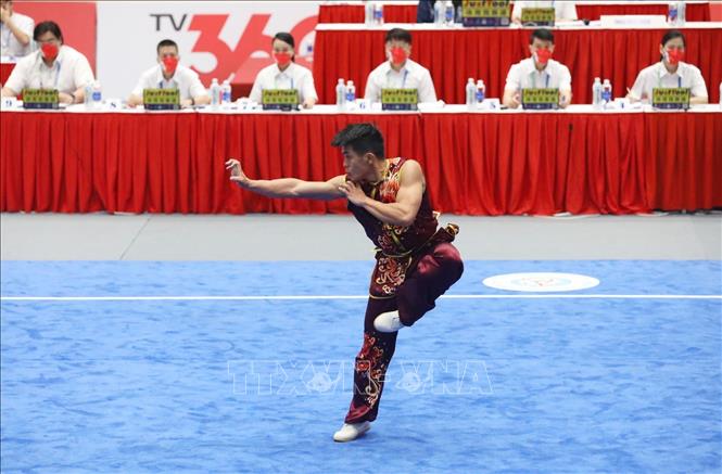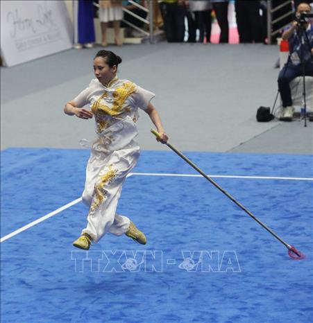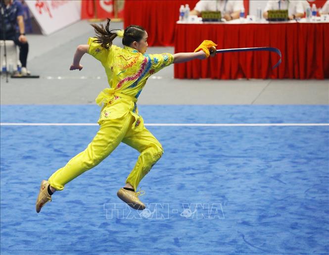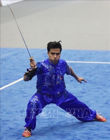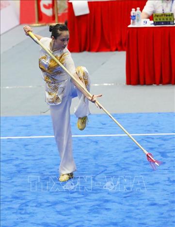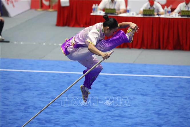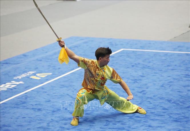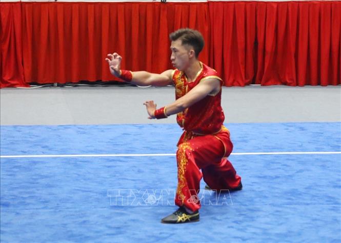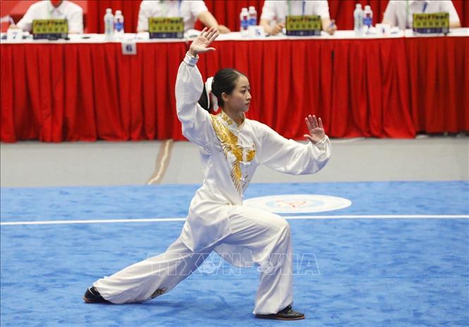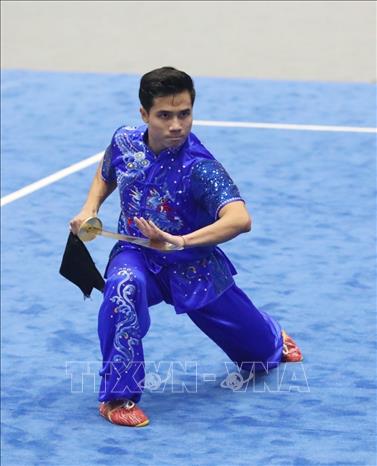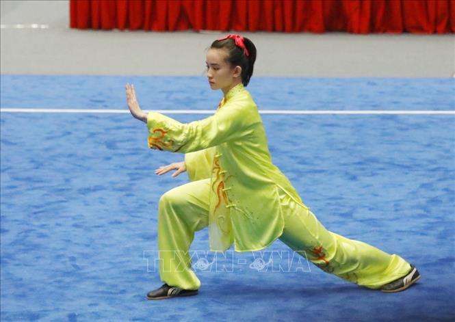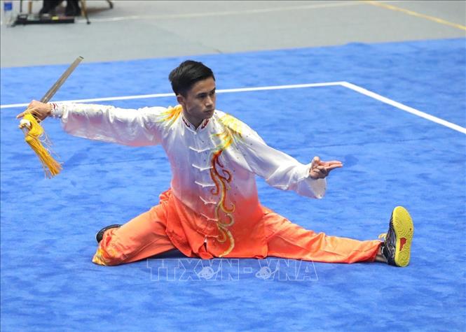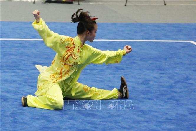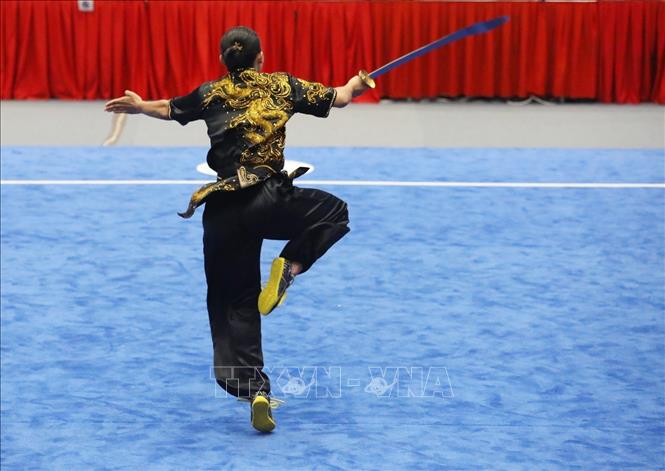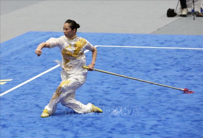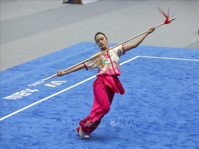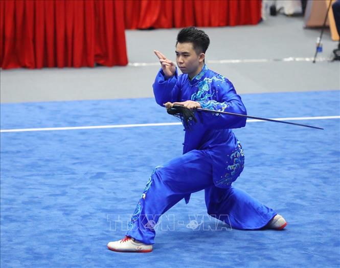 Sáng 14/5/2022, tại Nhà thi đấu Cầu Giấy (Hà Nội), môn Wushu tại SEA Games 31 bước sang ngày thi đấu thứ hai với các nội dung thi Quyền biểu diễn (Taolu), gồm: Nam quyền nam, Thái cực kiếm nam, Đao thuật nam, Thương thuật nữ, Thái cực quyền nữ, Đao thuật nữ. Ảnh: TTXVN