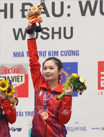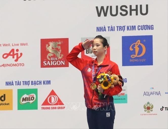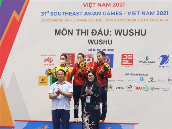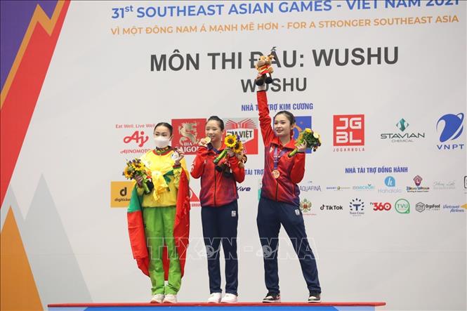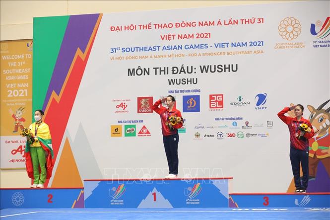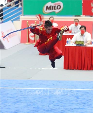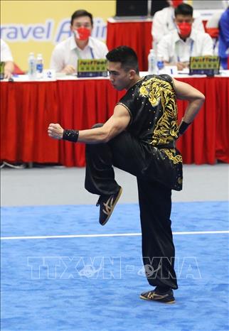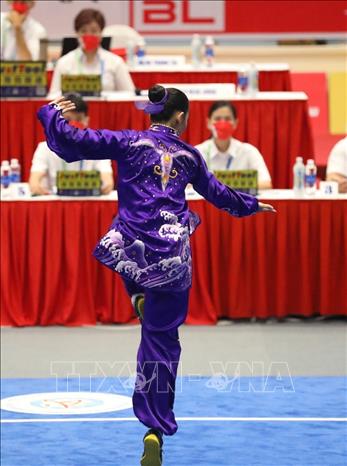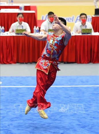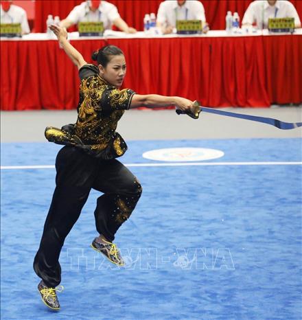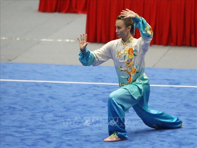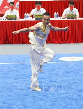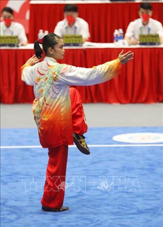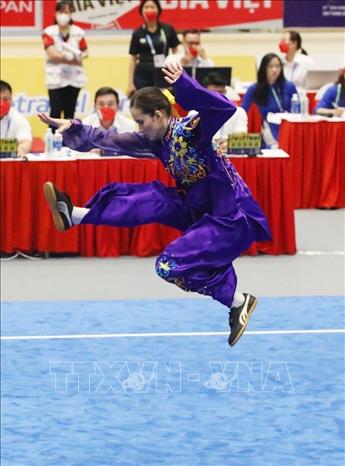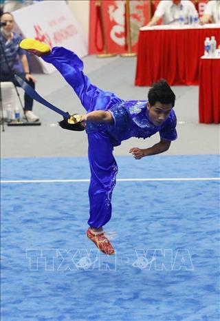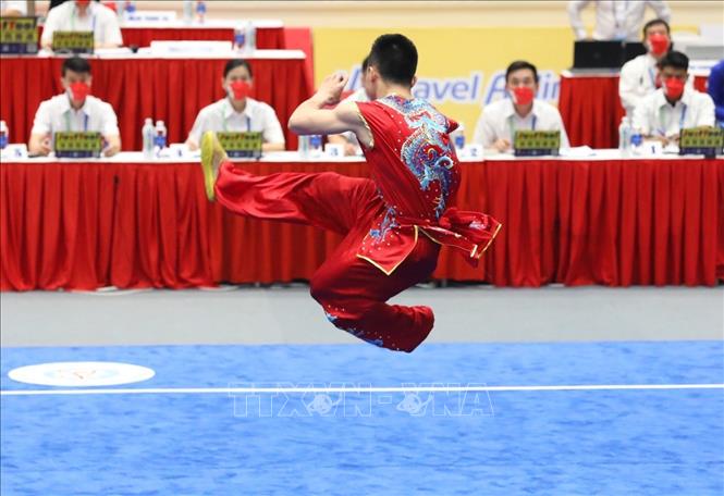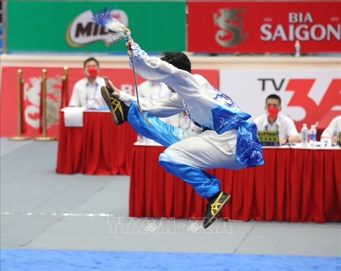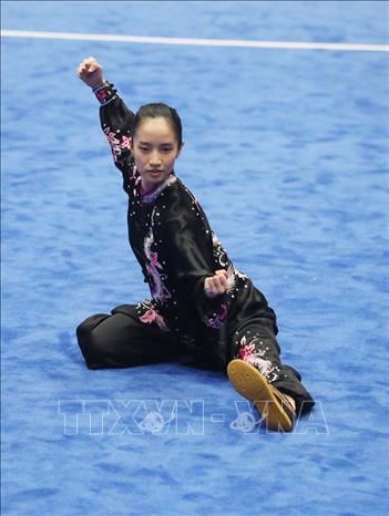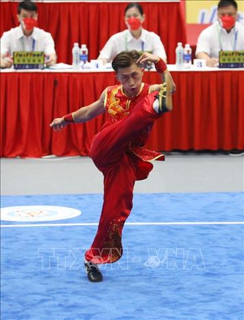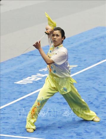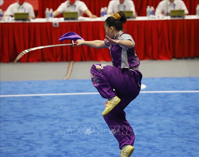 Sáng 14/5/2022, tại Nhà thi đấu Cầu Giấy (Hà Nội), môn Wushu tại SEA Games 31 bước sang ngày thi đấu thứ hai với các nội dung thi Quyền biểu diễn (Taolu), gồm: Nam quyền nam, Thái cực kiếm nam, Đao thuật nam, Thương thuật nữ, Thái cực quyền nữ, Đao thuật nữ. Ảnh: TTXVN