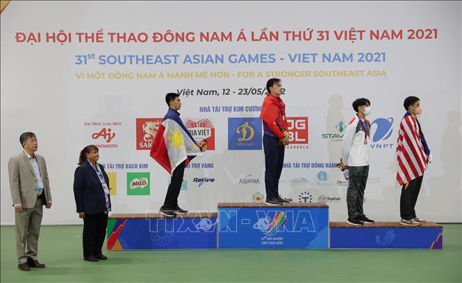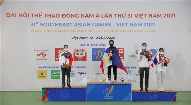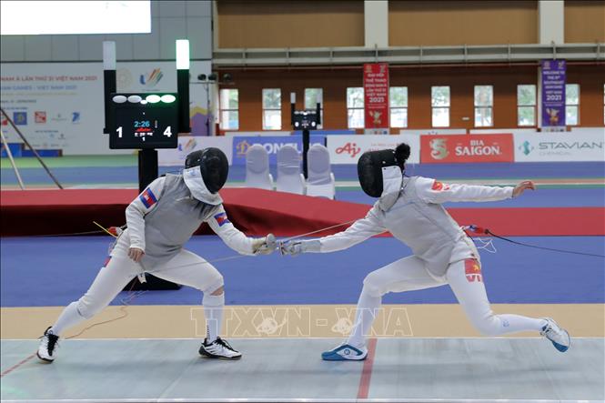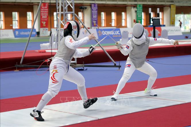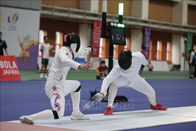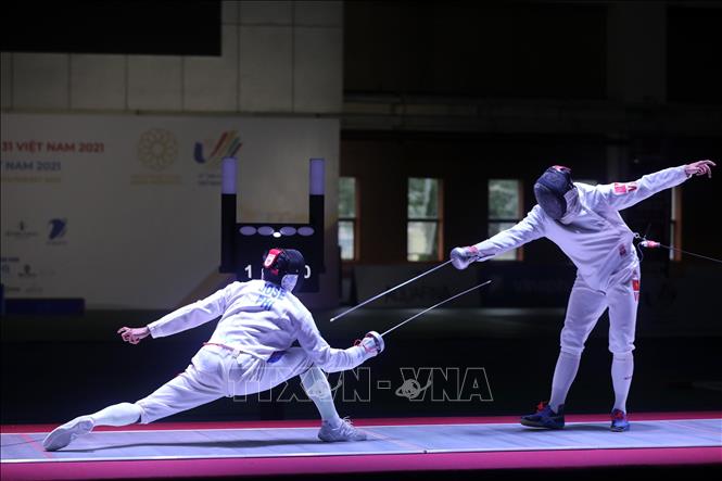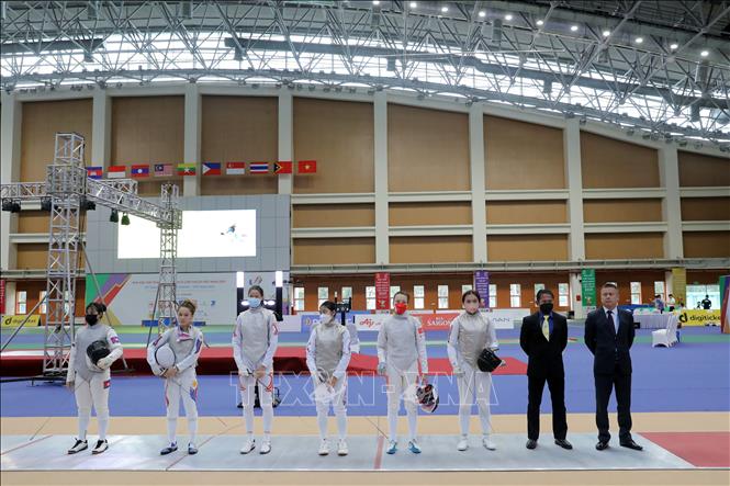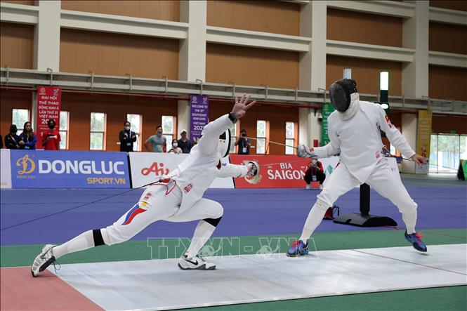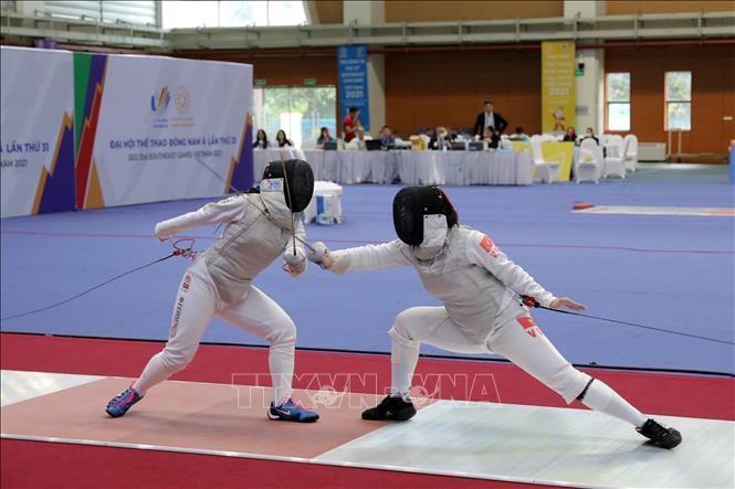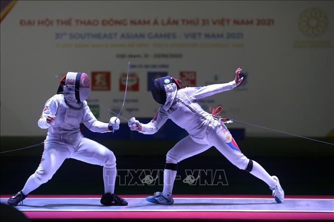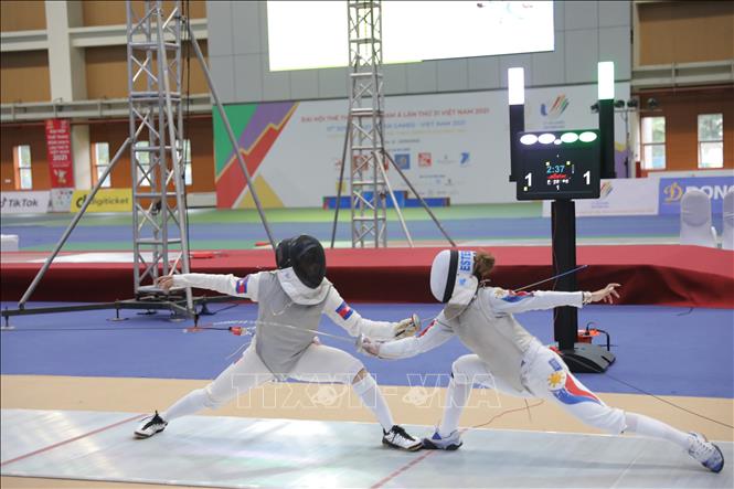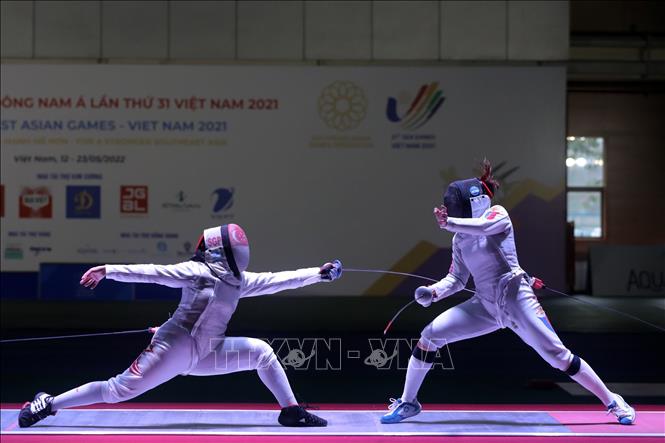 Ngày 14/5/2022, tại Cung Điền kinh trong nhà (Hà Nội), diễn ra môn Đấu kiếm tại SEA Games 31 vòng chung kết và trao huy chương ở các nội dung: Nam cá nhân kiếm ba cạnh, Nữ cá nhân kiếm liễu. Ảnh: TTXVN