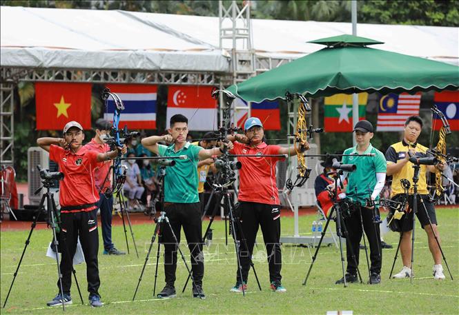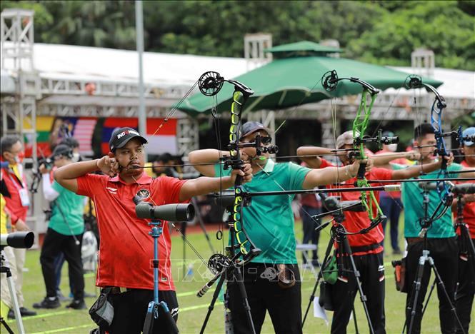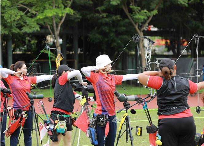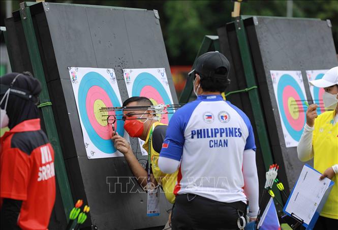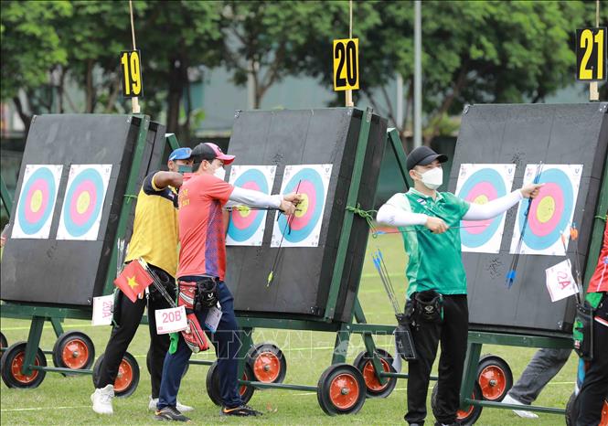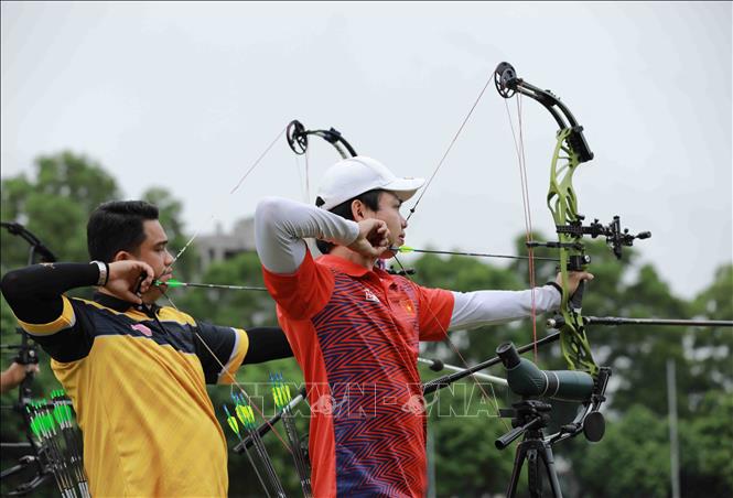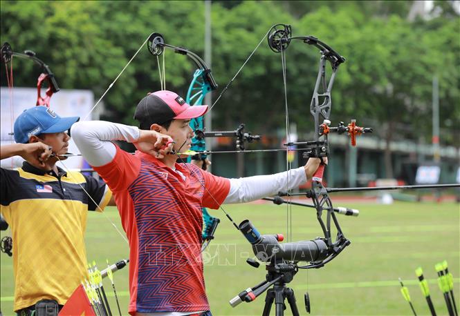 Chiều 15/5/2022, tại Trung tâm Huấn luyện thể thao Quốc gia Hà Nội, môn Bắn cung tại SEA Games 31 tiếp tục với nội dung cung 3 dây. Ảnh: Vũ Sinh – TTXVN
