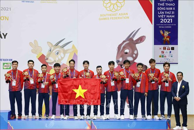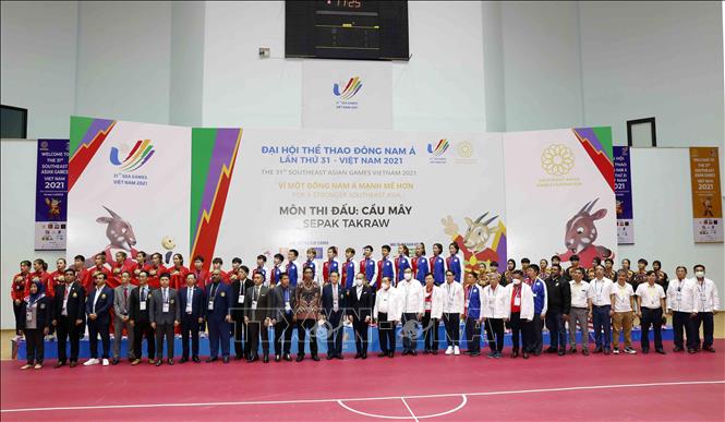 Chiều 15/5/2022, tại nhà thi đấu quận Hoàng Mai, Hà Nội diễn ra lễ trao huy chương cho các đội tuyển môn Cầu mây, nội dung đồng đội Regu nam, nữ. Ở nội dung Regu nam: Thái Lan đoạt HCV, Malaysia đoạt HCB, Việt Nam đoạt HCĐ. Ở nội dung nữ: Thái Lan đoạt HCV, Việt Nam đoạt HCB, Malaysia đoạt HCĐ. Ảnh: Trần Việt – TTXVN