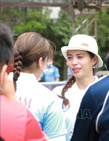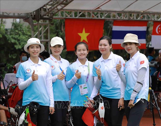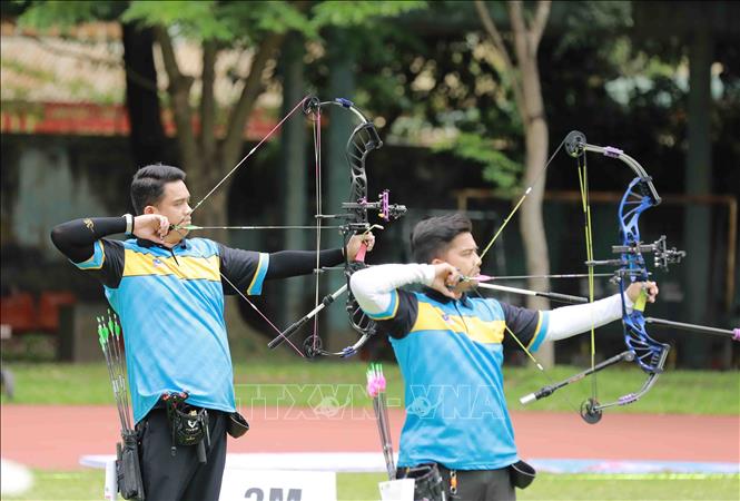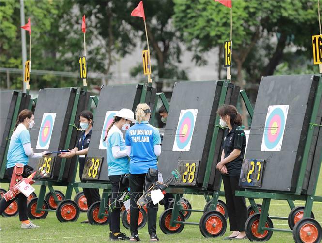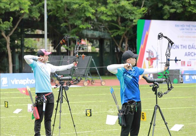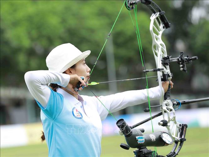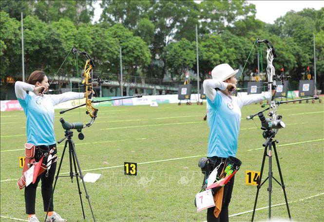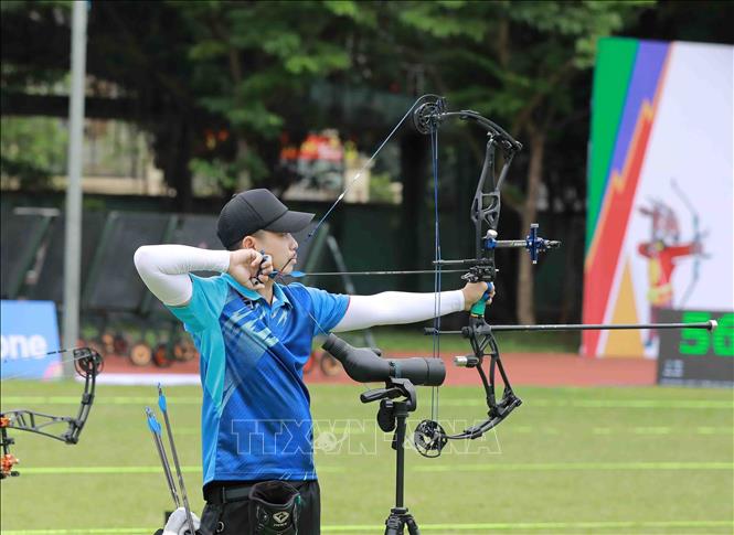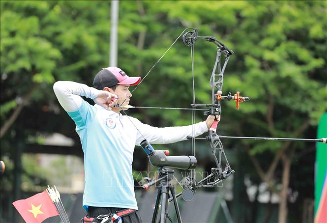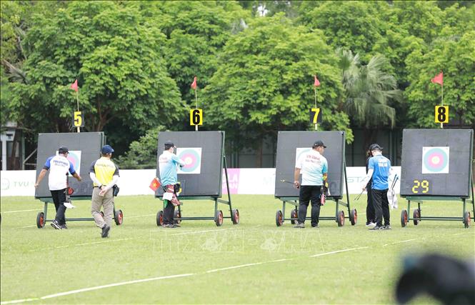 Sáng 16/5/2022, tại Trung tâm Huấn luyện thể thao Quốc gia Hà Nội diễn ra các vòng thi đấu 1/8, vòng thi đấu tứ kết và vòng thi đấu bán kết môn Bắn cung, nội dung cung 3 dây cá nhân nam, nữ. Ảnh: Vũ Sinh - TTXVN