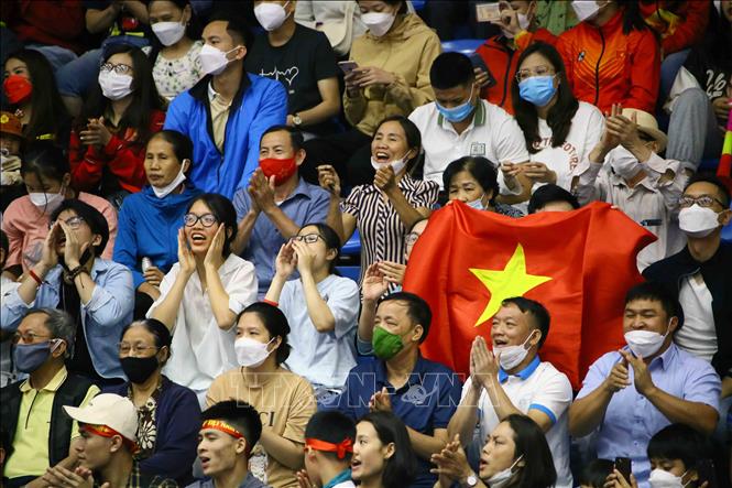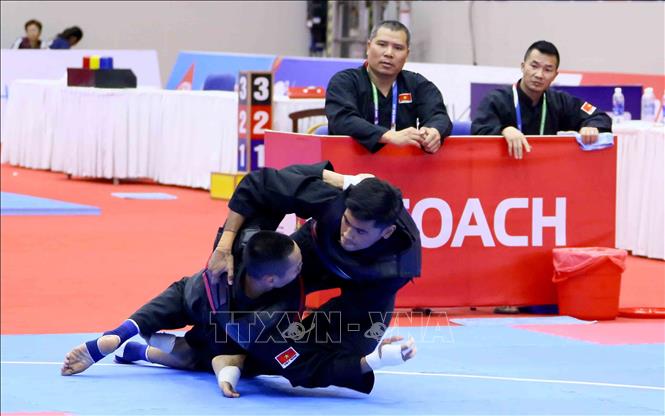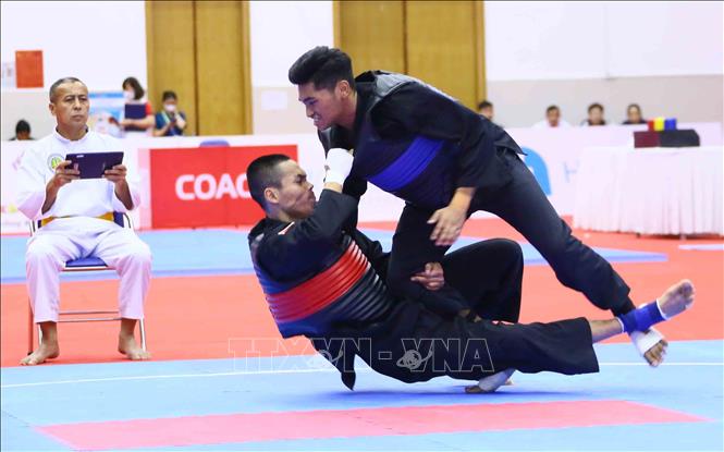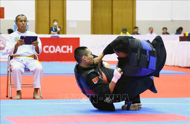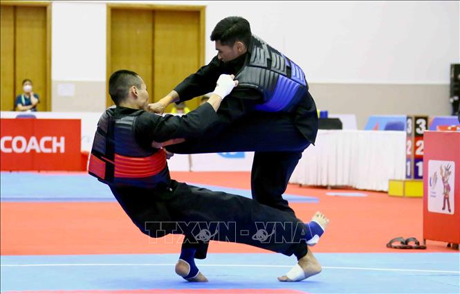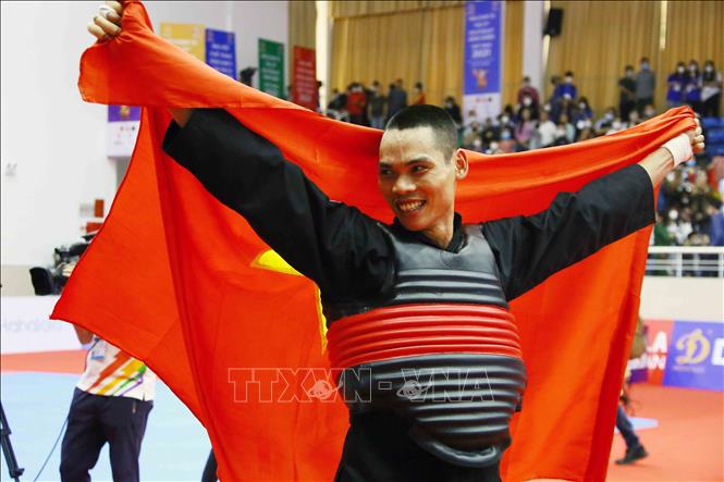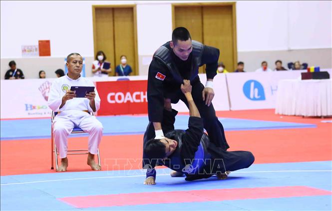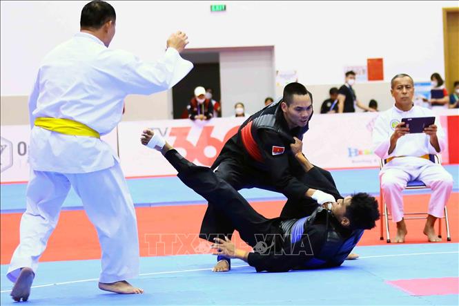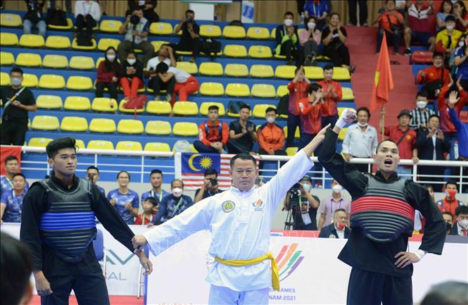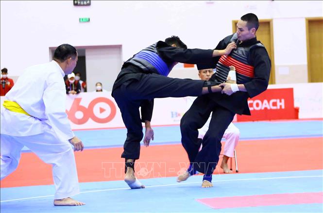 Sáng 16/5/2022, tại Nhà thi đấu Bắc Từ Liêm (Hà Nội), VĐV Trần Đình Nam (Việt Nam-đỏ) thắng cách biệt VĐV Abdun Raazaq Bin Abdul Rashid (Singapore-xanh) ở chung kết hạng cân 70kg-75kg môn Pencak Silat tại SEA với tỷ số 42-14, mang về tấm HCV thứ 2 nội dung đối kháng cho đội tuyển Pencak Silat Việt Nam. Ảnh: Quang Quyết-TTXVN