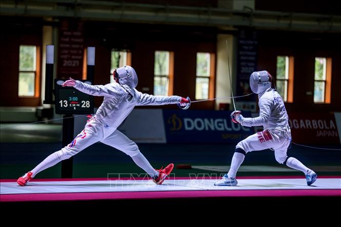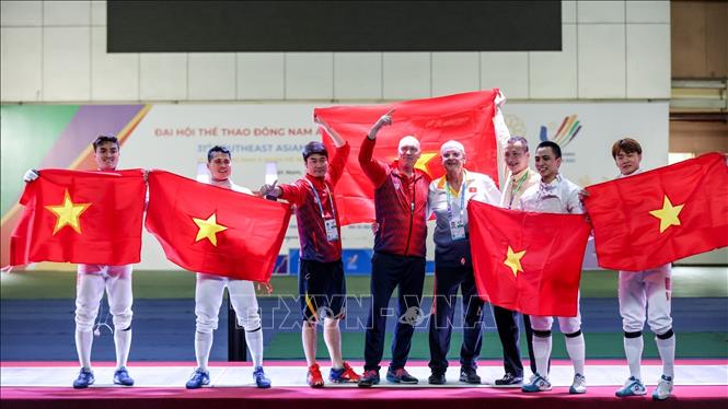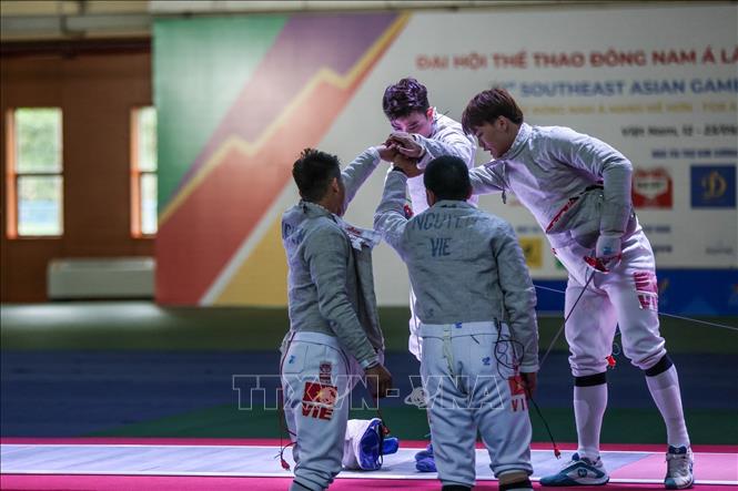 Ngày 16/5/2022, tại Cung thể thao Điền kinh trong nhà (Hà Nội) diễn ra trận chung kết nội dung đồng đội nam kiếm chém của bộ môn Đấu kiếm tại SEA Games 31 giữa 4 tuyển thủ Việt Nam và Thái Lan. Chiến thắng với tỷ số áp đảo 45-28, Vũ Thành An cùng đồng đội đã giành tấm huy chương Vàng thứ 4 cho tuyển Đấu kiếm Việt Nam. Ảnh: Minh Sơn-TTXVN