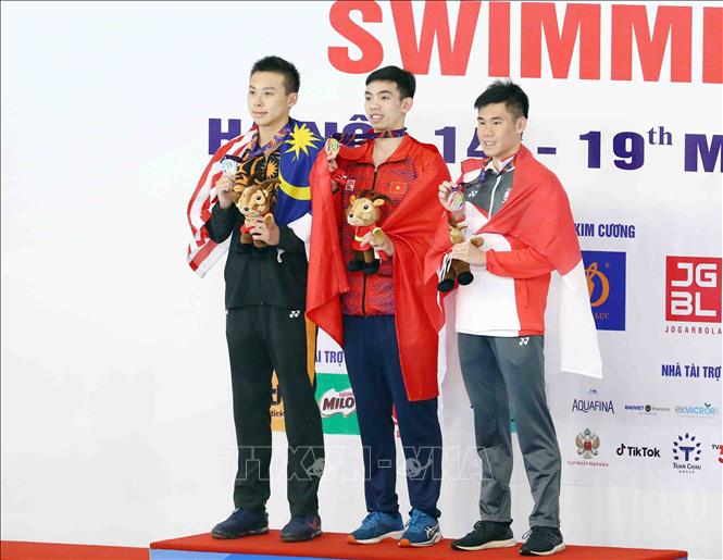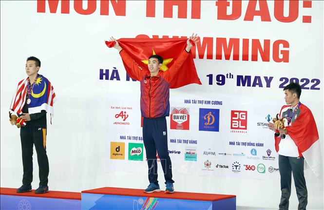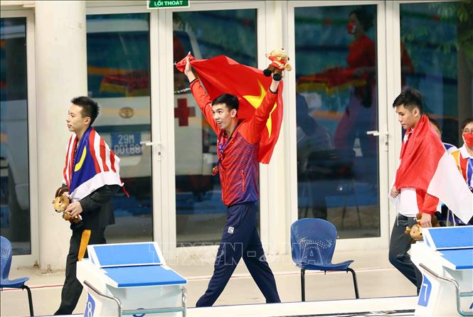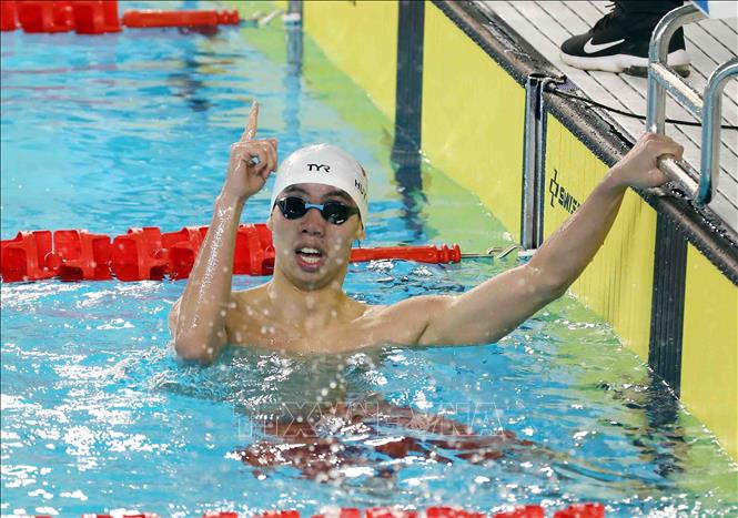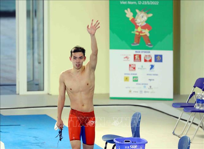 Ngày 16/5/2022, tại Cung thể thao dưới nước (Hà Nội), VĐV Nguyễn Huy Hoàng (Việt Nam) giành huy chương Vàng tại SEA Games 31 và phá kỷ lục SEA Games nội dung 400m bơi tự do nam với thành tích 3 phút 48 giây 06. Ảnh: Phạm Kiên - TTXVN