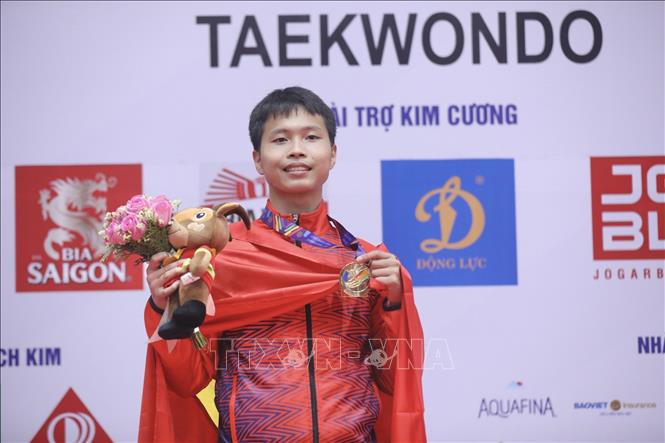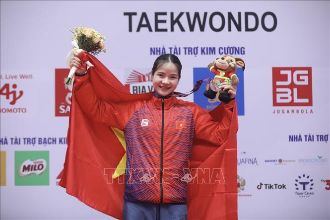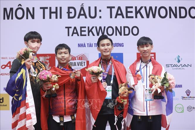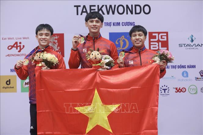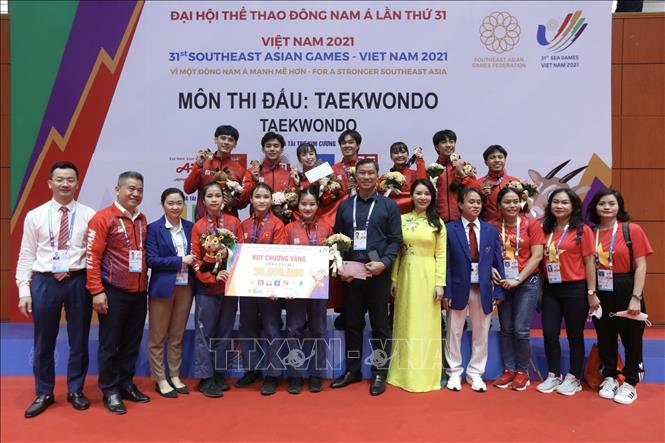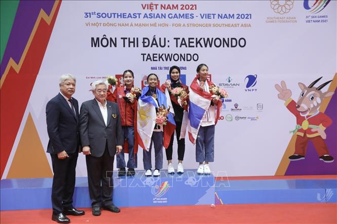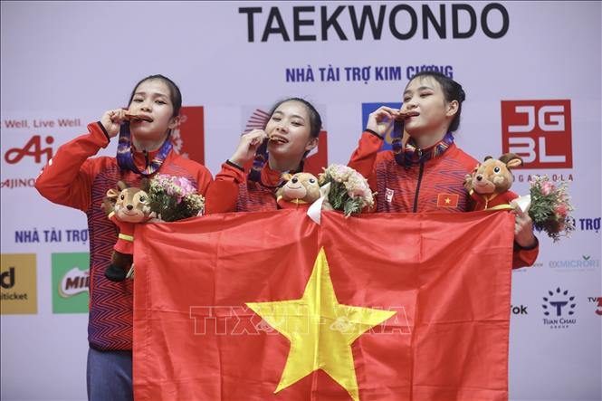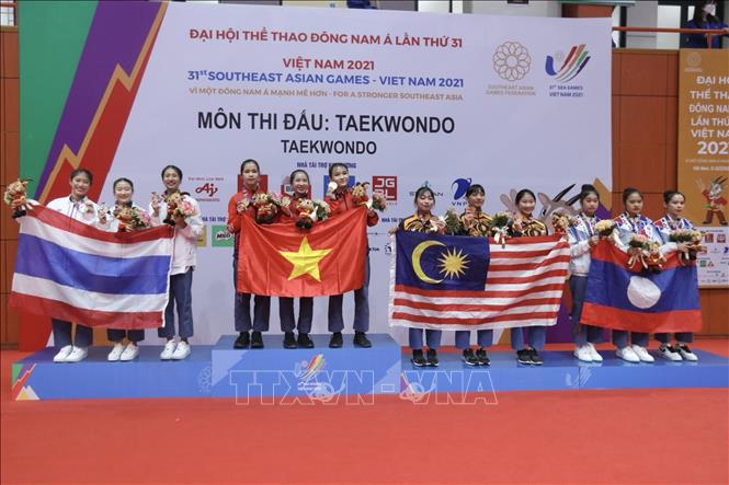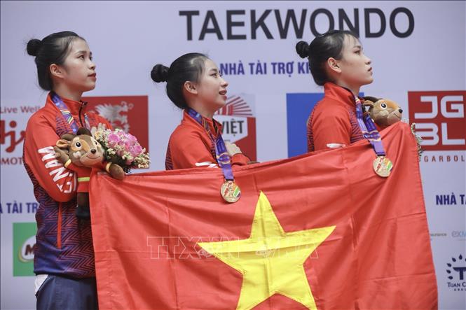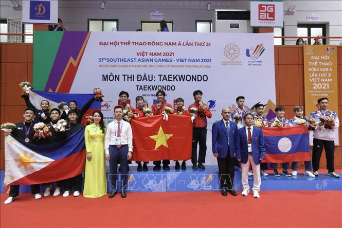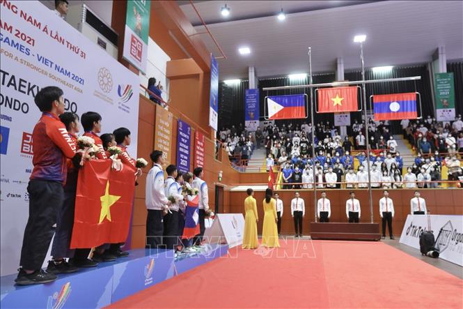 Chiều 16/5/2022, tại Nhà thi đấu quận Tây Hồ (Hà Nội) diễn ra Lễ trao huy chương cho các vận động viên thi đấu các nội dung biểu diễn của môn Taekwondo tại SEA Games 31, gồm: Quyền sáng tạo đồng đội; Quyền cá nhân nam, nữ; Quyền đồng đội nam, nữ. Các vận động viên của Việt Nam xuất sắc giành 4 huy chương Vàng và 1 huy chương Bạc trong tổng số 5 nội dung thi đấu ngày đầu ra quân. Ảnh: Minh Quyết - TTXVN