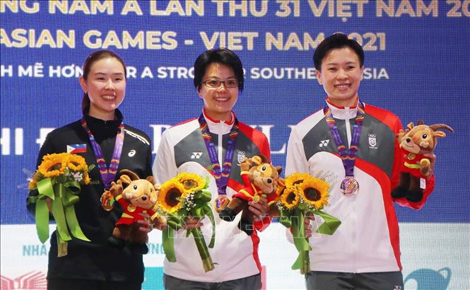 Ngày 16/5/2022 - ngày thi đấu thứ nhất môn Bowling tại SEA Games 31, VĐV Merwin Matheiu Tan của Philippines giành HCV đơn nam với 1292 điểm; VĐV Cherie Tan Shi Hua của Singapore đạt 1236 điểm giành HCV nội dung đơn nữ (dầu ngắn). Ảnh: Trung Kiên - TTXVN
