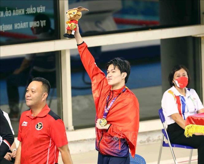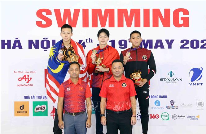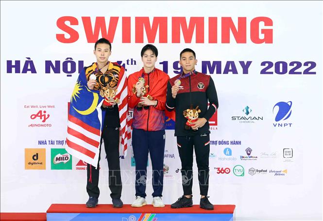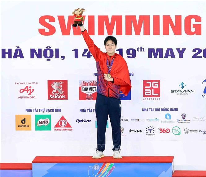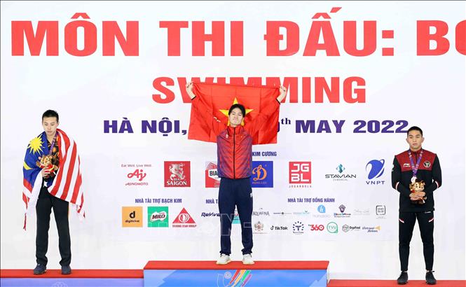 Ngày 16/5/2022, tại Cung thể thao dưới nước (Hà Nội), VĐV Trần Hưng Nguyên (Việt Nam) xuất sắc giành HCV nội dung 200m bơi ngửa nam với thành tích 2 phút 01 giây 58. Ảnh: Phạm Kiên - TTXVN