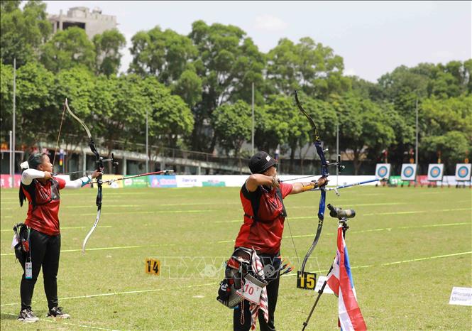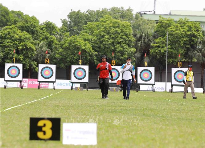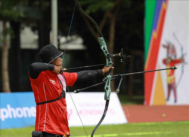 Sáng 17/5/2022, tại Trung tâm Huấn luyện thể thao Quốc gia Hà Nội, diễn ra vòng thi đấu chung kết môn bắn cung 1 dây cá nhân nam, nữ. Ảnh: Vũ Sinh - TTXVN