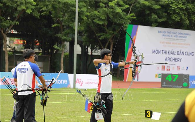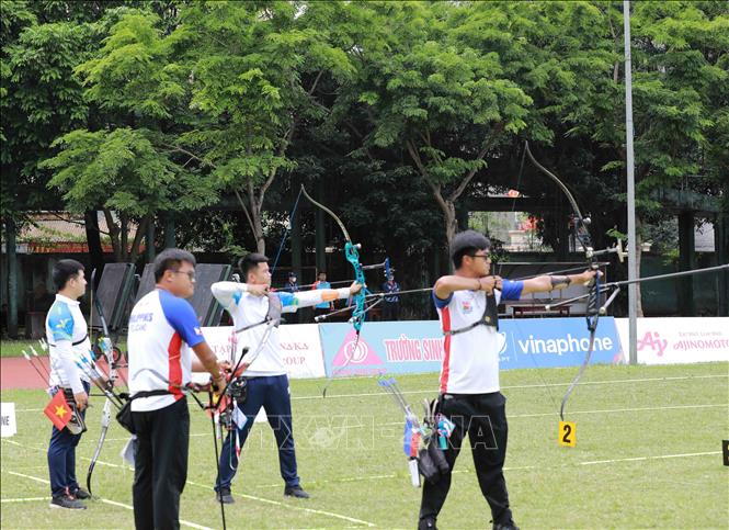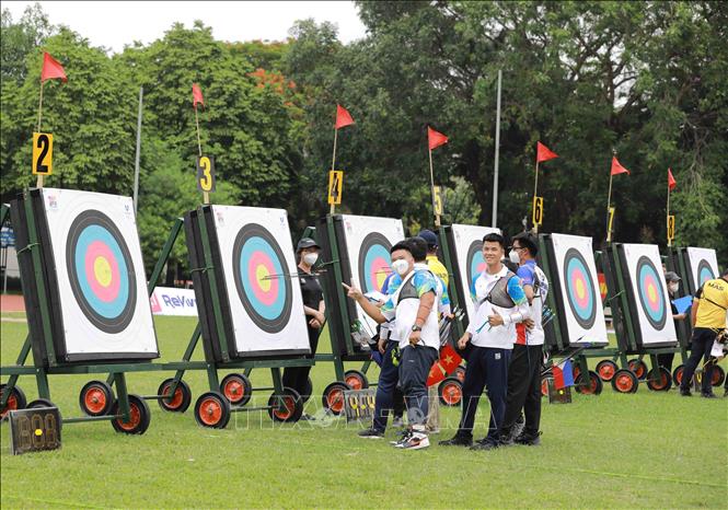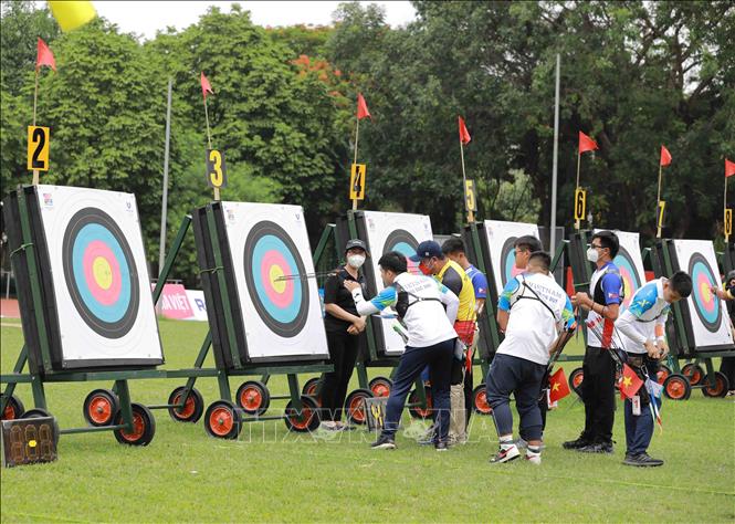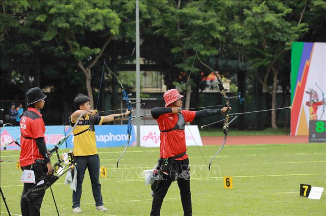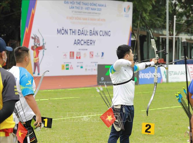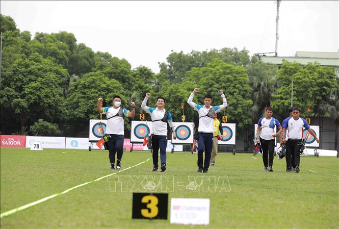 Chiều 17/5/2022, tại Trung tâm Huấn luyện thể thao Quốc gia Hà Nội diễn ra vòng đấu loại và bán kết nội dung cung 1 dây đồng đội nam của môn Bắn cung tại SEA Games 31. Đội tuyển Việt Nam đã giành quyền vào chung kết nội dung thi đấu này. Ảnh: Vũ Sinh - TTXVN