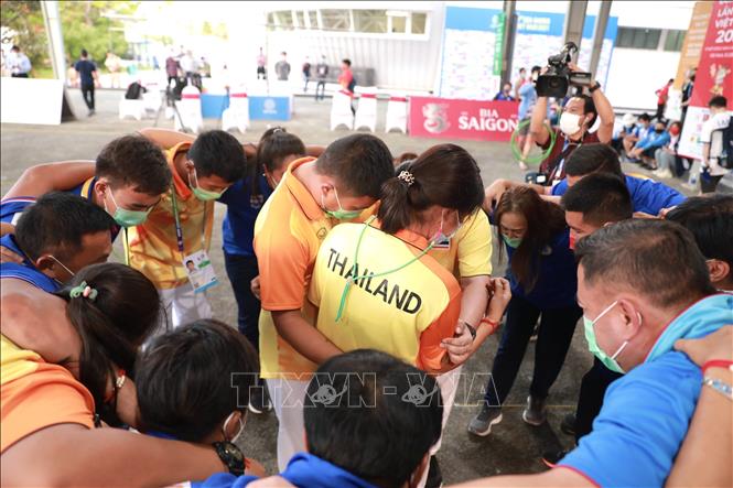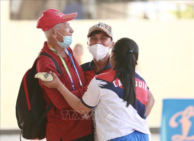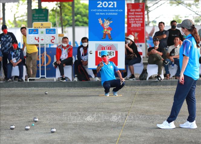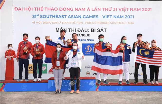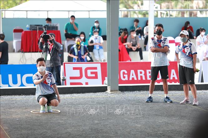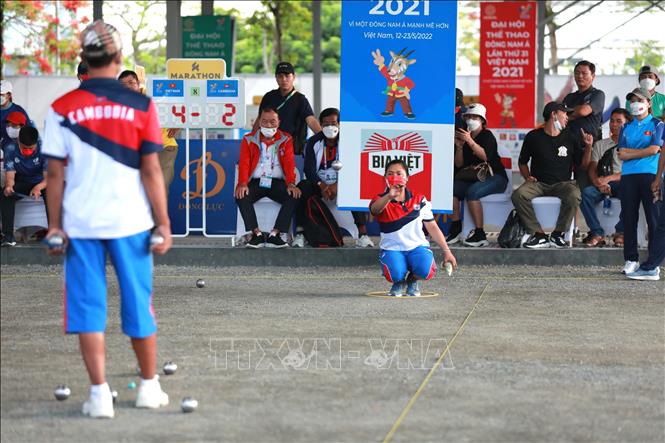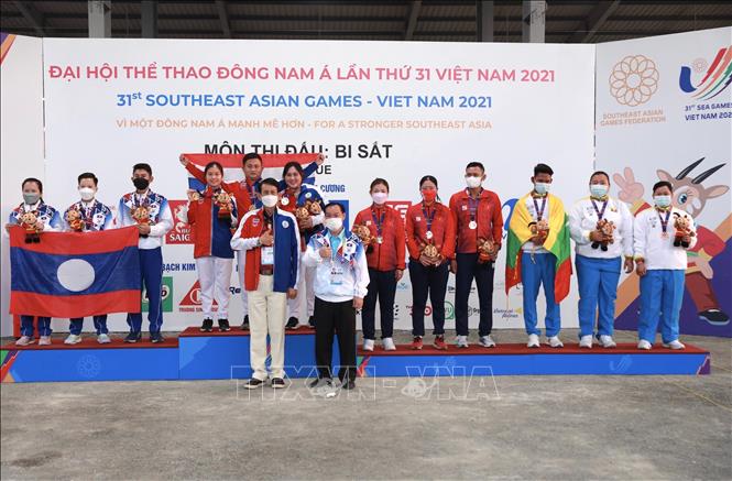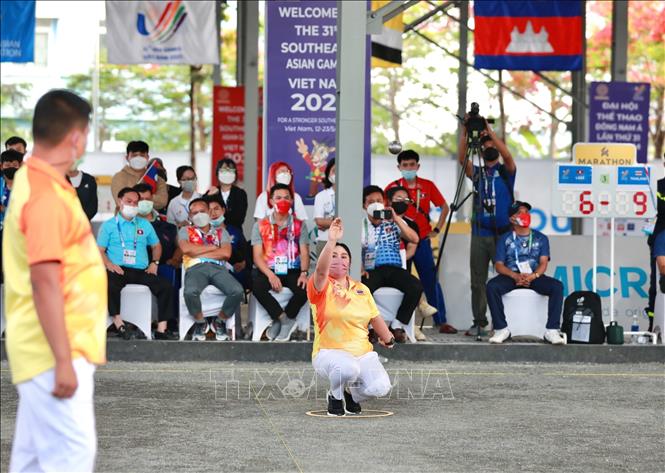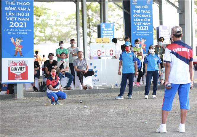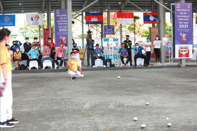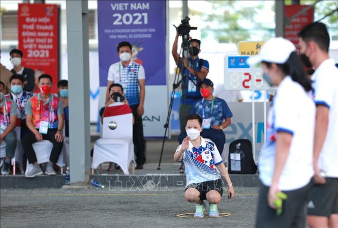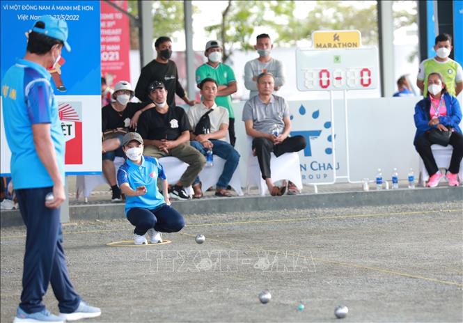Chiều 17/5/2022, tại Trung tâm Huấn luyện và Thi đấu TDTT Hà Nội diễn ra chung kết môn Bi sắt các nội dung: Đôi nam, nữ (Việt Nam gặp Campuchia) và Bộ 3 phối hợp 2 nữ 1 nam (Lào gặp Thái Lan). Chung cuộc: Campuchia thắng Việt Nam 13-4, giành HCV, Việt Nam được HCB; Thái Lan thắng Lào 13-8, giành HCV, Lào được HCB. Ảnh: Hoàng Hiếu - TTXVN