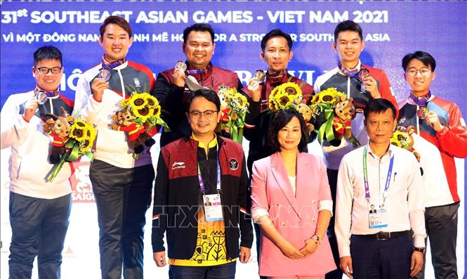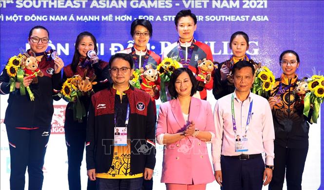 Kết thúc ngày thi đấu thứ 2 (17/5/2022) môn Bowling với nội dung đôi nam và đôi nữ (dầu dài), đôi vận động viên Ryan Leonard Lalisang và Hardy Rachmadian của Indonesia đạt tổng 2642 điểm, giành HCV đôi nam và đôi động viên Cherie Tan Shi Hua và New Hui Fen của Singapore đoạt HCV đôi nữ với thành tích 2309 điểm. Ảnh: Trung Kiên - TTXVN