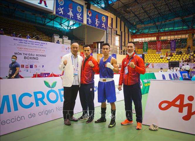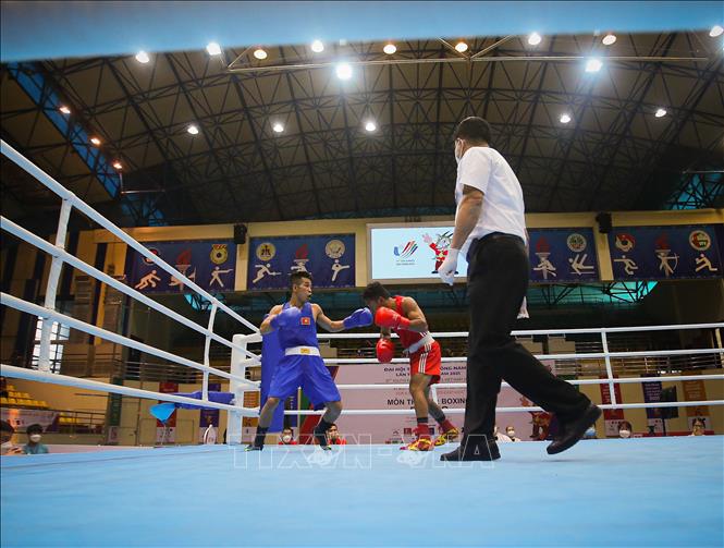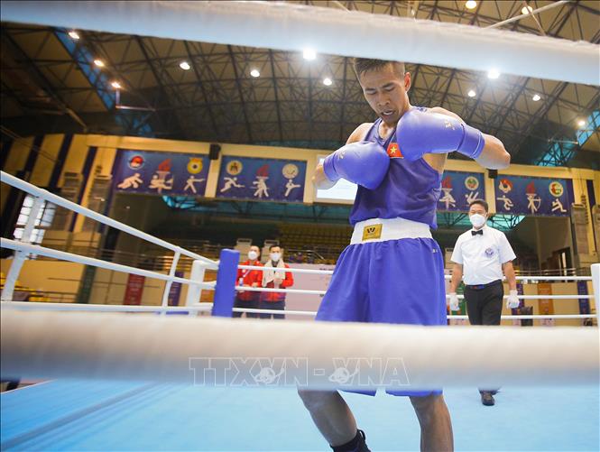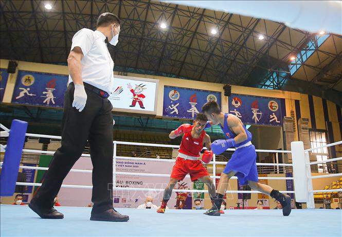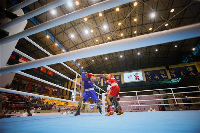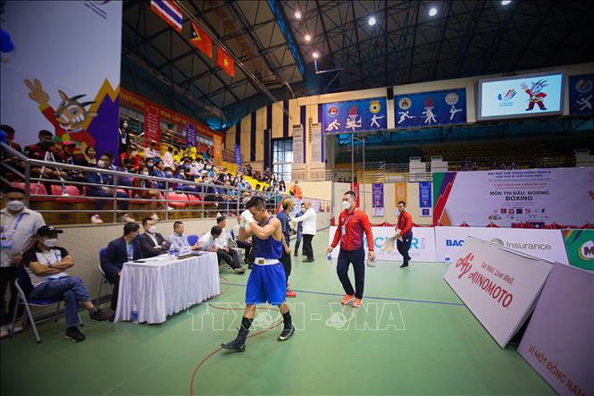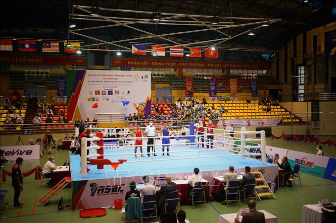 Chiều 17/5/2022, tại Nhà thi đấu Đa năng tỉnh Bắc Ninh tiếp tục diễn ra các trận đấu vòng loại môn Boxing ở SEA Games 31. Đội tuyển Boxing Việt Nam đã có chiến thắng đầu tiên của VĐV Trần Văn Thảo ở hạng 52 kg nam. Ảnh: Phạm Tuấn Anh - TTXVN