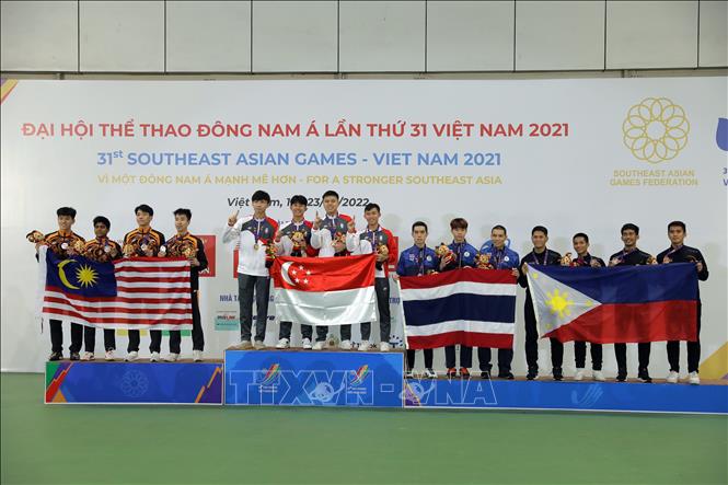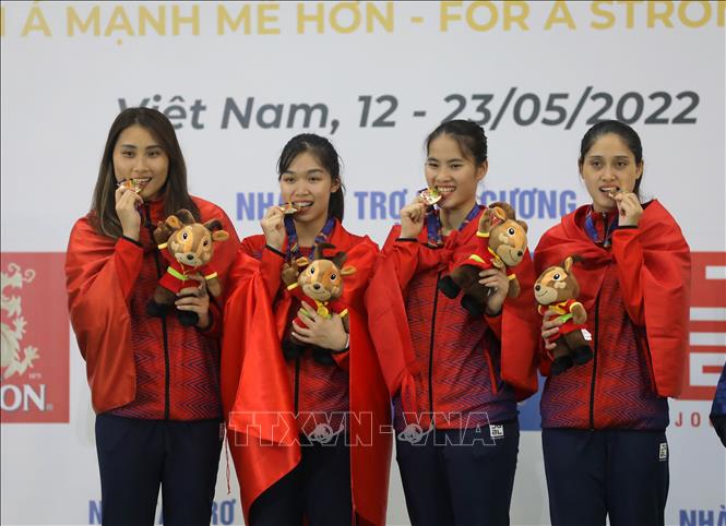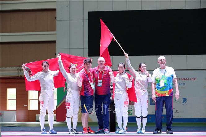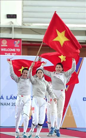 Trưa 18/5/2022, tại Cung Điền kinh Hà Nội, bộ môn Đấu kiếm tại SEA Games 31 bước vào ngày thi đấu cuối cùng với các nội dung Kiếm chém đồng đội nam, nữ. 4 VĐV Bùi Thị Thu Hà, Đỗ Thị Tâm, Phạm Thị Thu Hoài và Phùng Thị Khánh Linh của đội tuyển Việt Nam đã xuất sắc giành HCV nội dung Kiếm chém đồng đội nữ. Ảnh: TTXVN