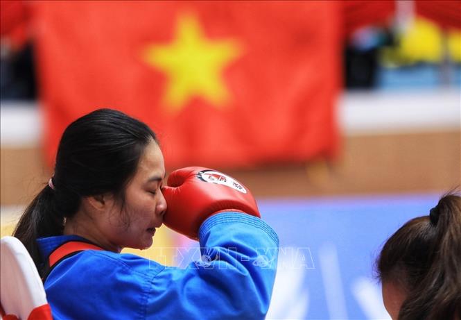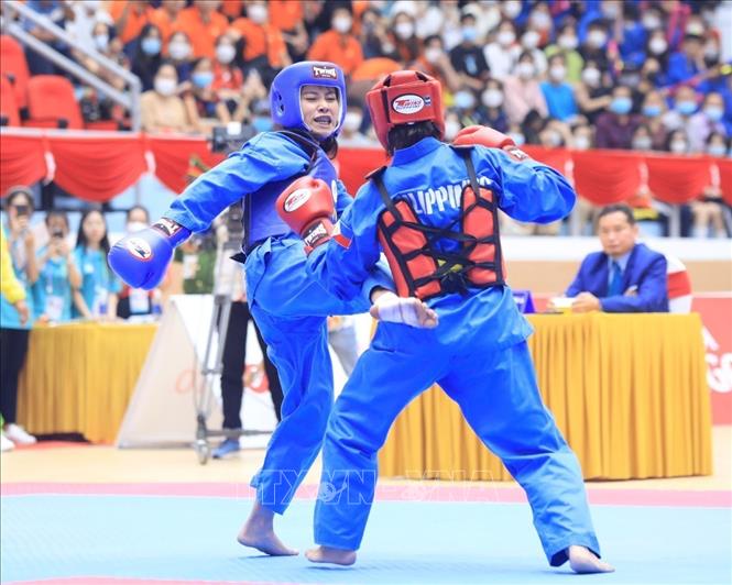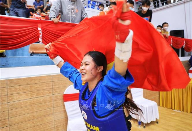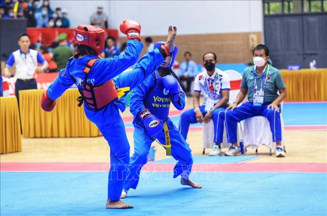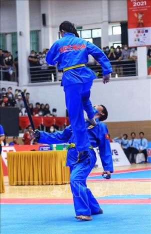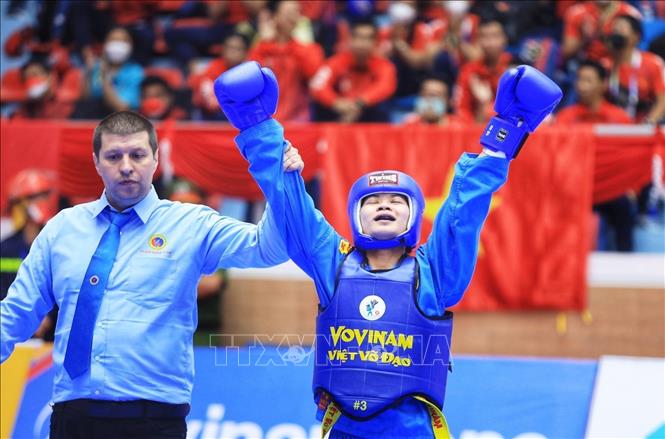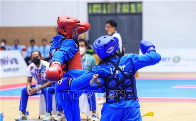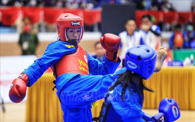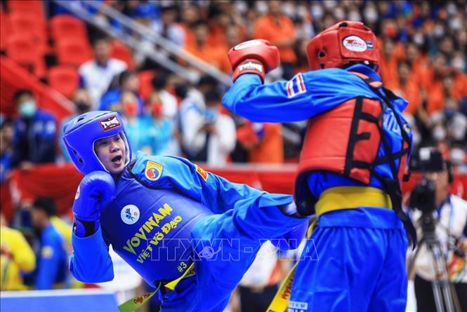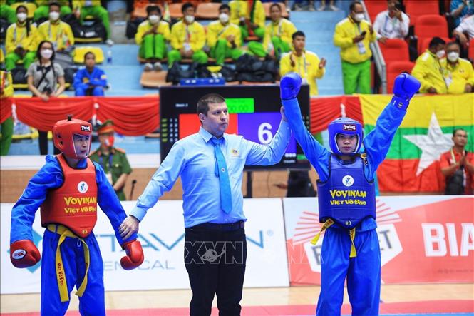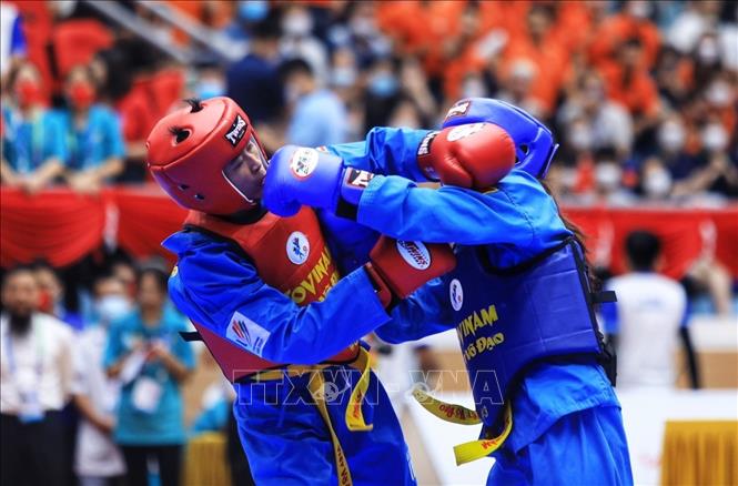 Chiều 18/5/2022, môn Vovinam ở SEA Games 31 chính thức tranh tài tại Nhà thi đấu Sóc Sơn (Hà Nội). Ngày thi đấu đầu tiên, các VĐV sẽ tranh tài ở hạng cân 55 kg nữ, Đa luyện vũ khí nữ và Song luyện 1 nữ. Kết quả, Việt Nam giành 1 HCV nội dung đối kháng, 1 HCB nội dung Đa luyện vũ khí nữ, 1 HCB nội dung Song luyện 1 nữ. Ảnh: TTXVN