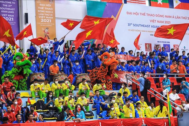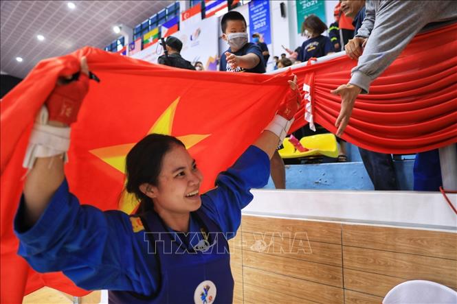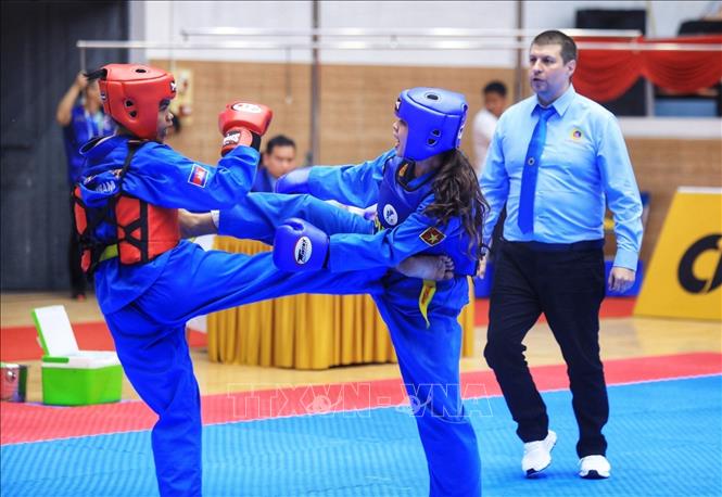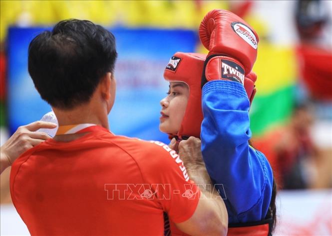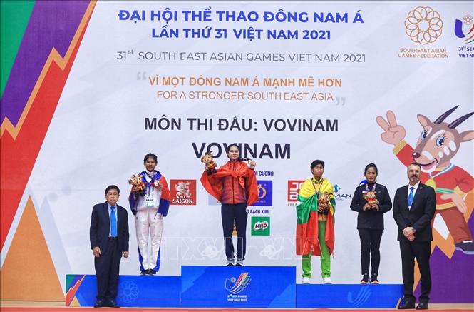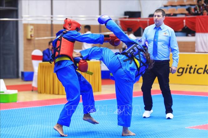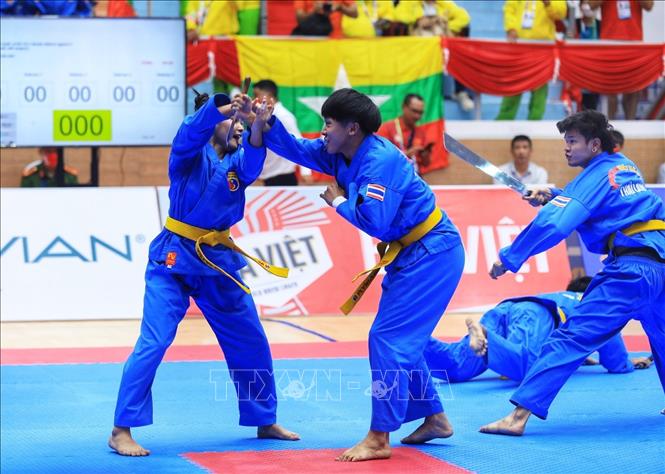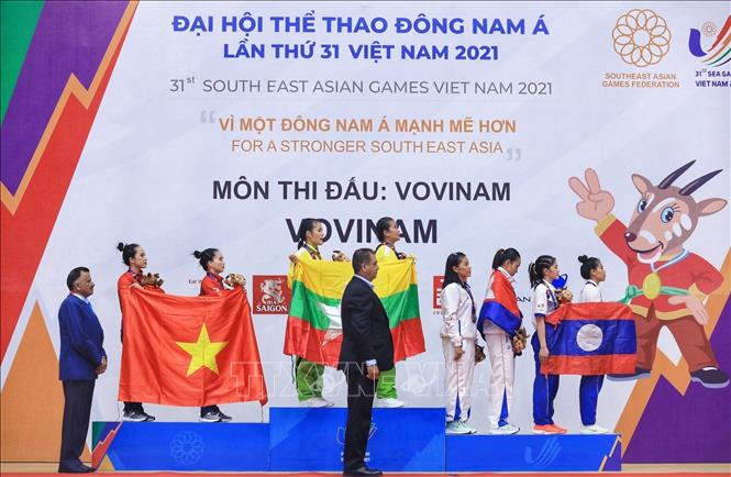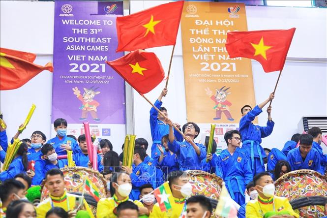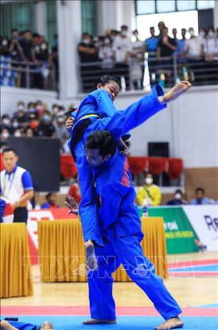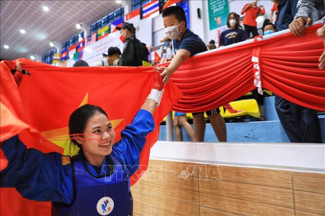 Chiều 18/5/2022, môn Vovinam ở SEA Games 31 chính thức tranh tài tại Nhà thi đấu Sóc Sơn (Hà Nội). Ngày thi đấu đầu tiên, các VĐV sẽ tranh tài ở hạng cân 55 kg nữ, Đa luyện vũ khí nữ và Song luyện 1 nữ. Kết quả, Việt Nam giành 1 HCV nội dung đối kháng, 1 HCB nội dung Đa luyện vũ khí nữ, 1 HCB nội dung Song luyện 1 nữ. Ảnh: TTXVN