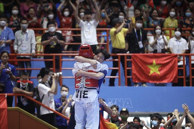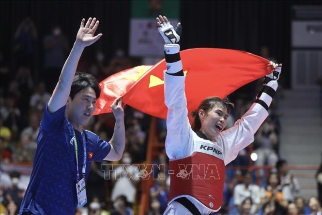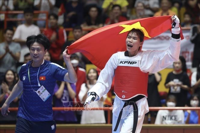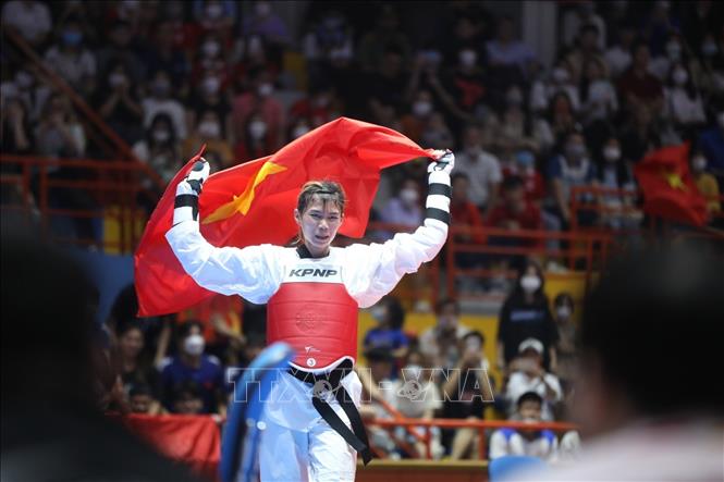 Chiều 18/5/2022, VĐV Taekwondo Trần Thị Ánh Tuyết xuất sắc giành huy chương Vàng SEA Games 31 ở nội dung đối kháng hạng cân 53kg nữ. Ảnh: Minh Quyết - TTXVN