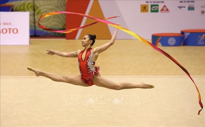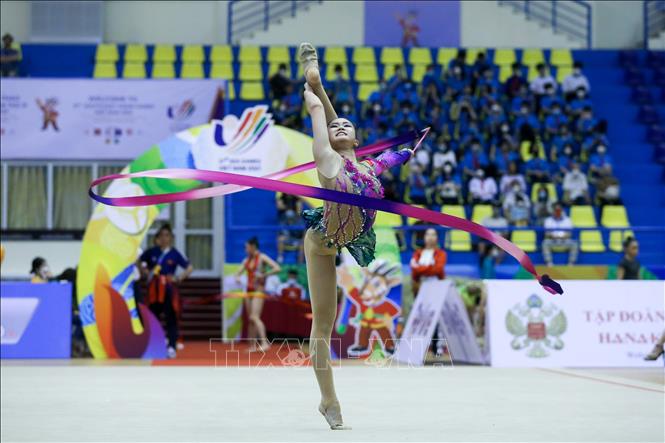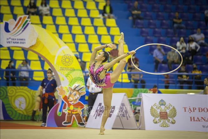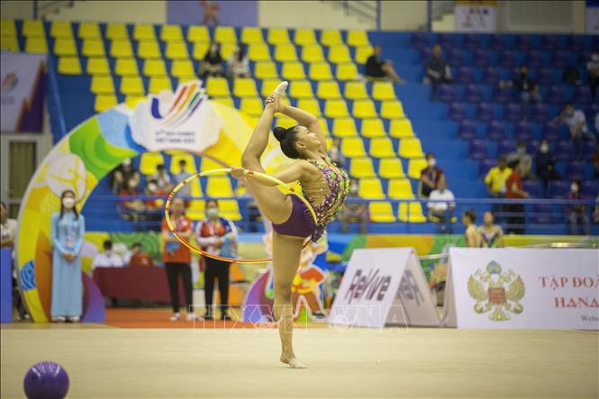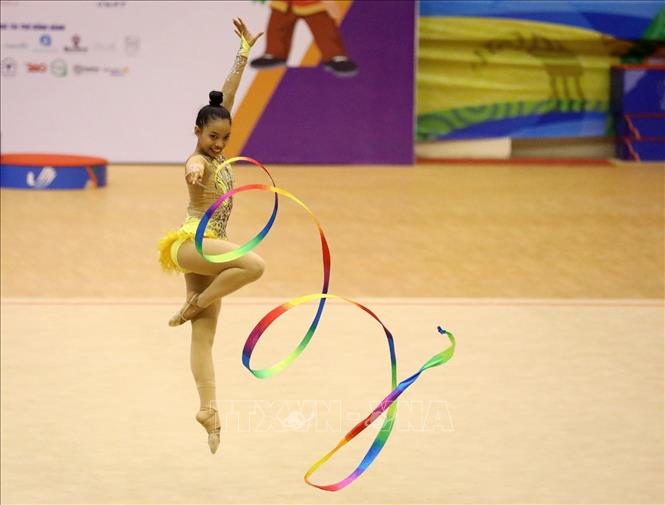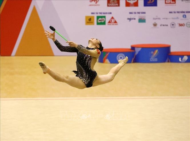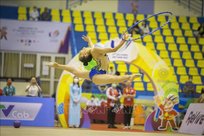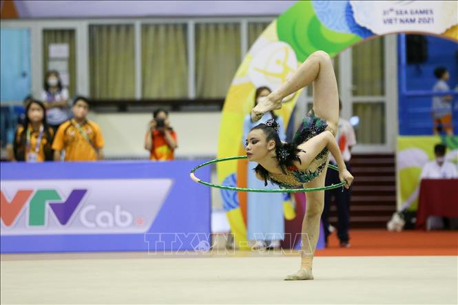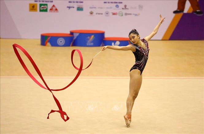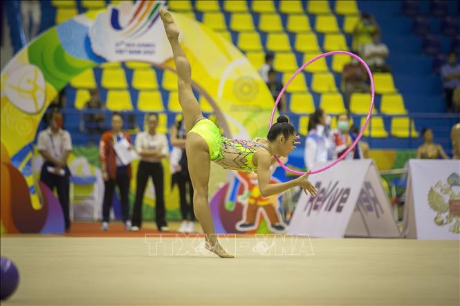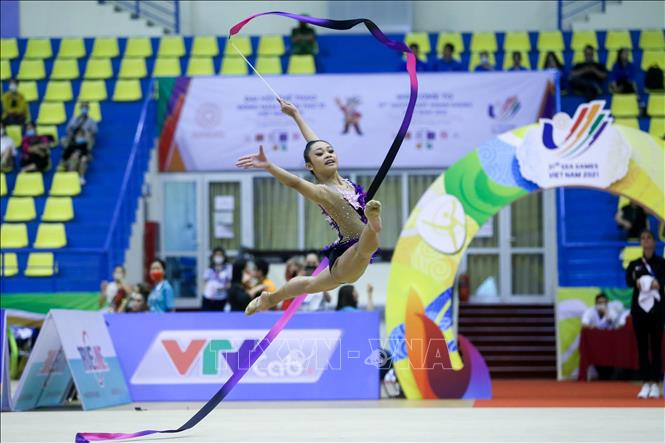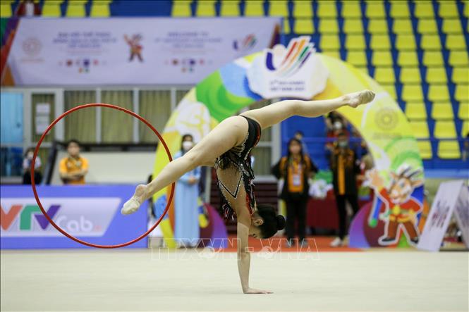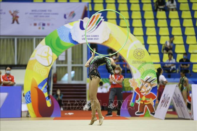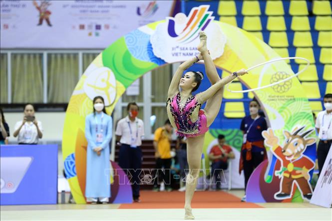 Ngày 18/5/2022, môn Thể dục nghệ thuật tại SEA Games 31 chính thức khởi tranh vòng loại toàn năng (vòng, bóng, chùy, lụa) tại Cung thể thao Quần Ngựa (Hà Nội). Ảnh: TTXVN