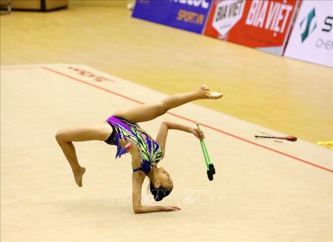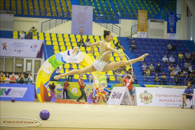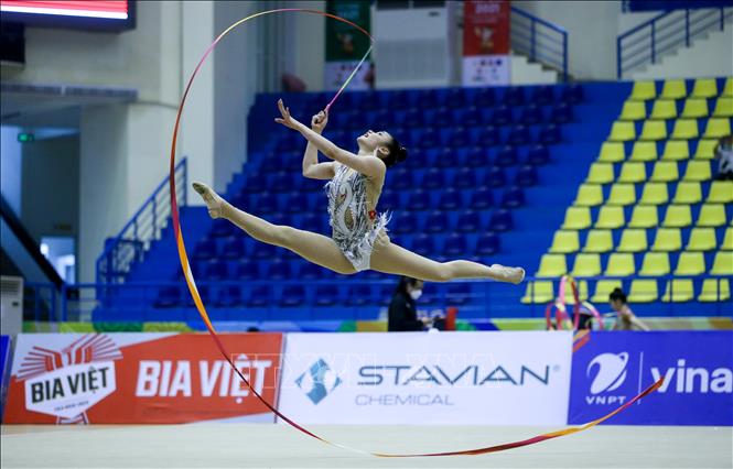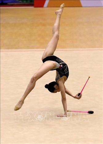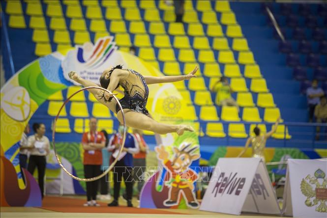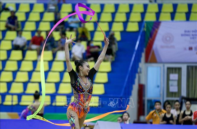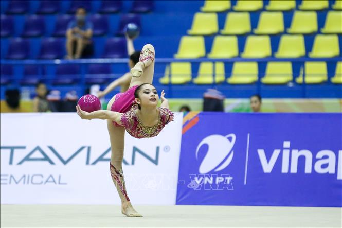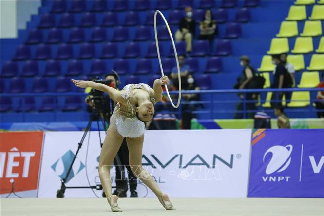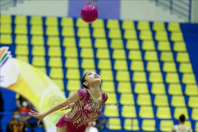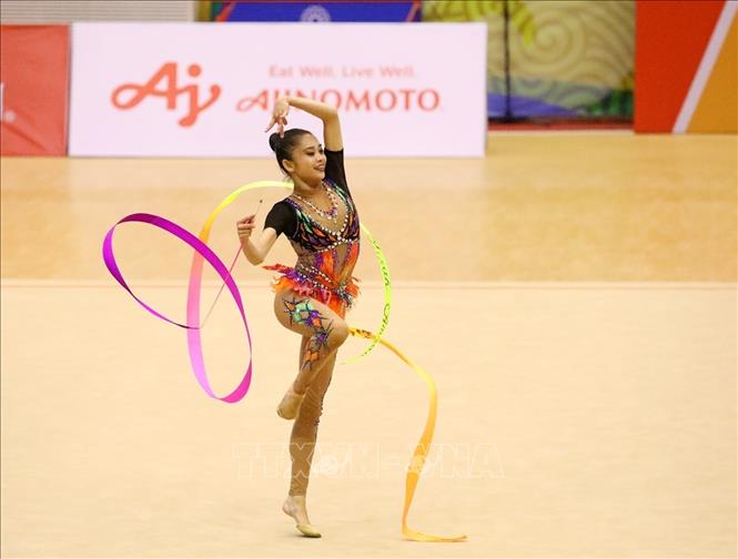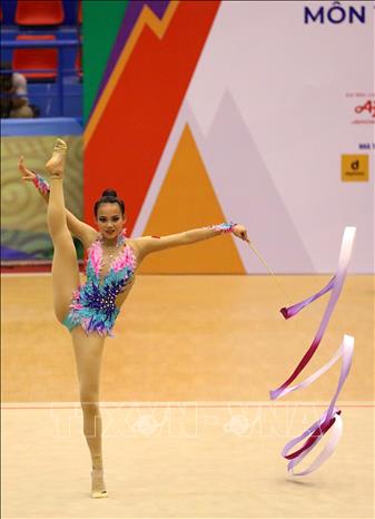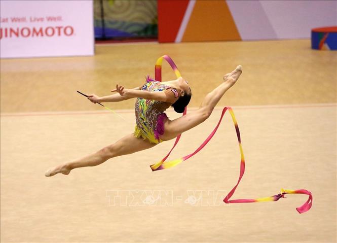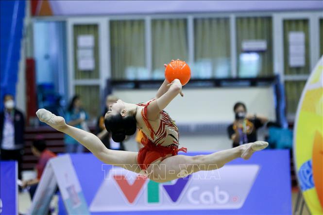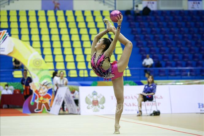 Ngày 18/5/2022, môn Thể dục nghệ thuật tại SEA Games 31 chính thức khởi tranh vòng loại toàn năng (vòng, bóng, chùy, lụa) tại Cung thể thao Quần Ngựa (Hà Nội). Ảnh: TTXVN
