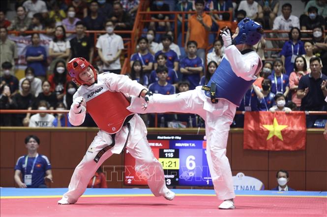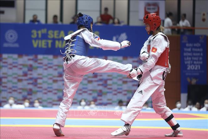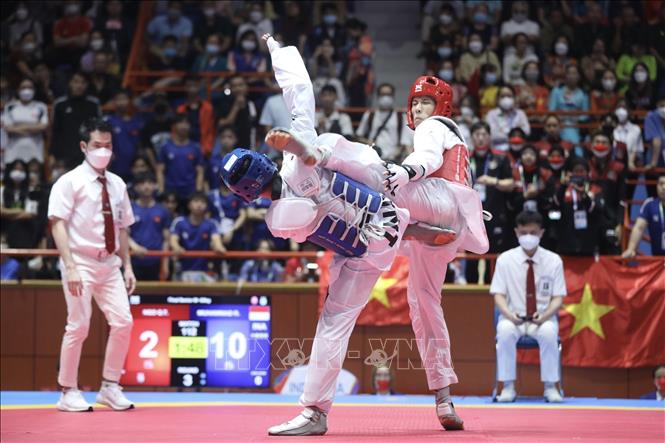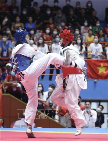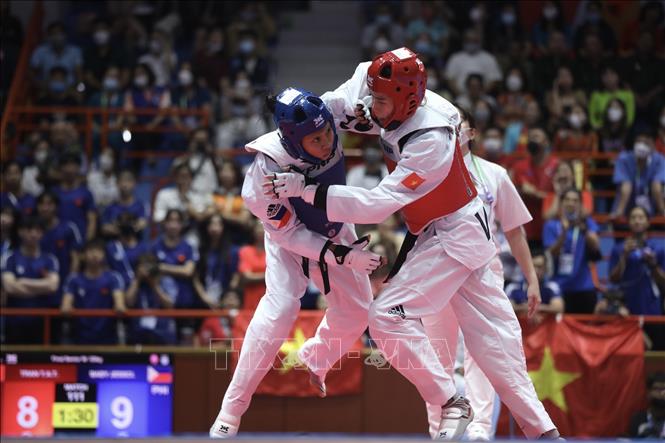 Chiều 18/5/2022, tại Nhà thi đấu quận Tây Hồ (Hà Nội) diễn ra các trận chung kết nội dung đối kháng môn Taekwondo tại SEA Games 31 ở các hạng cân: 63kg, 74kg dành cho nam và 53 kg, 57kg, 73kg dành cho nữ. Ảnh: Minh Quyết - TTXVN