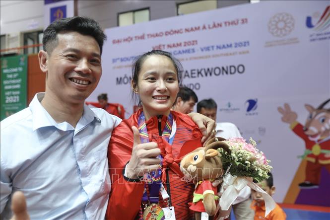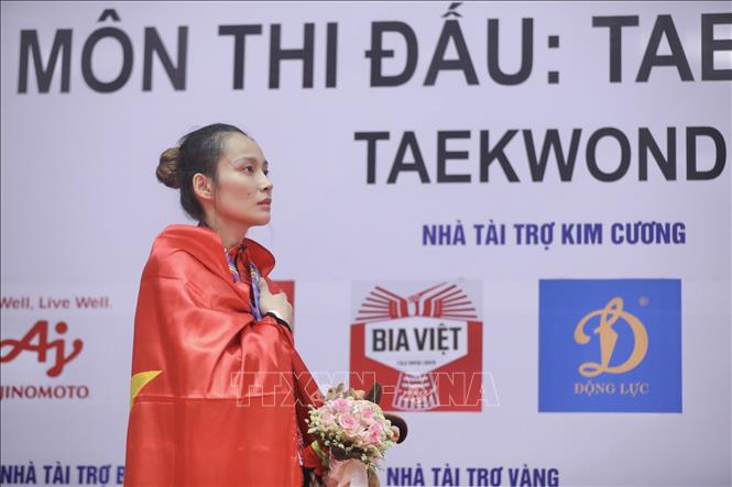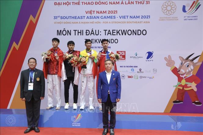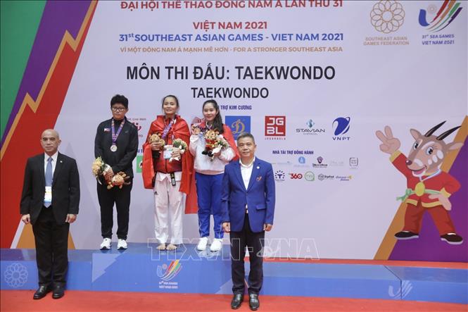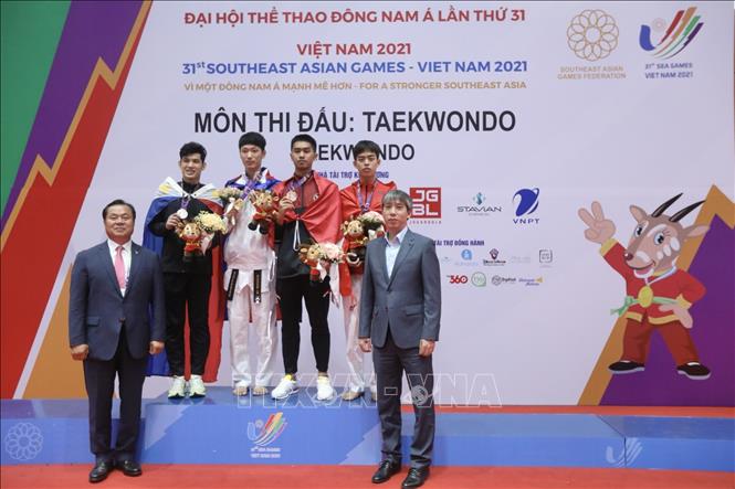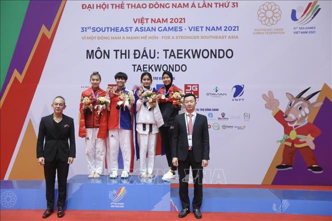 Tối 18/5/2022, tại Nhà thi đấu quận Tây Hồ diễn ra lễ trao huy chương cho các vận động viên thi đấu nội dung đối kháng ở các hạng cân của môn Taekwondo tại SEA Games 31. Các vận động viên của Việt Nam xuất sắc giành 2 huy chương Vàng, 2 huy chương Bạc và 1 huy chương Đồng. Ảnh: Minh Quyết - TTXVN