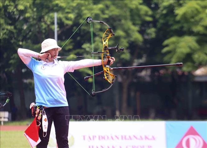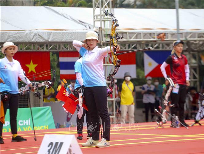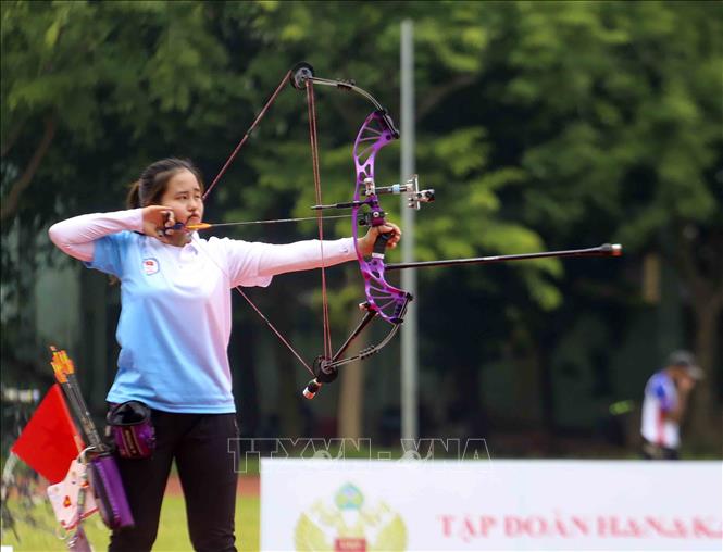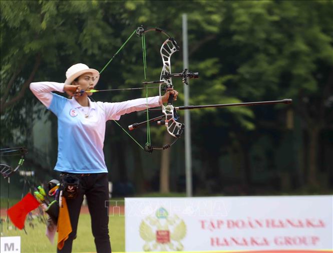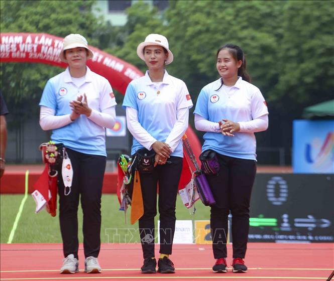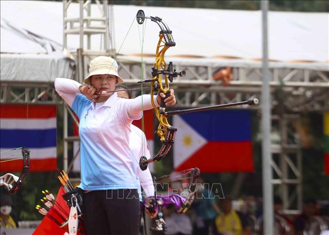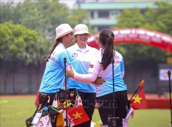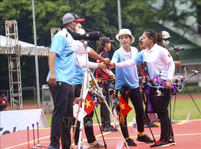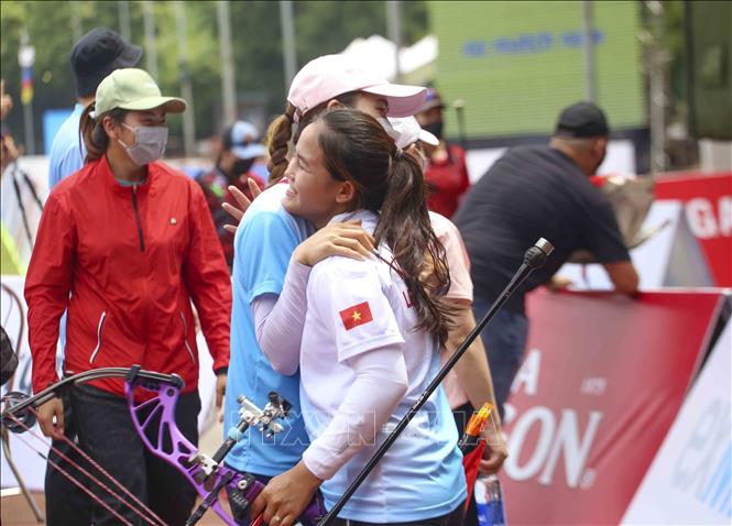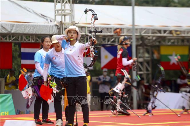 Sáng 19/5/2022, tại Trung tâm Huấn luyện thể thao Quốc gia Hà Nội diễn ra trận tranh huy chương Vàng môn Bắn cung tại SEA Games 31, nội dung cung 3 dây đồng đội nữ giữa Việt Nam và Thái Lan. Kết quả, đội tuyển Bắn cung Việt Nam giành HCB. Ảnh: Tuấn Đức - TTXVN