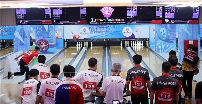 Ngày 19/5/2022, tại Trung tâm Thể thao HeroWorld B2-R3, thuộc Trung tâm thương mại Vincom Mega Mall - Khu đô thị Royal City (quận Thanh Xuân, Hà Nội), môn Bowling bước vào ngày thi đấu cuối cùng với nội dung đồng đội 4 nam. Sau 2 ngày thi đấu ở phần thi dầu ngắn và dầu dài, với tổng số 5.275 điểm, đội Philippines đã giành HCV, đội Malaysia giành HCB và HCĐ được trao cho đội Singapore. Ảnh: Trung Kiên – TTXVN