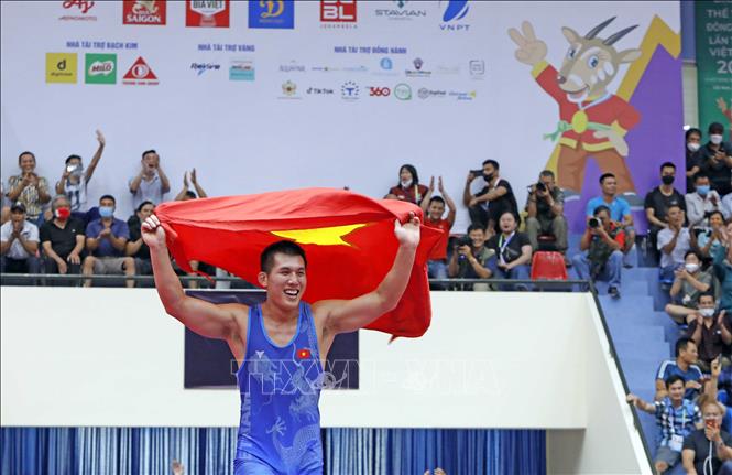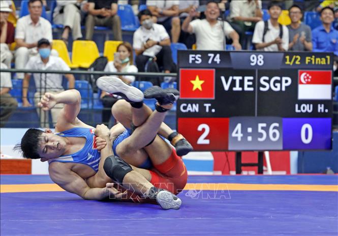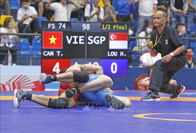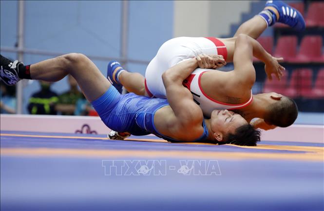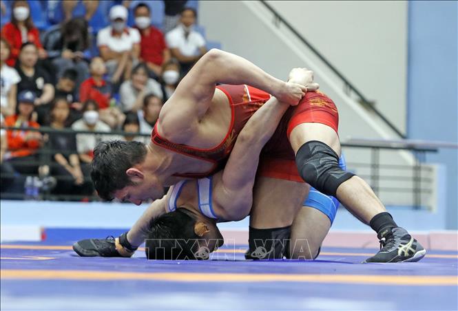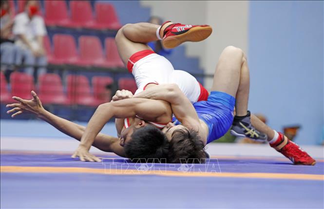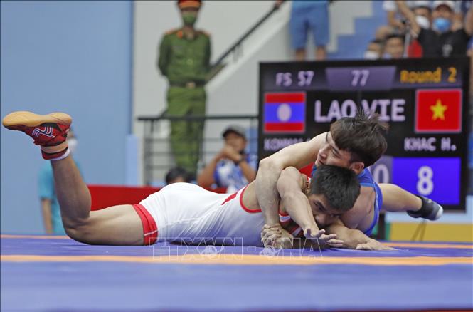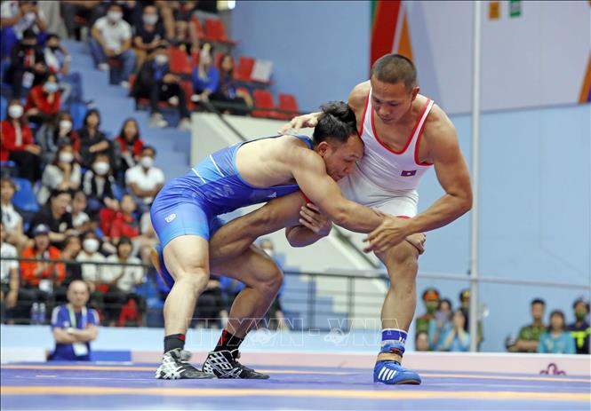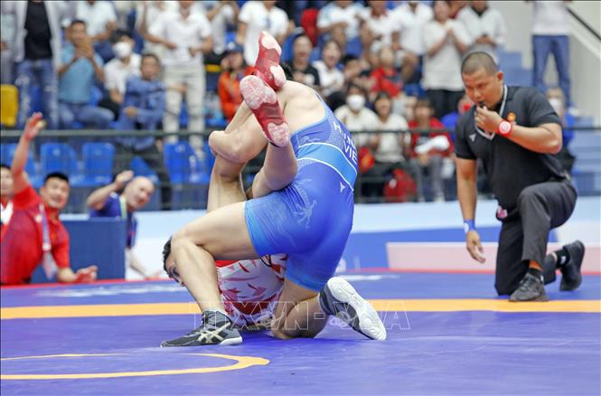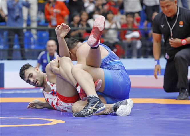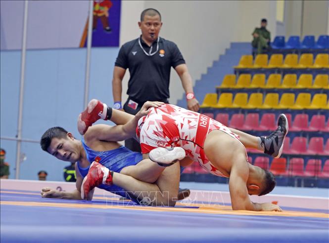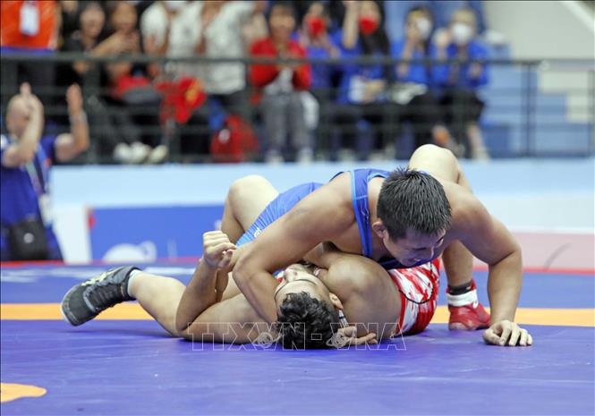Sáng 19/5/2022, tại Nhà thi đấu huyện Gia Lâm (Hà Nội), môn Vật ở SEA Games 31 tiếp tục diễn ra với các trận đấu vòng loại nội dung Vật tự do nam các hạng cân: 57 kg; 65 kg; 74 kg; 86 kg; 97 kg và 125 kg. Ảnh: Trần Việt – TTXVN