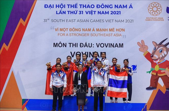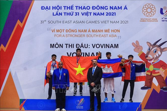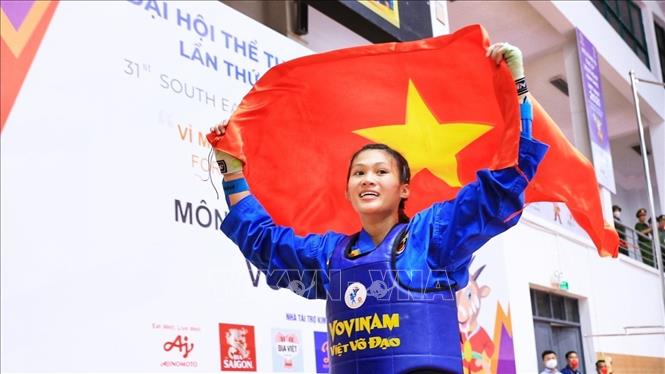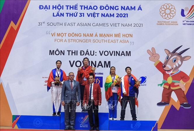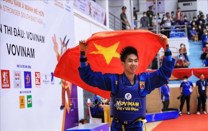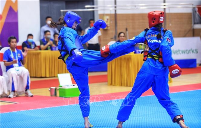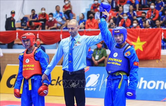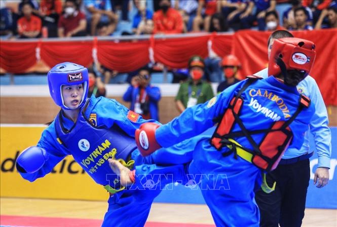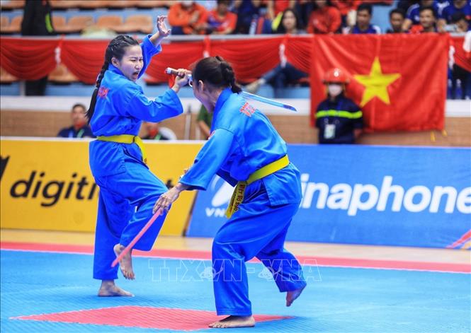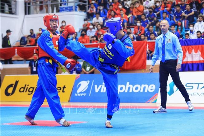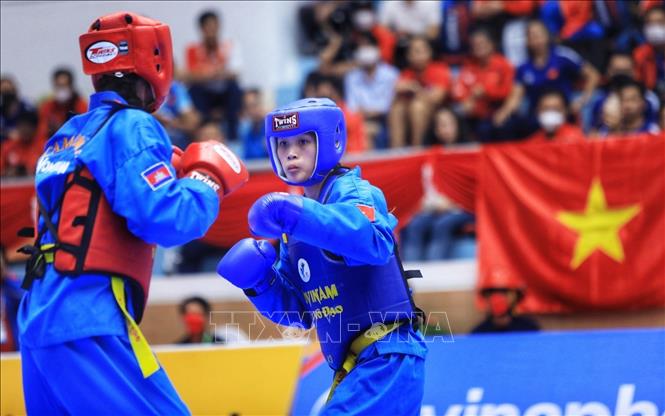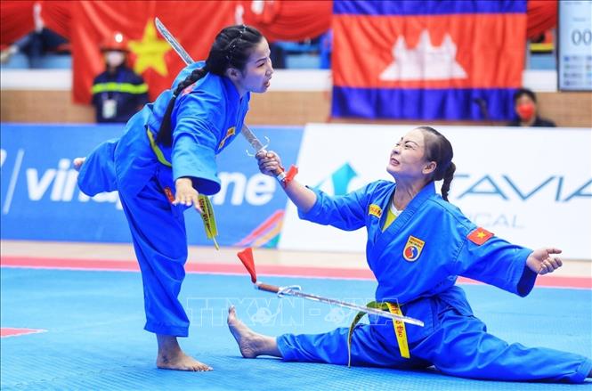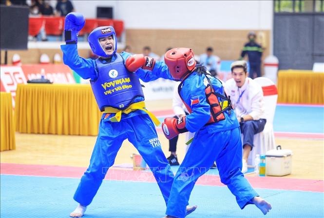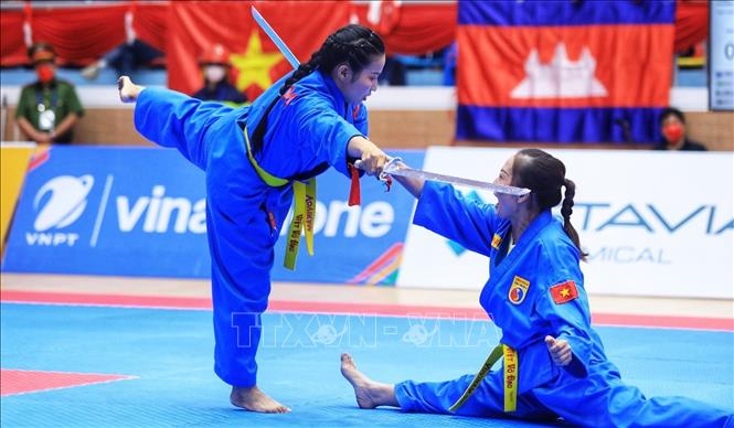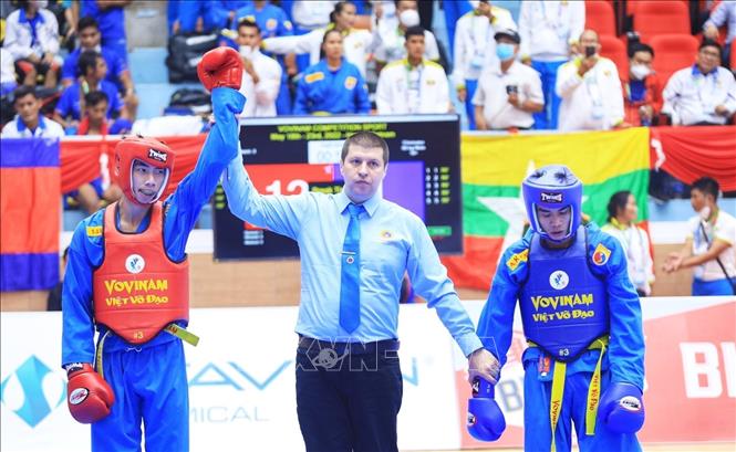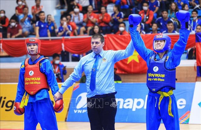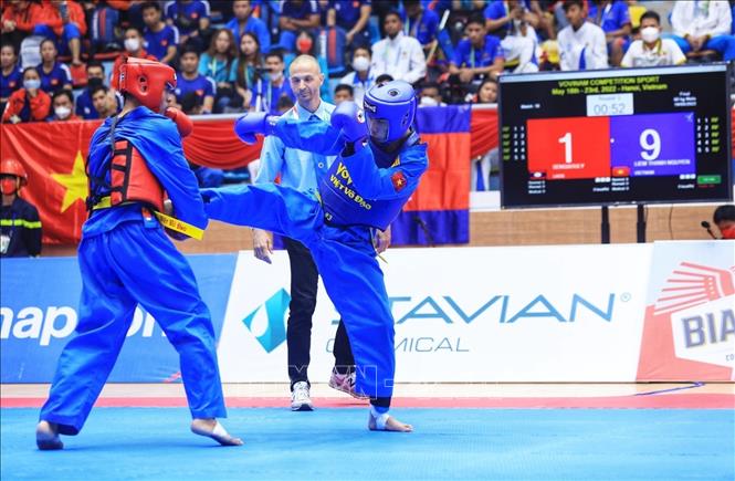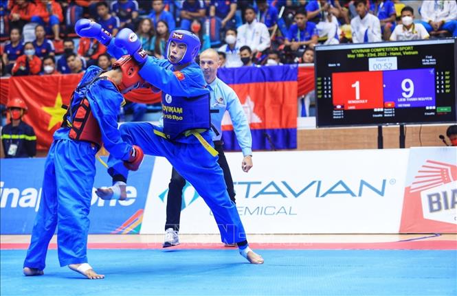 Chiều 19/5/2022, môn Vovinam ở SEA Games 31 thi đấu ngày thứ hai tại Nhà thi đấu Sóc Sơn (Hà Nội). Các VĐV tranh tài ở hạng cân 65 kg nữ, 60kg nam và Song luyện kiếm nữ. Ảnh: TTXVN