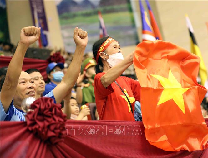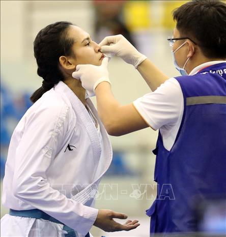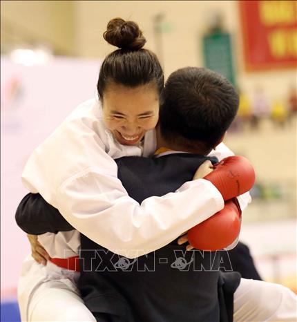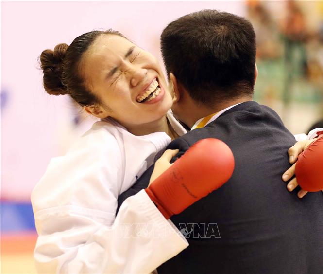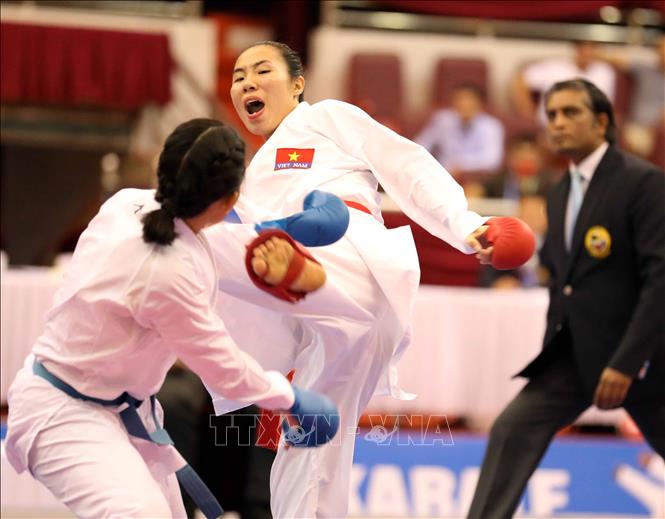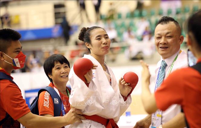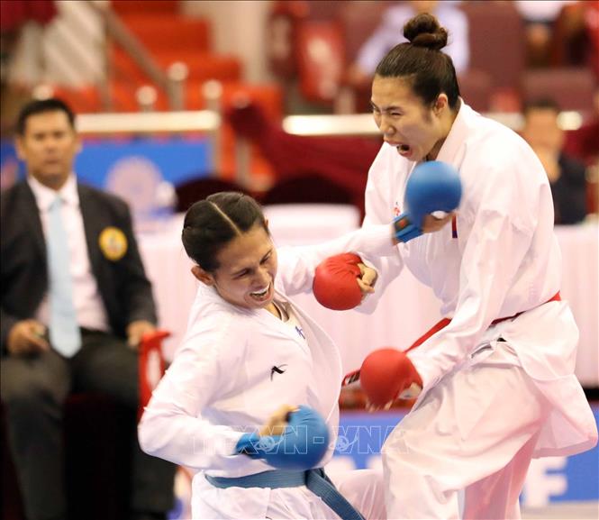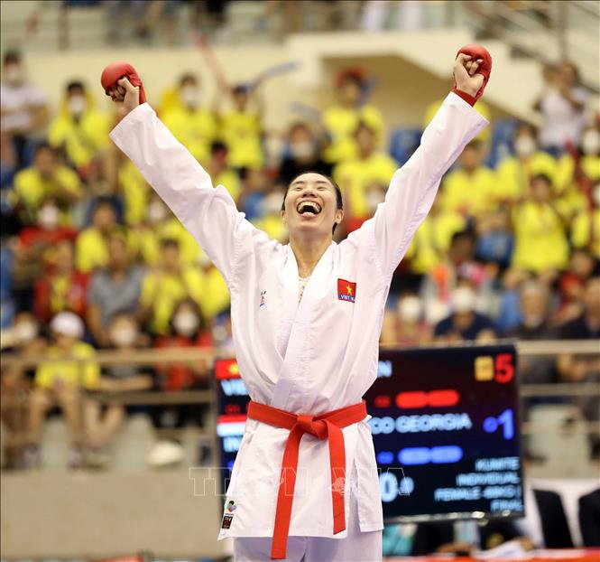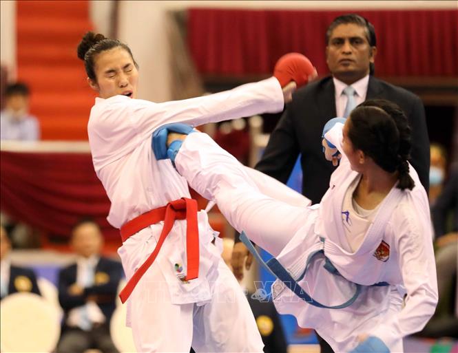 Chiều 19/5/2022, tại Nhà thi đấu tỉnh Ninh Bình, VĐV Hồ Thị Thu Hiền (đai đỏ) của đội tuyển Karate Việt Nam giành chiến thắng thuyết phục trong trận chung kết nội dung Kumite nữ, hạng dưới 68 kg trước VĐV Zefanya Ceyco Georgia (đai xanh, Indonesia) với tỷ số 5-1, giành huy chương Vàng. Ảnh: Thanh Tùng – TTXVN