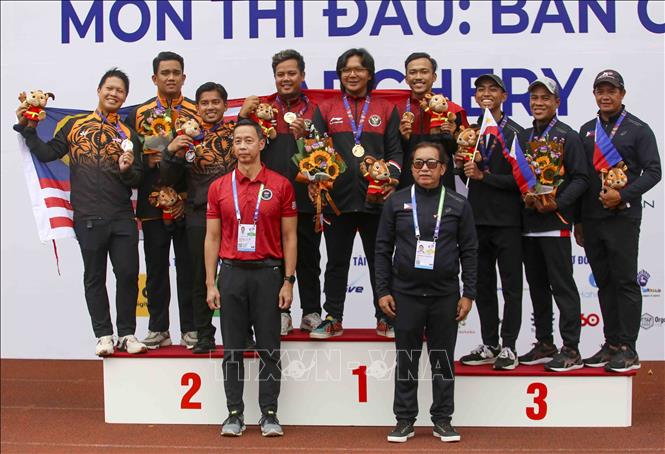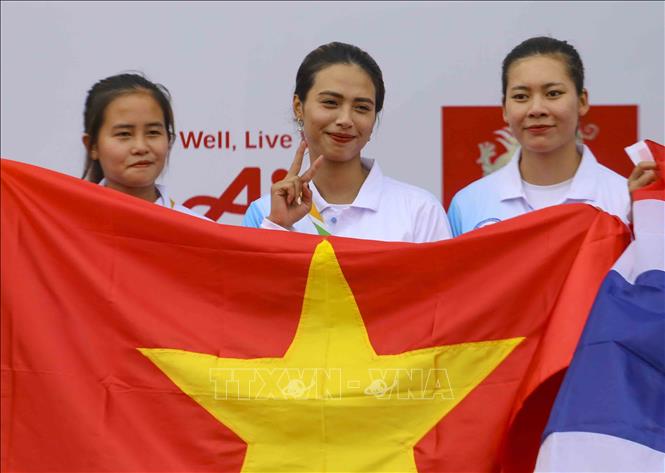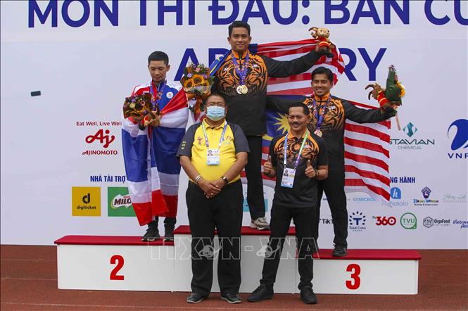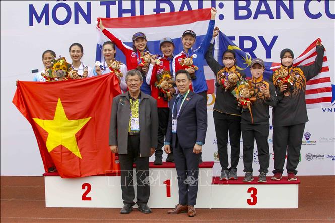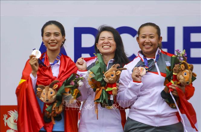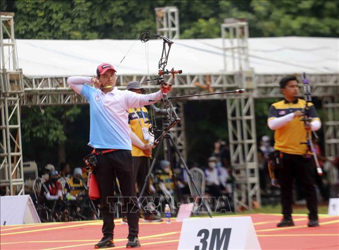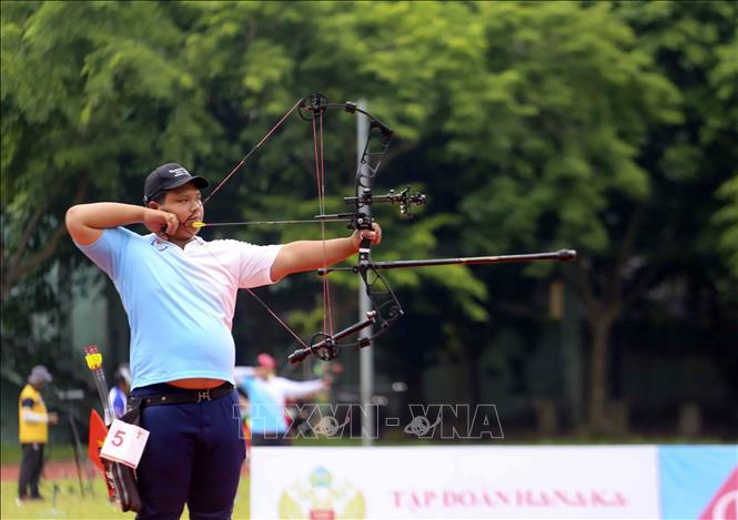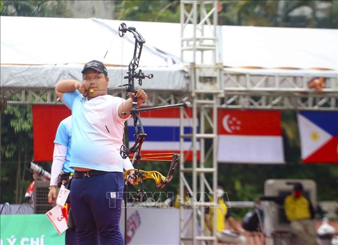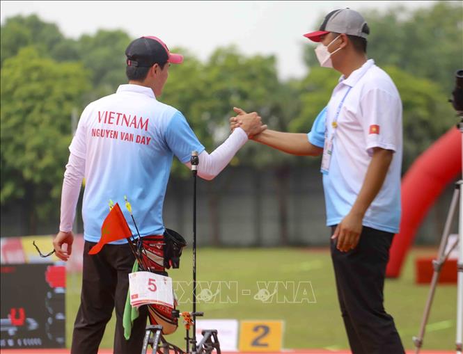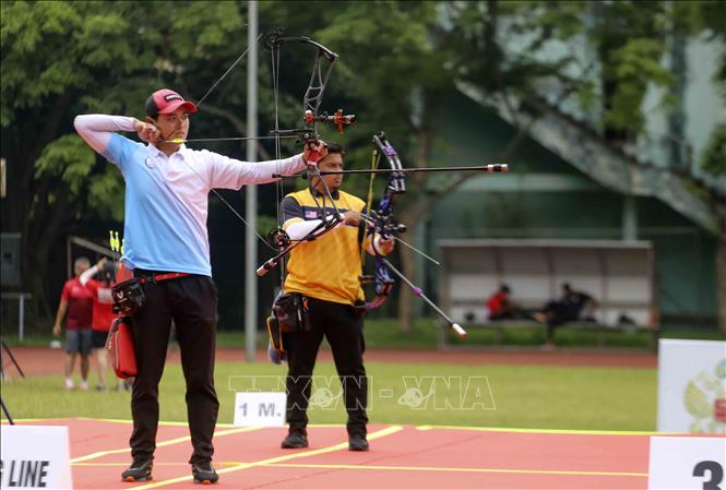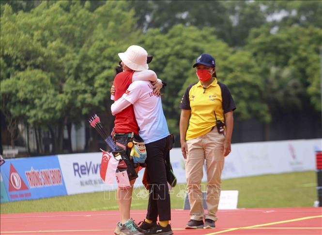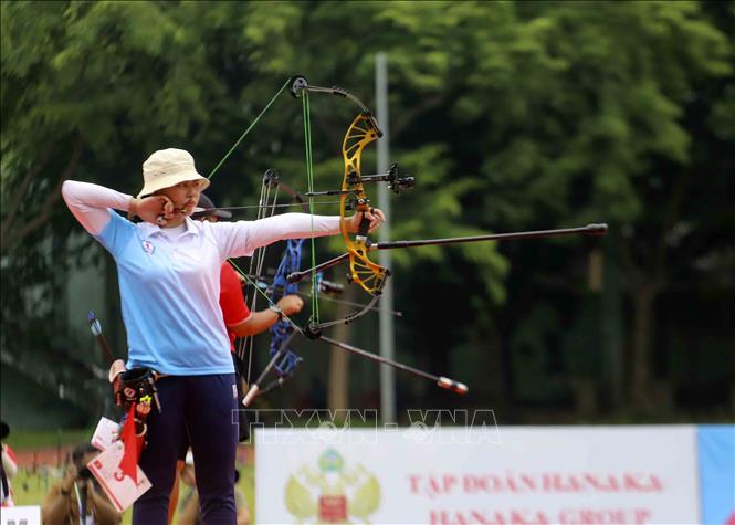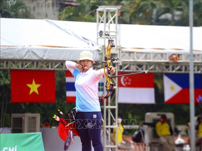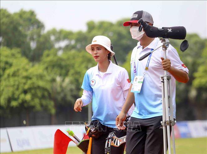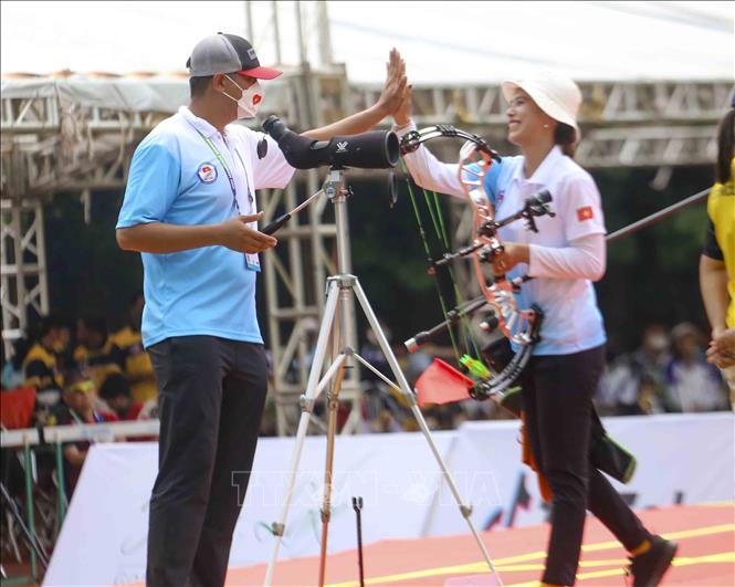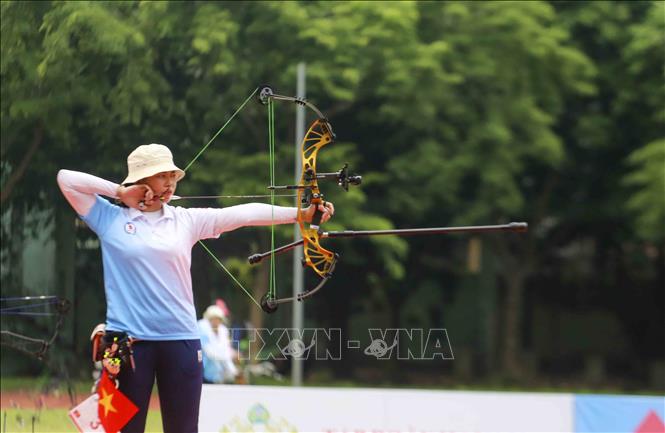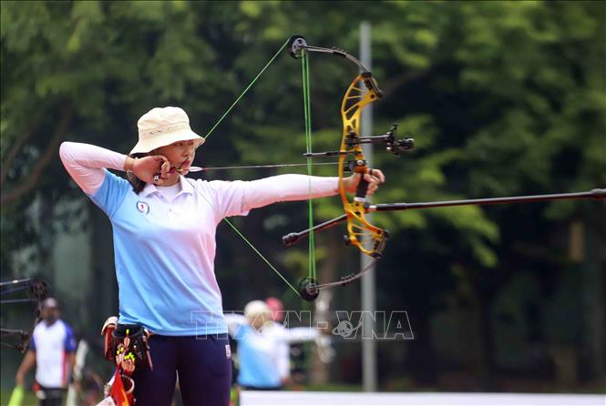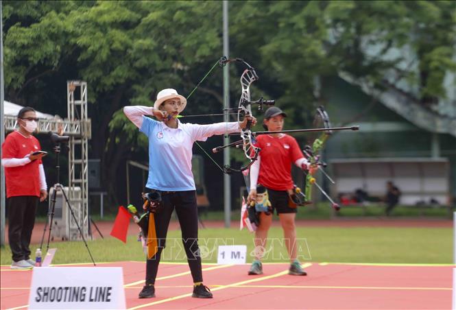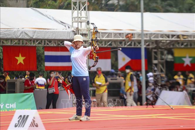Chiều 19/5/2022, tại Trung tâm Huấn luyện thể thao Quốc gia Hà Nội diễn ra các trận tranh huy chương Vàng môn Bắn cung tại SEA Games 31 nội dung cung 3 dây đơn nữ giữa Việt Nam và Singapore; tranh huy chương Đồng nội dung cung 3 dây đội nam-nữ giữa Việt Nam và Thái Lan, đơn nam giữa Việt Nam và Malaysia, đơn nữ giữa Việt Nam và Singapore. Kết quả, đội tuyển Bắn cung Việt Nam giành huy chương Bạc nội dung cung 3 dây đơn nữ. Ảnh: Tuấn Đức - TTXVN