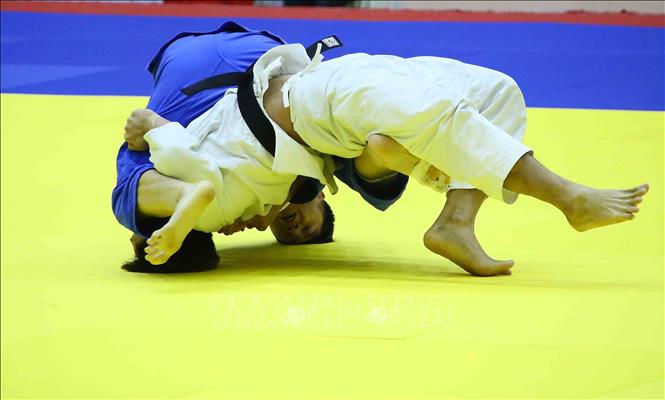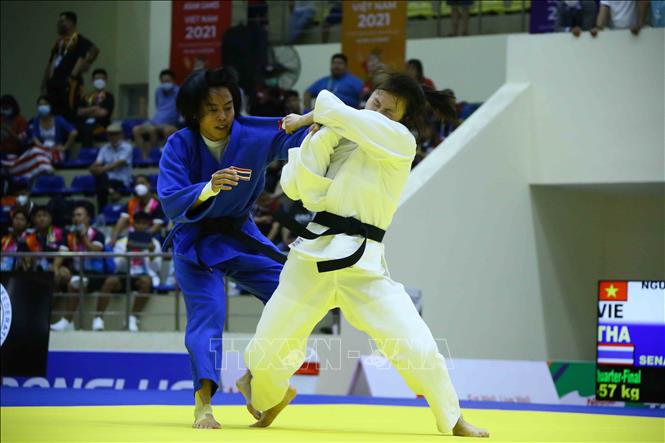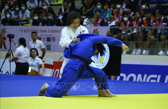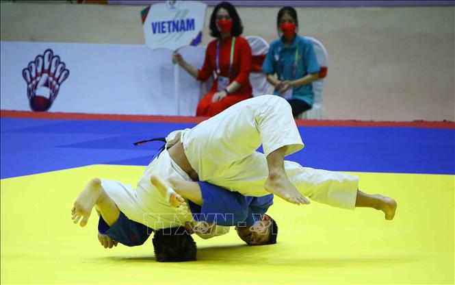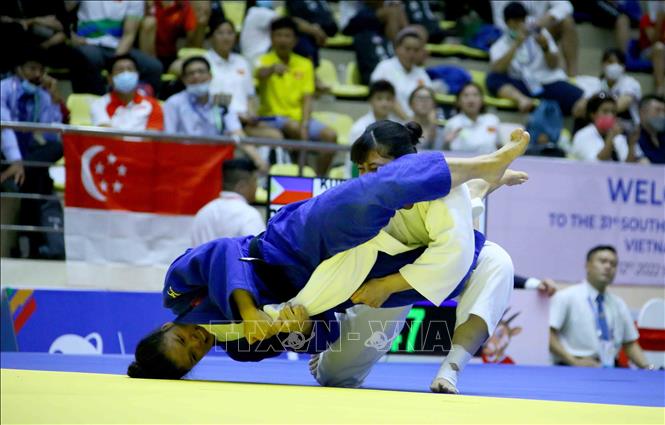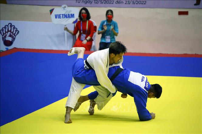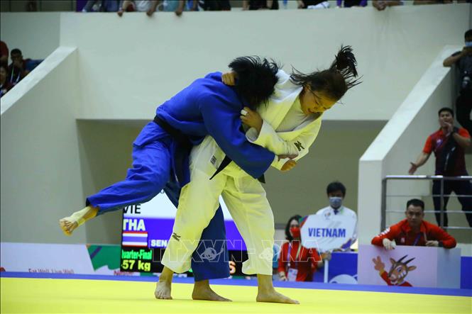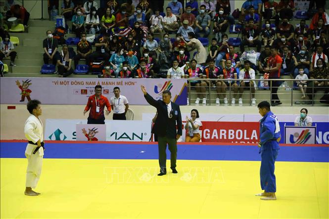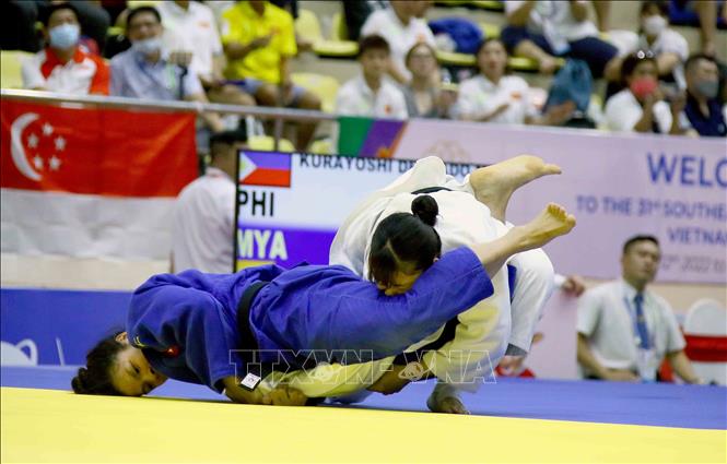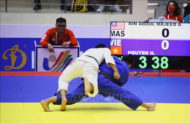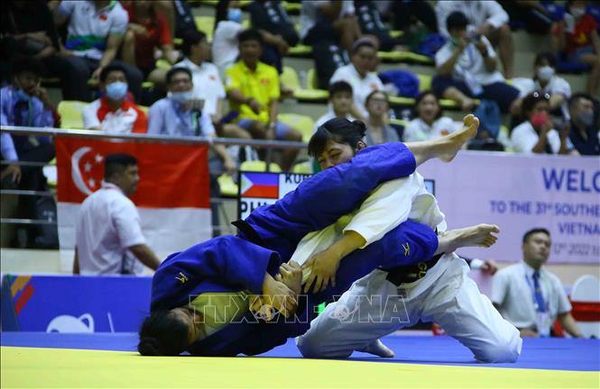 Chiều 19/5/2022, ngày thứ 2 môn Judo tại SEA Games 31 tiếp tục diễn ra tại Nhà thi đấu Hoài Đức (Hà Nội) với các trận thi đấu vòng loại ở 4 hạng cân: dưới 57kg, dưới 63kg (nữ), dưới 73kg và dưới 90kg nam. Các VĐV của Việt Nam gồm Lê Anh Tài thi đấu ở hạng cân dưới 90kg, Nguyễn Hải Bá (dưới 73kg), Nguyễn Thị Hường (dưới 63kg), Nguyễn Thị Bích Ngọc (dưới 57kg). Ảnh: Quang Quyết-TTXVN