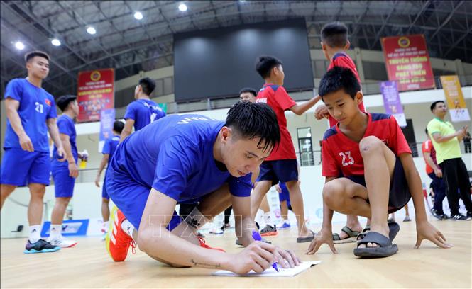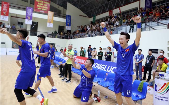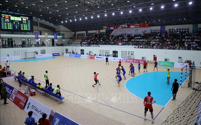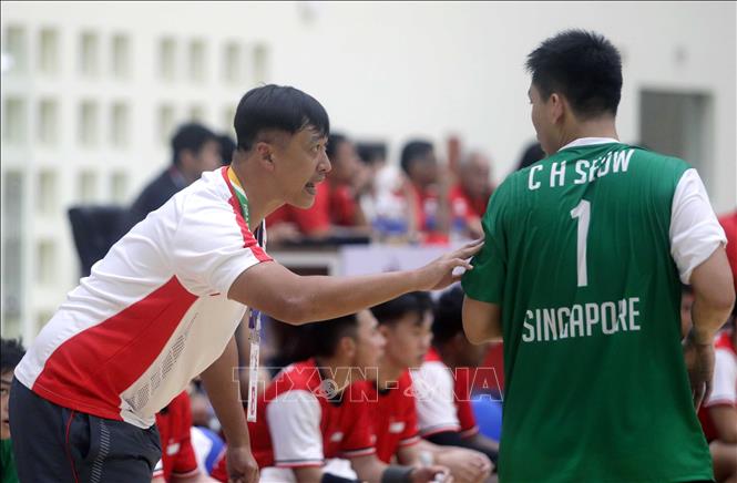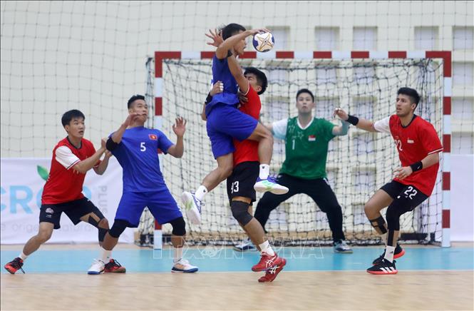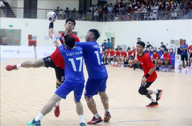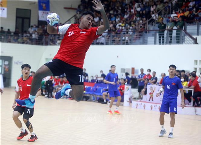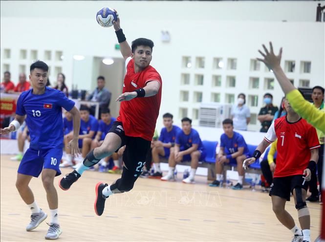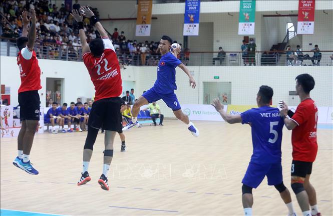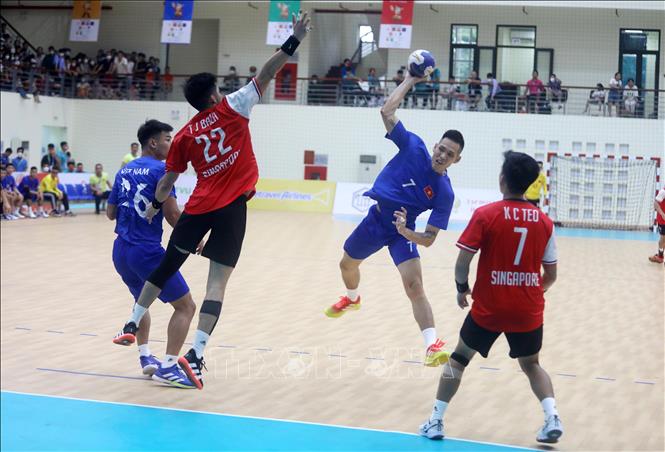 Ngày 19/5/2022, tại Trường Đại học Thể dục Thể thao Bắc Ninh, trong trận lượt về môn Bóng ném trong nhà của SEA Games 31, đội tuyển nam Việt Nam (áo xanh) thắng đội tuyển nam Singapore (áo đỏ) với tỷ số 34-19. Với kết quả này, Đội tuyển bóng ném nam Việt Nam có 6 điểm, đứng đầu bảng và giành HCV trước một lượt đấu. Ảnh: Thế Duyệt – TTXVN