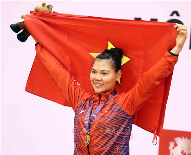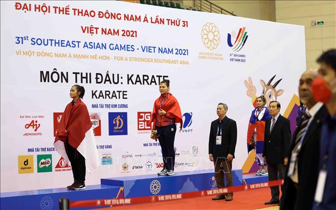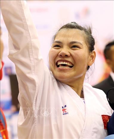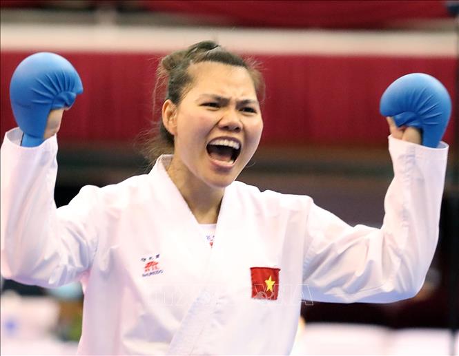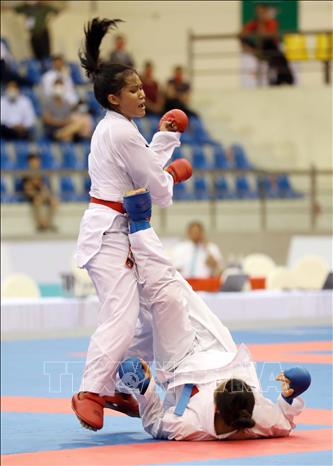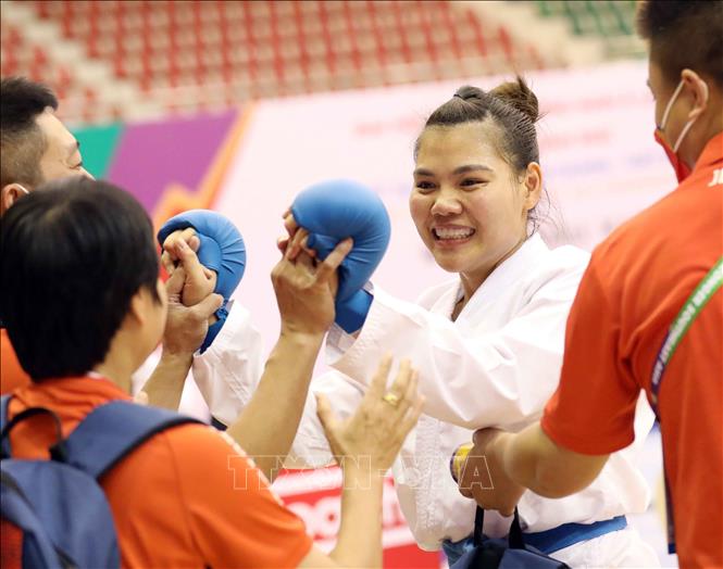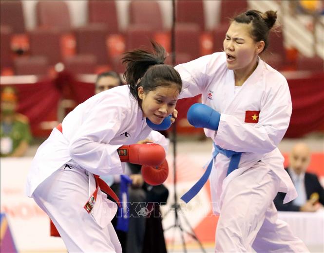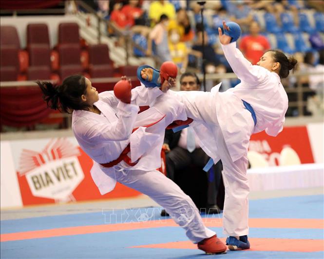 Chiều 19/5/2022, tại Nhà thi đấu tỉnh Ninh Bình, VĐV Bùi Thị Thảo (đai xanh) của đội tuyển Karate Việt Nam giành chiến thắng thuyết phục trong trận chung kết nội dung Kumite, hạng trên 68 kg nữ trước VĐV Banurea Dessyinta Rakawui (đai đỏ, Indonesia), đoạt huy chương Vàng. Ảnh: Thanh Tùng – TTXVN