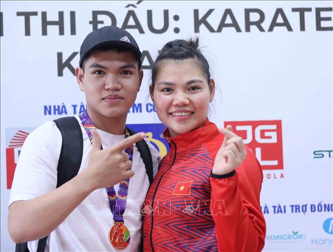 Chiều 19/5/2022, tại Nhà thi đấu tỉnh Ninh Bình, Bùi Thị Thảo (đai xanh) của đội tuyển Karate Việt Nam giành chiến thắng thuyết phục trong trận chung kết nội dung Kumite nữ, hạng trên 68 kg trước VĐV Banurea Dessyinta Rakawui (đai đỏ, Indonesia) và đạt huy chương Vàng. Ảnh: Thanh Tùng – TTXVN