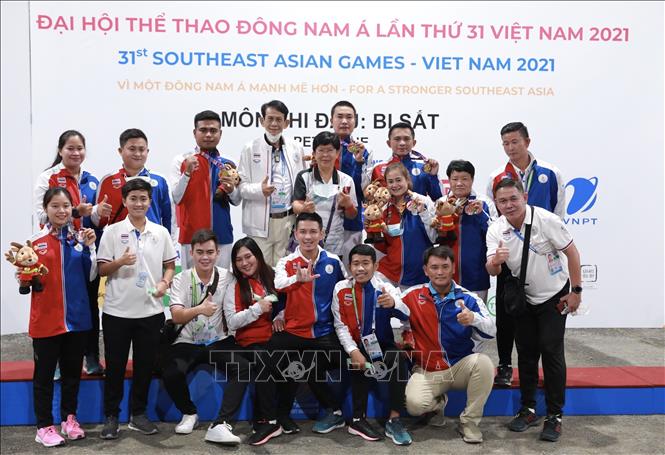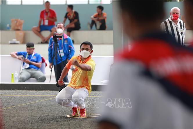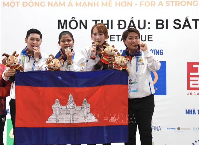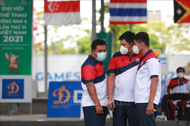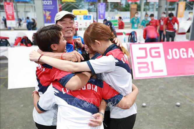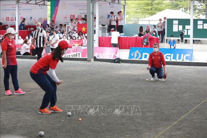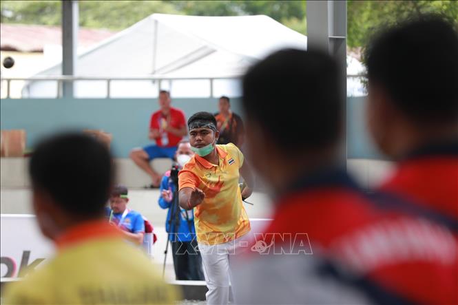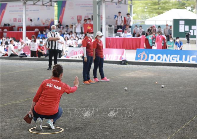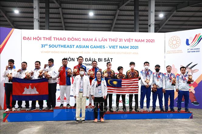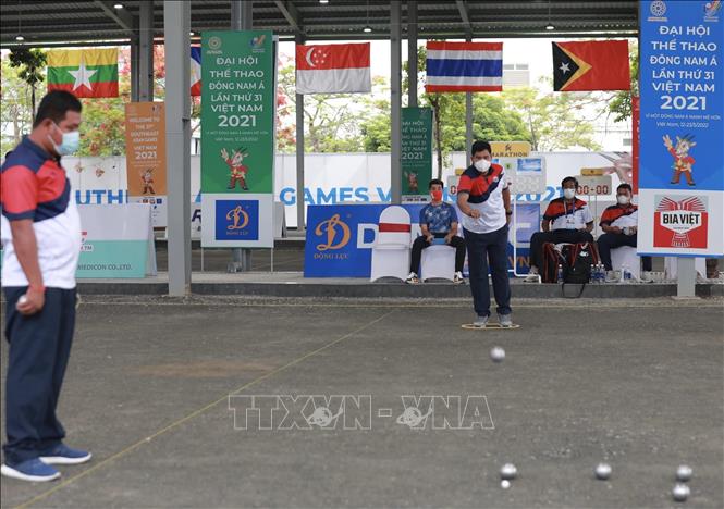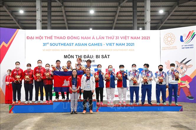 Chiều 19/5/2022, tại Trung tâm Huấn luyện và Thi đấu TDTT Hà Nội, môn Bi sắt của SEA Games 31 thi đấu các trận cuối cùng với các trận chung kết nội dung: Bộ 3 nữ: Đội Việt Nam thi đấu với đội Campuchia; Bộ 3 nam: Đội Thái Lan thi đấu với đội Campuchia. Kết quả, Đội Thái Lan giành HCV nội dung Bộ 3 nam sau khi thắng đội Campuchia với tỷ số 13-1, đội Campuchia đoạt HCV nội dung Bộ 3 nữ sau khi thắng đội Việt Nam với tỷ số 13-11. Ảnh: Hoàng Hiếu - TTXVN