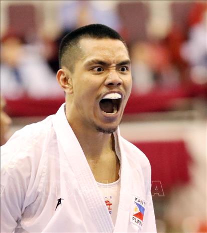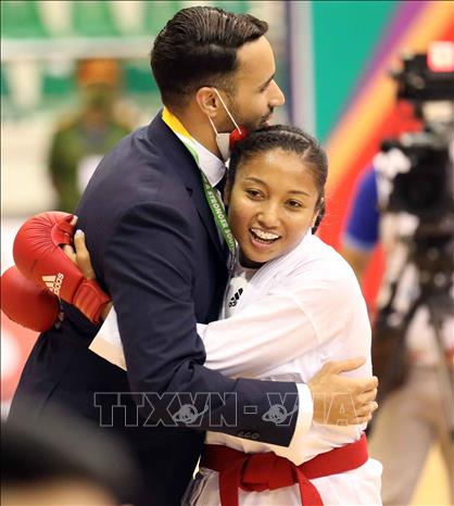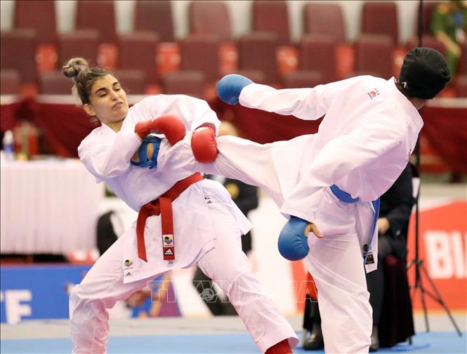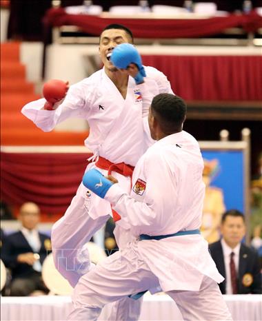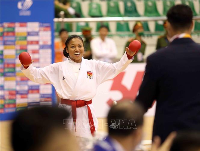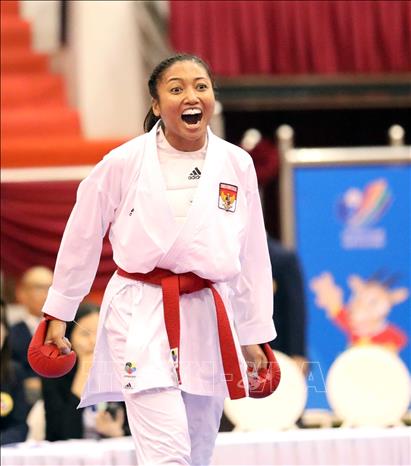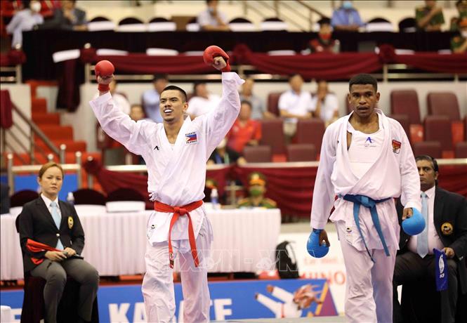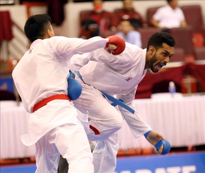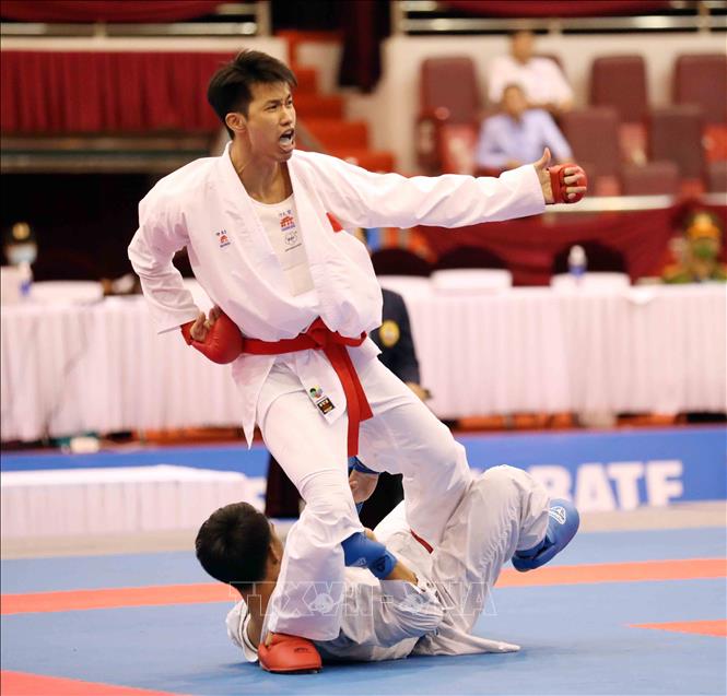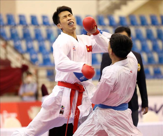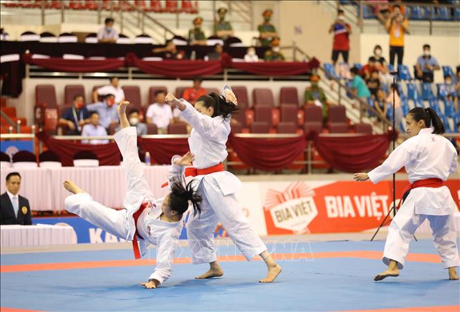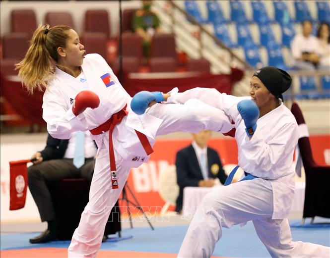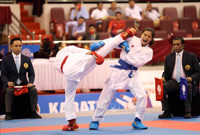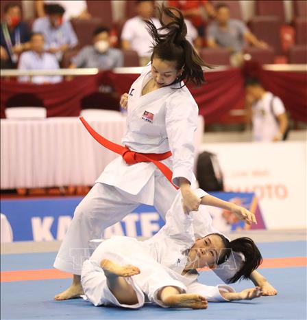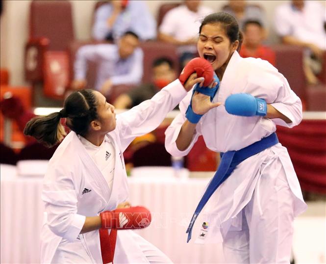 Ngày 19/5/2022, ngày thi đấu thứ hai của môn Karate tại SEA Games 31, các VĐV tiếp tục tranh tài ở nội dung Kata đồng đội nữ và Kumite. Ảnh: Thanh Tùng – TTXVN