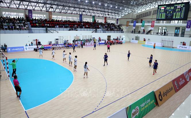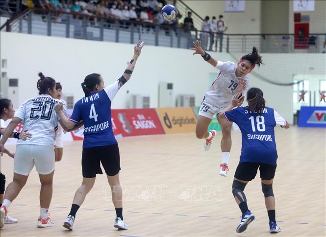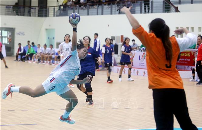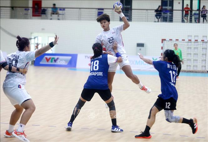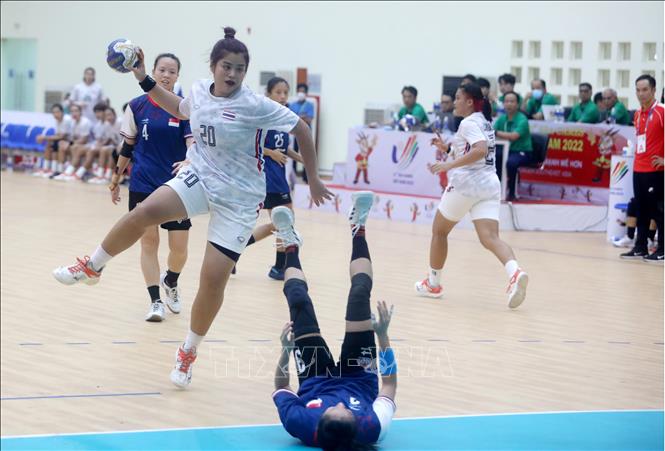 Ngày 20/5/2022, tại Trường Đại học Thể dục Thể thao Bắc Ninh, Đội tuyển bóng ném nữ Thái Lan (áo trắng) thắng Đội tuyển bóng ném nữ Singapore (áo xanh) với tỷ số 36-14 trong trận lượt về môn Bóng ném trong nhà SEA Games 31. Ảnh: Thế Duyệt – TTXVN