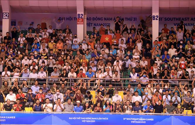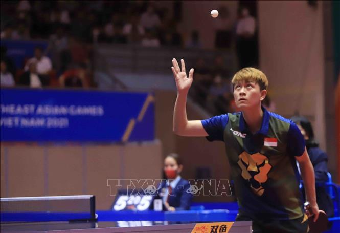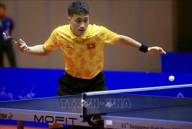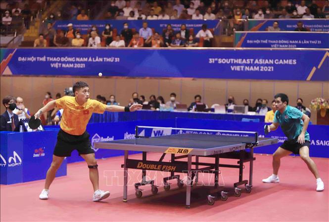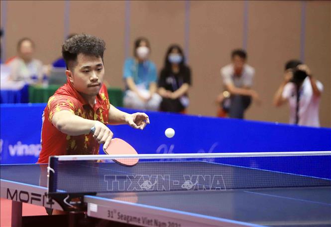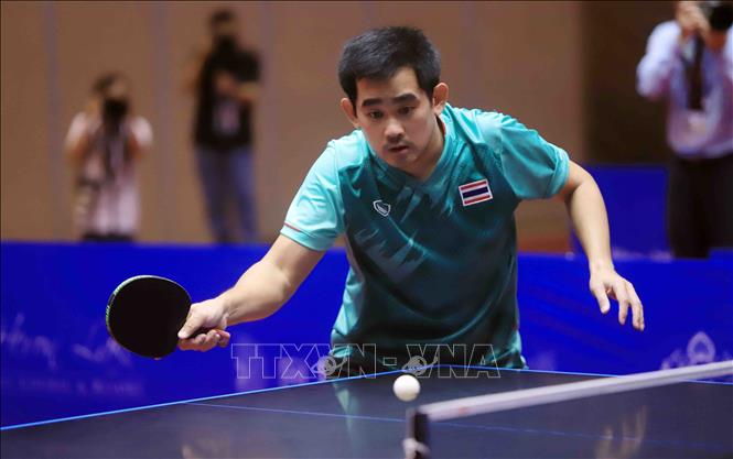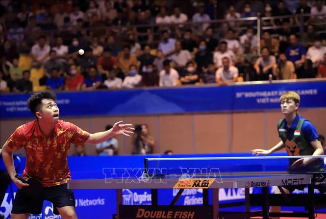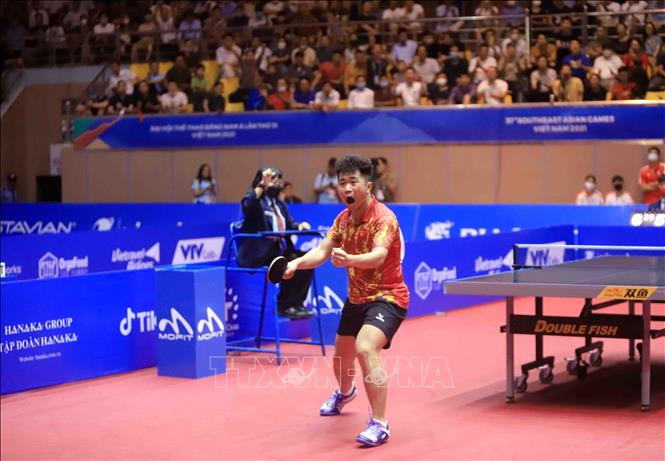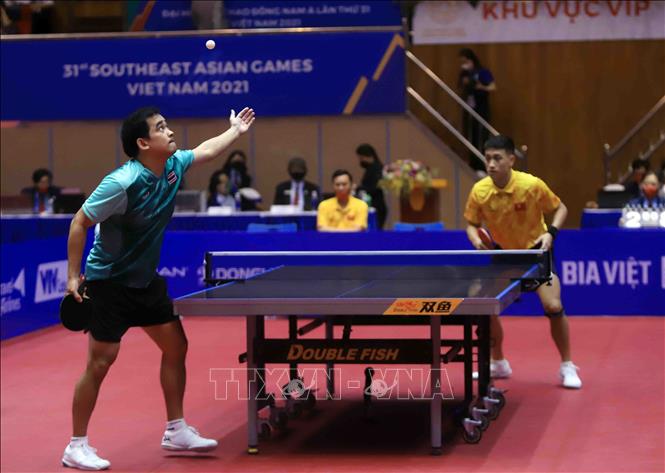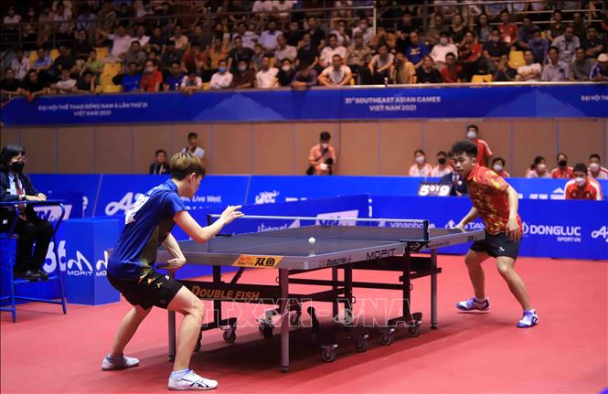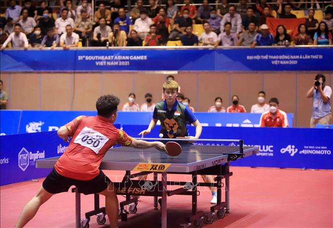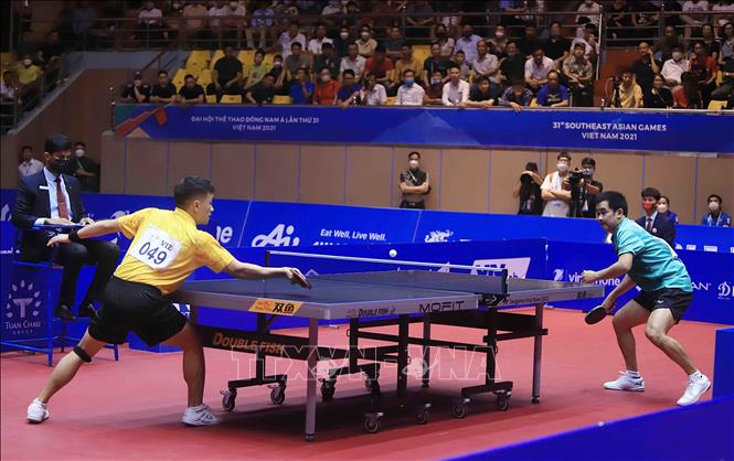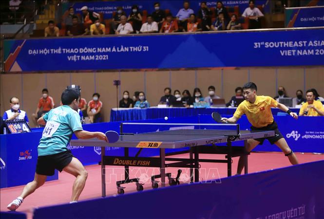 Chiều 20/5/2022, tại Nhà thi đấu Thể dục thể thao tỉnh Hải Dương diễn ra hai trận thi đấu bán kết nội dung đơn nam của môn Bóng bàn tại SEA Games 31. Trận bán kết thứ nhất giữa VĐV Phakpoom Sanguansin (Thái Lan) gặp VĐV Nguyễn Anh Tú (Việt Nam), trận thứ hai giữa VĐV Chew Zhe Yu Clarence (Singapore) gặp VĐV Nguyễn Đức Tuân (Việt Nam). Ảnh: Quý Trung – TTXVN