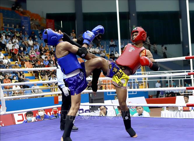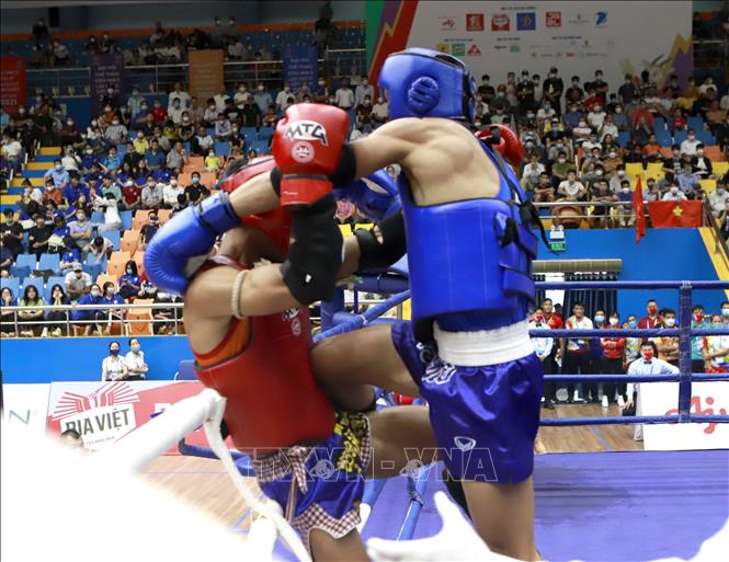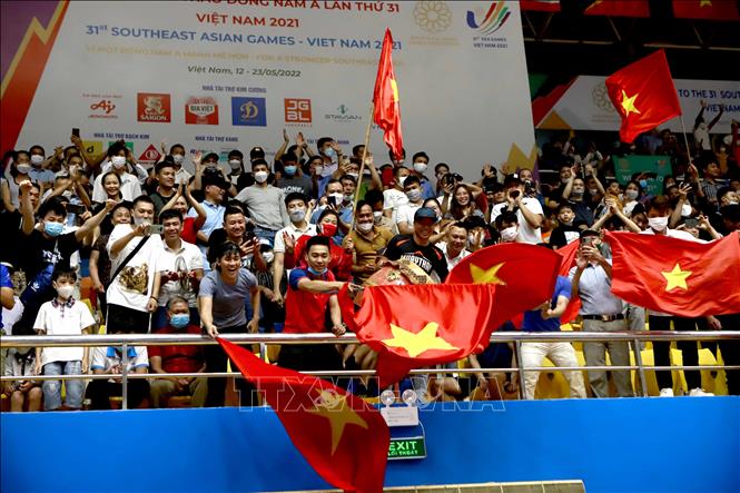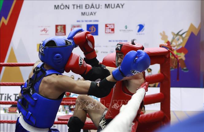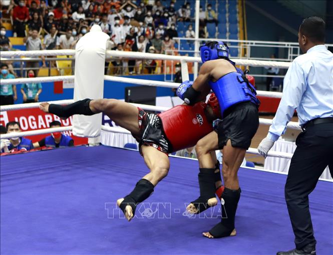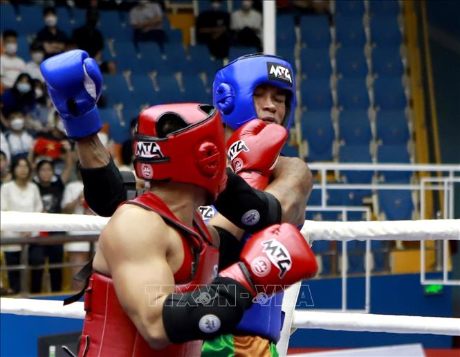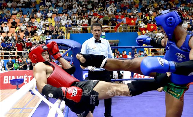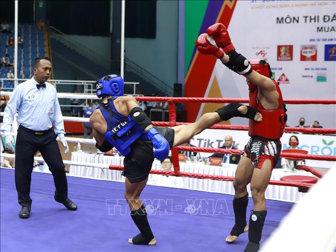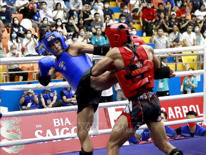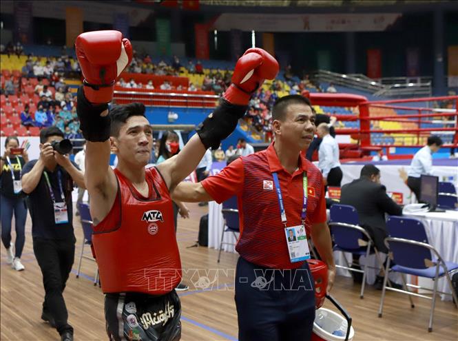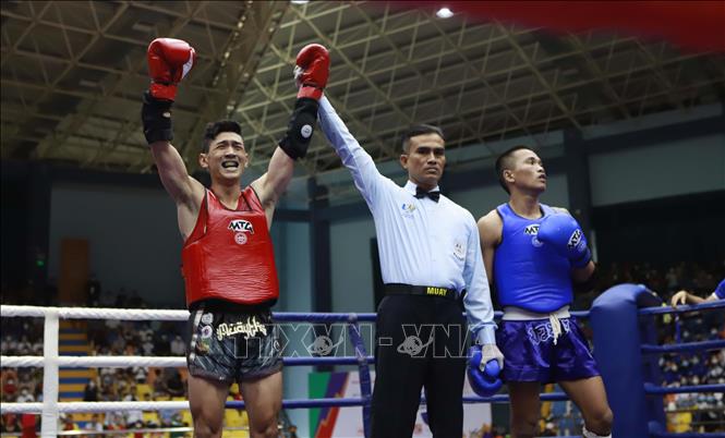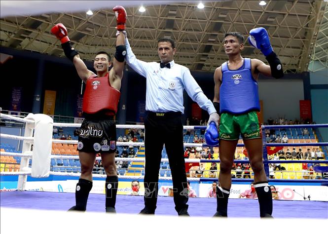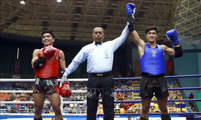 Ngày 20/5/2022, tại Nhà thi đấu tỉnh Vĩnh Phúc tiếp tục diễn ra các nội dung thi đấu đối kháng vòng bán kết môn Muay tại SEA Games 31. Ba VĐV Việt Nam: Nguyễn Trần Duy Nhất (hạng 60 kg), Huỳnh Hoàng Phi (hạng 54kg), Trương Quốc Hùng (hạng 81 kg) đã xuất sắc vượt qua các đối thủ để vào thi đấu trận chung kết. Ảnh: Hoàng Hùng TTXVN