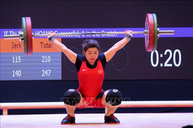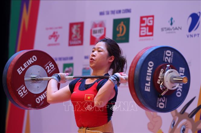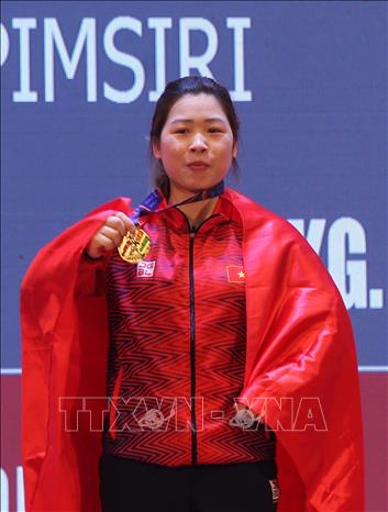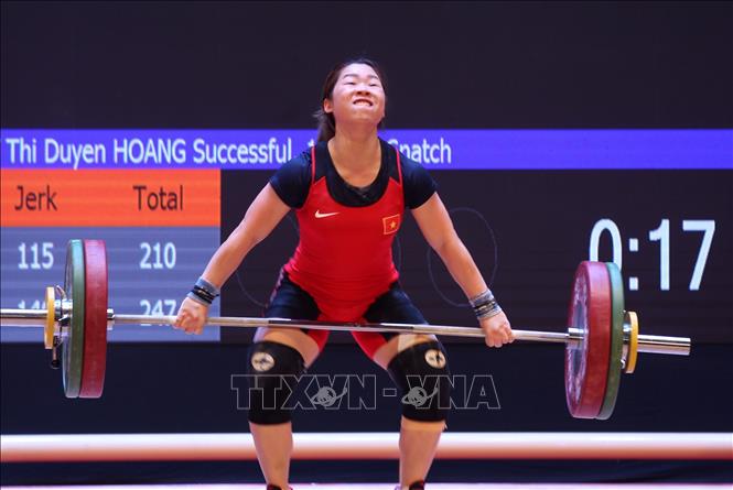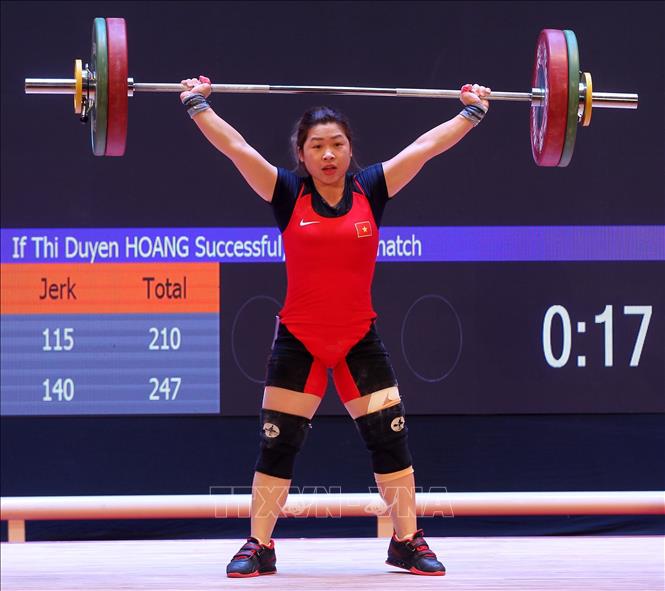 Chiều 20/5/2022 – ngày thi đấu thứ hai của bộ môn Cử tạ ở SEA Games 31, VĐV Hoàng Thị Duyên (dân tộc Giáy) xuất sắc đoạt HCV hạng cân 59 kg nữ với tổng cử là 204 kg. Đặc biệt, Hoàng Thị Duyên đã phá kỷ lục SEA Games ở nội dung cử giật với thành tích 96 kg (Kỷ lục SEA Games cũ là 95 kg do chính cô thiêt lập cách đây 3 năm ở SEA Games 30 tại Philippines). Ảnh: Quốc Khánh-TTXVN
