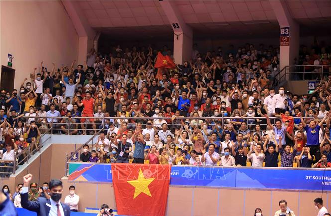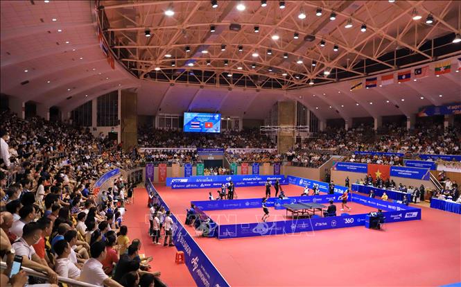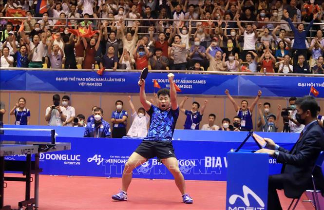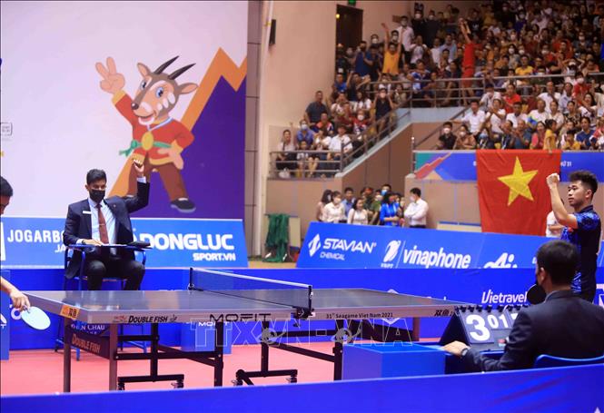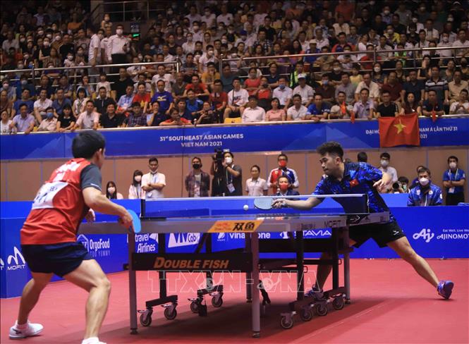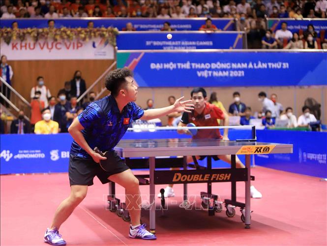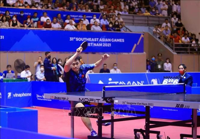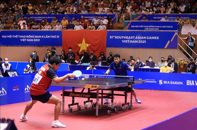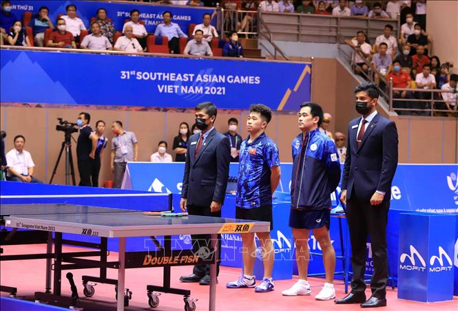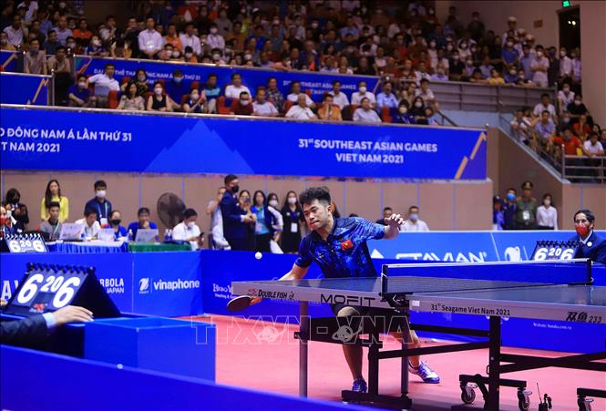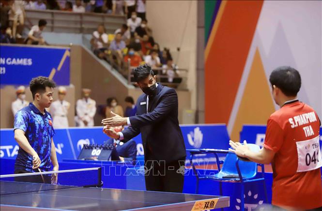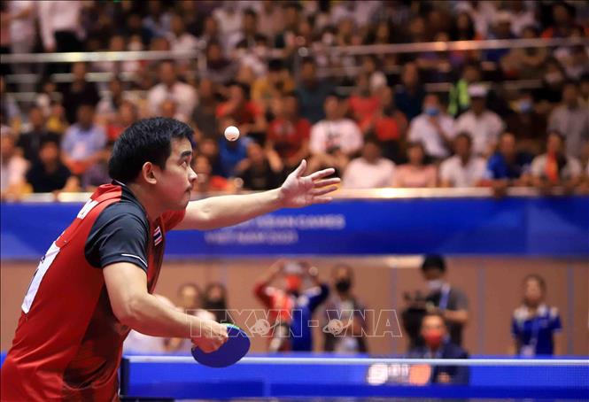 Tối 20/5/2022, tại Nhà thi đấu Thể dục thể thao tỉnh Hải Dương diễn ra trận chung kết nội dung đơn nam của môn Bóng bàn ở SEA Games 31 giữa VĐV Phakpoom Sanguansin (Thái Lan) gặp VĐV Nguyễn Đức Tuân (Việt Nam). Kết thúc trận đấu, VĐV của Việt Nam thắng với tỷ số 4- 1, giành HCV. Ảnh: Quý Trung – TTXVN