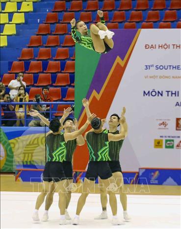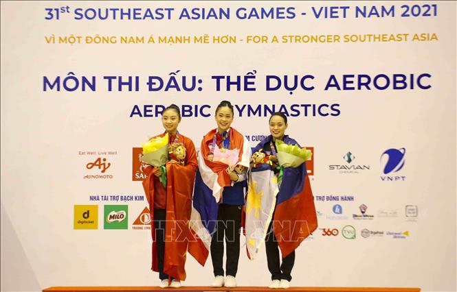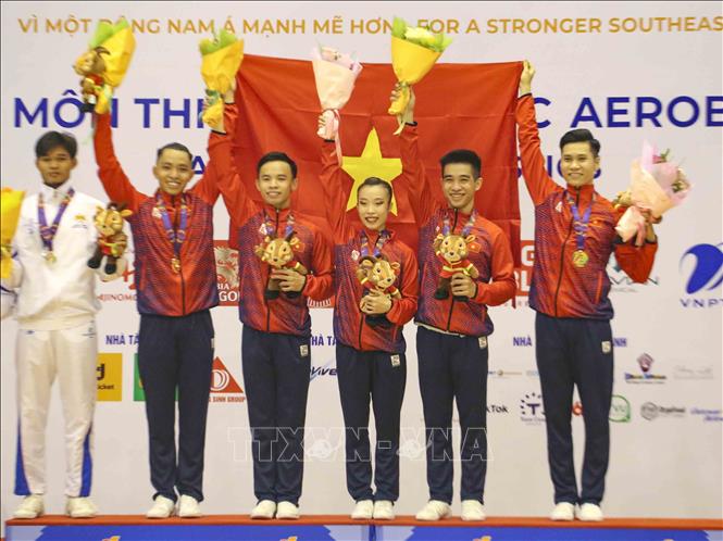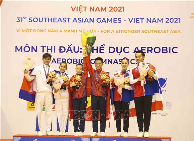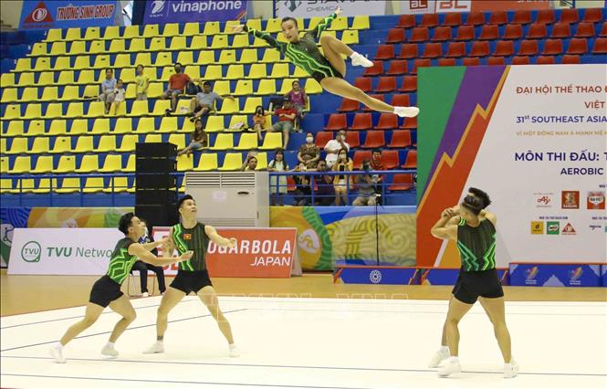 Ngày 22/5/2022, tại Cung thể thao Quần Ngựa (Hà Nội), môn Aerobic tại SEA Games 31 thi đấu các nội dung: Đơn nữ, đôi nam-nữ, nhóm 5 người. Kết quả, đội Aerobic Việt Nam giành HCV nội dung nhóm 5 người; 2 VĐV Lê Hoàng Phong và Trần Ngọc Thúy Vi giành HCV nội dung đôi nam-nữ; Trần Hà Vi giành HCB nội dung đơn nữ. Ảnh: TTXVN