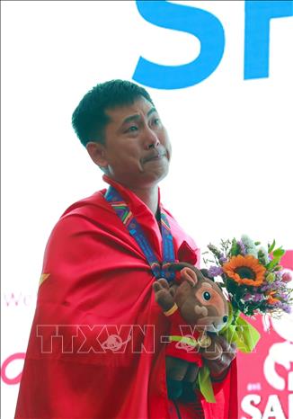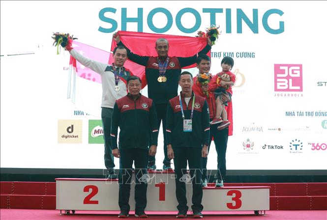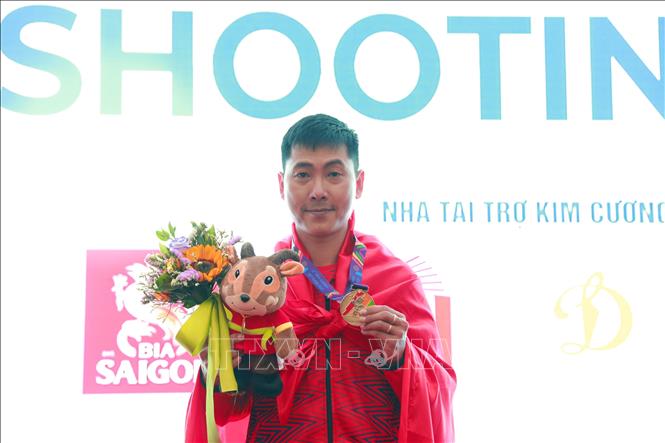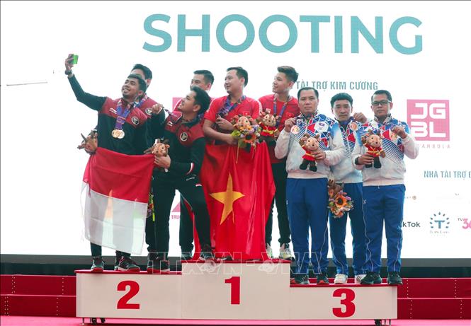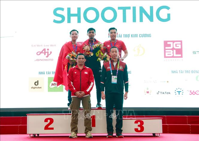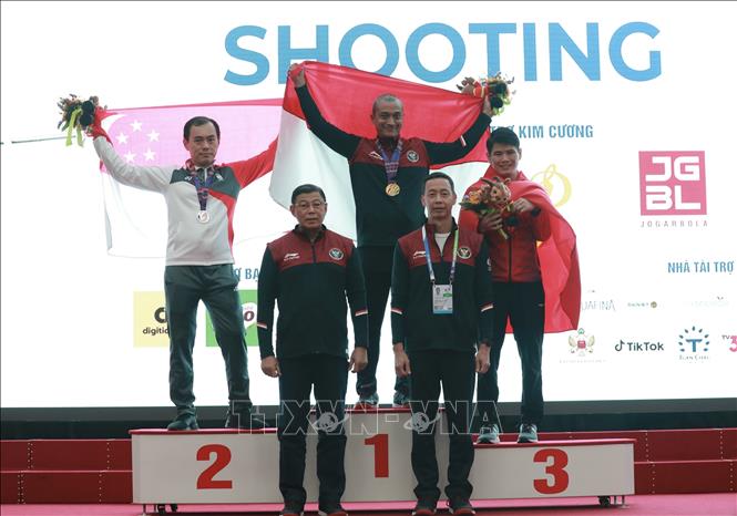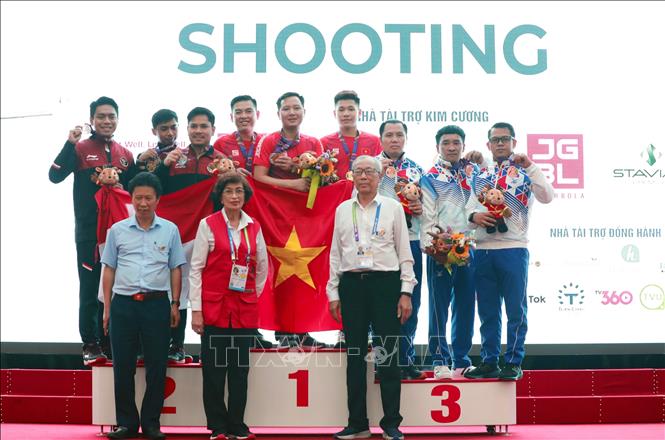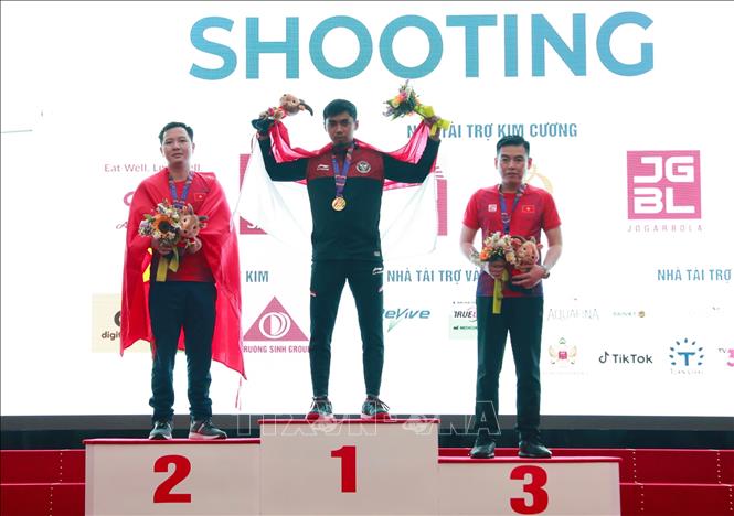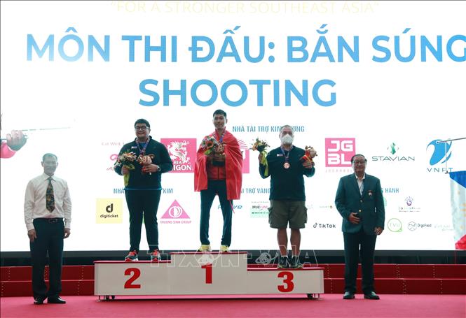 Chiều 22/5/2022, tại Trung tâm Huấn luyện thể thao Quốc gia Hà Nội, Ban tổ chức trao huy chương cho các VĐV đạt thành tích các nội dung 25m súng ngắn tiêu chuẩn nam, 10m súng trường di động tiêu chuẩn nam, Trap nam ở môn Bắn súng tại SEA Games 31. Ảnh: Hoàng Hiếu - TTXVN